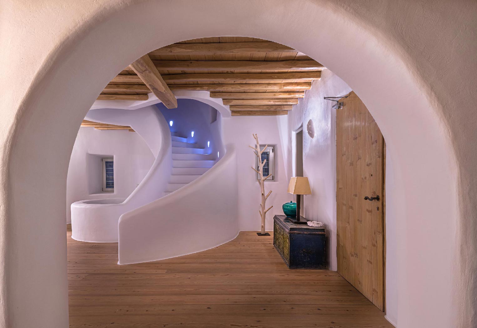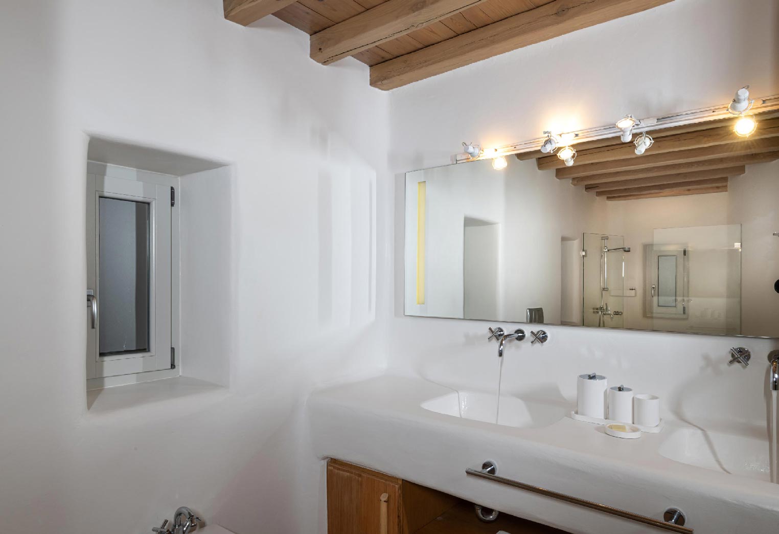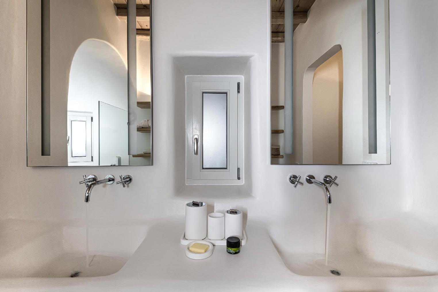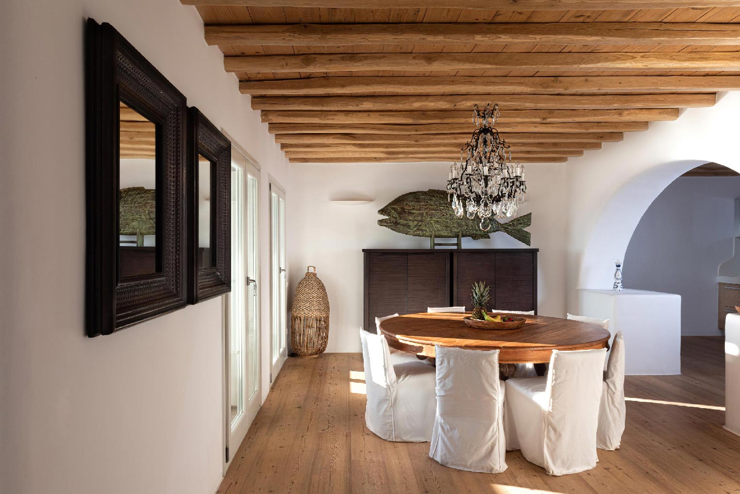 Nestled in idyllic Tourlos, above the port of Mykonos and just a five-minute drive from Mykonos Town, Villa Gaias is a private luxury estate surrounded by the island’s cosmopolitan vibes, world-famous restaurants, and vibrant social life.The villa’s unique style epitomizes the traditional Cycladic architecture complemented with modern touches, creating a cozy and laid-back luxury retreat. The villa opens into ample bright spaces with all-white walls, wooden floors and ceilings, large windows with stunning vistas, exquisite décor, and state-of-the-art furniture — the perfect place to withdraw and relax after a full day exploring Mykonos’ treasures.