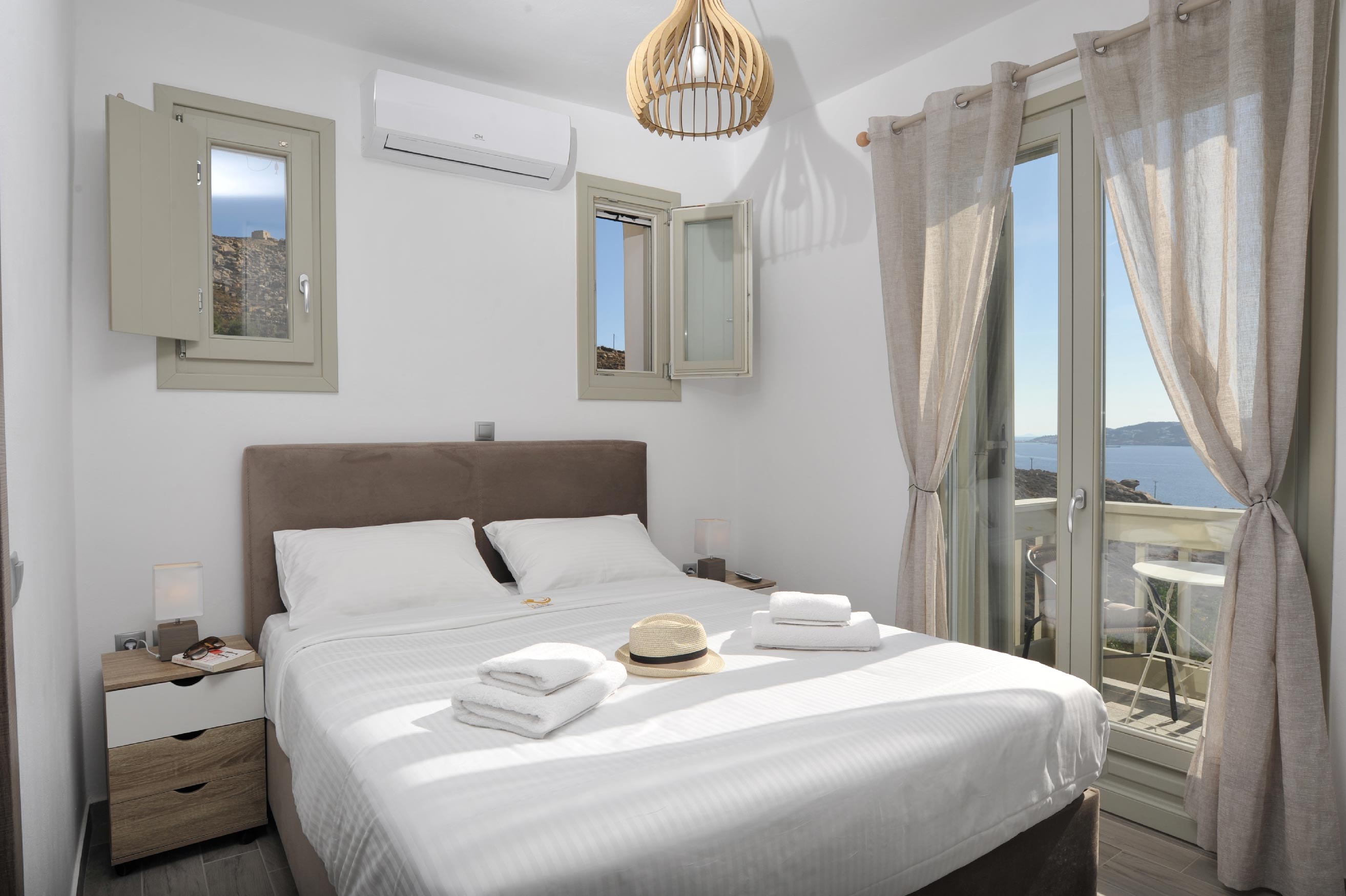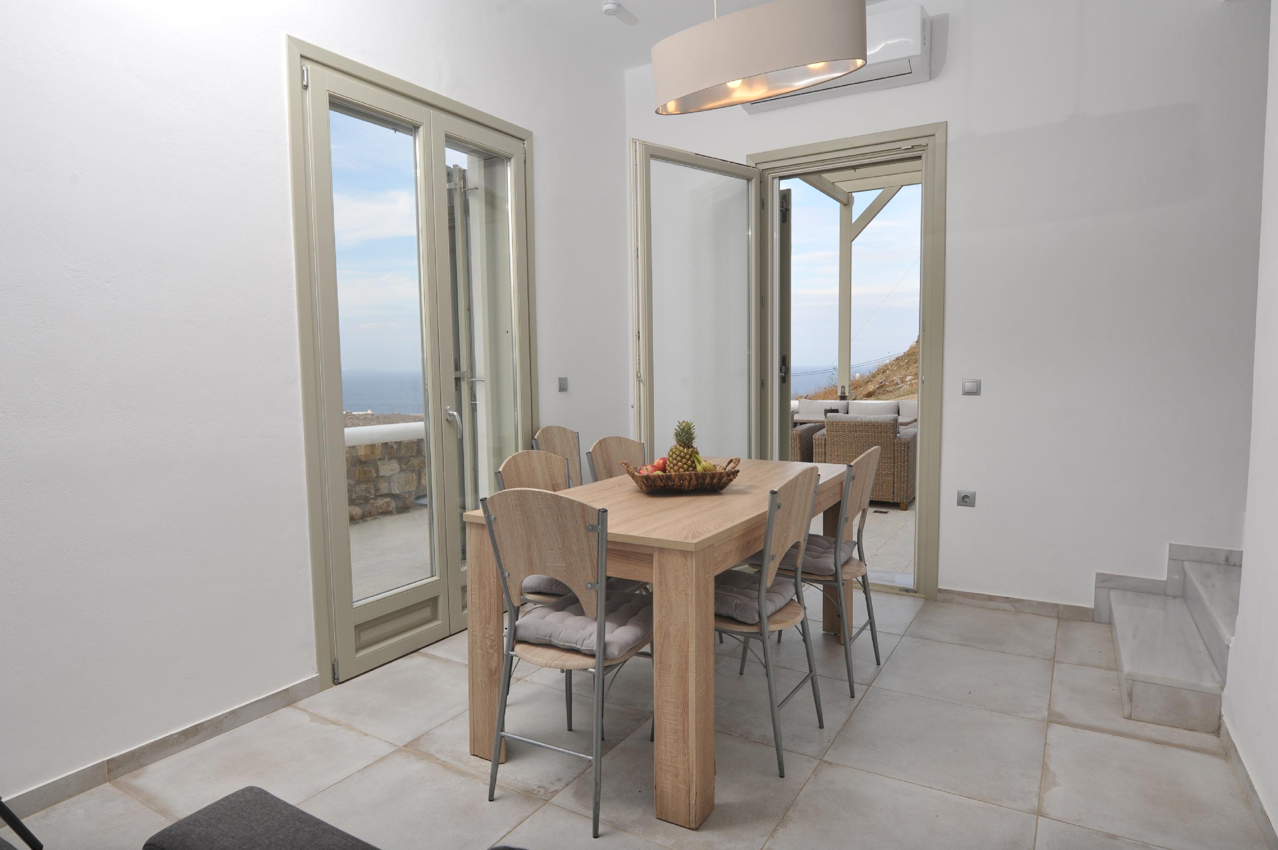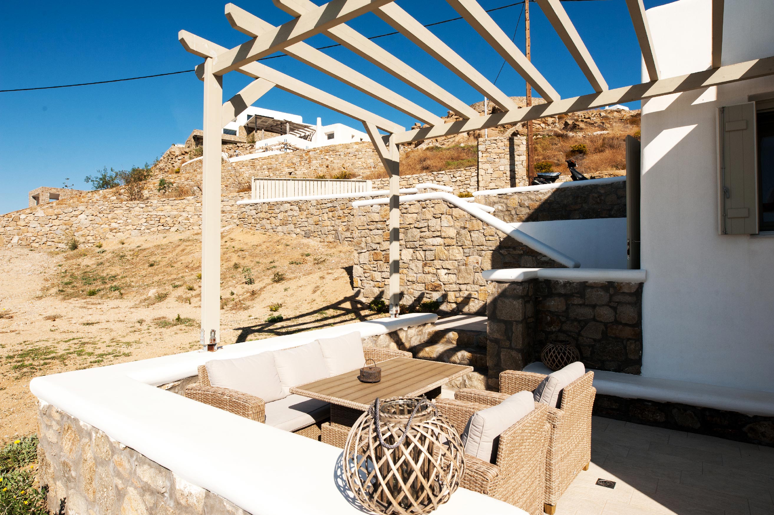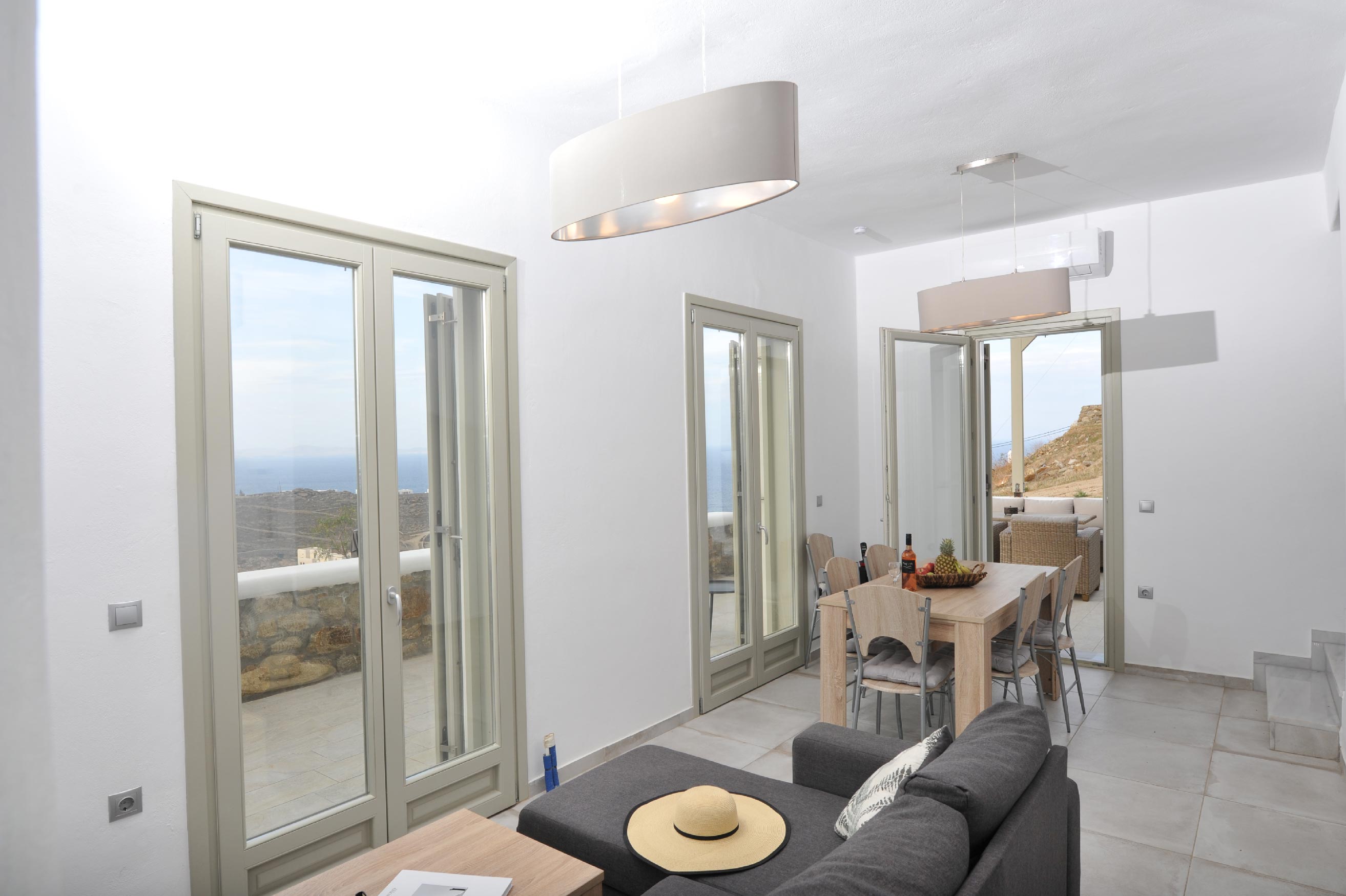 Welcome to villa Gratia, your luxurious 115 m2 villa perched on a hillside overlooking the picturesque Houlakia bay in Mykonos. This newly built retreat (2019) offers the perfect blend of proximity to Mykonos town (just 4.9 km away) and tranquility away from the hustle and bustle. With stunning views of the Aegean Sea and neighboring islands Syros and Rhenia, Peace boasts three bedrooms, each with its own bathroom featuring rain showers and private balconies to soak in the mesmerizing vistas. The upper level bedrooms provide a serene escape, while the lower level offers a cozy living room with a convertible sofa bed, a dining area, and a fully-equipped kitchen.