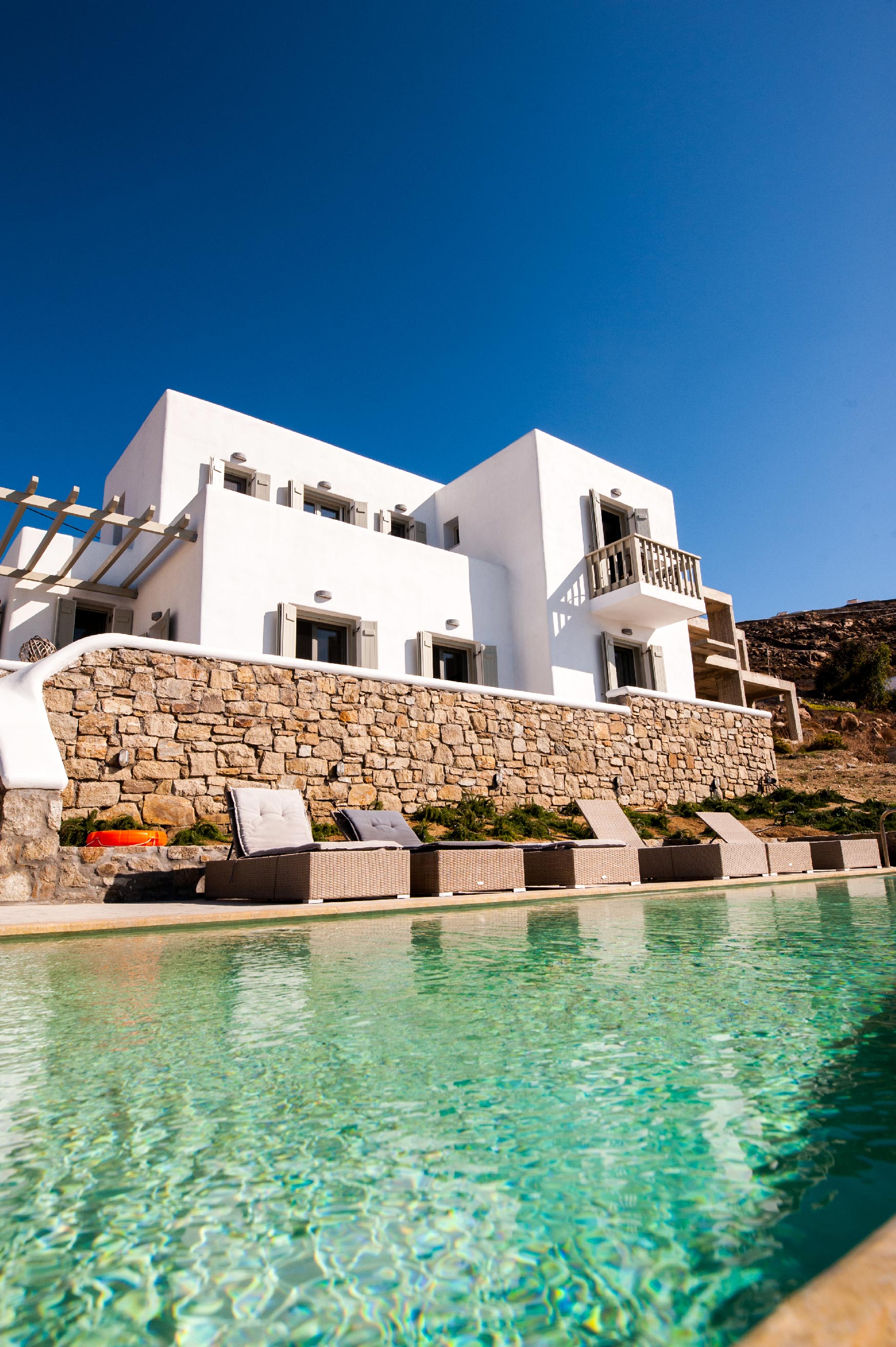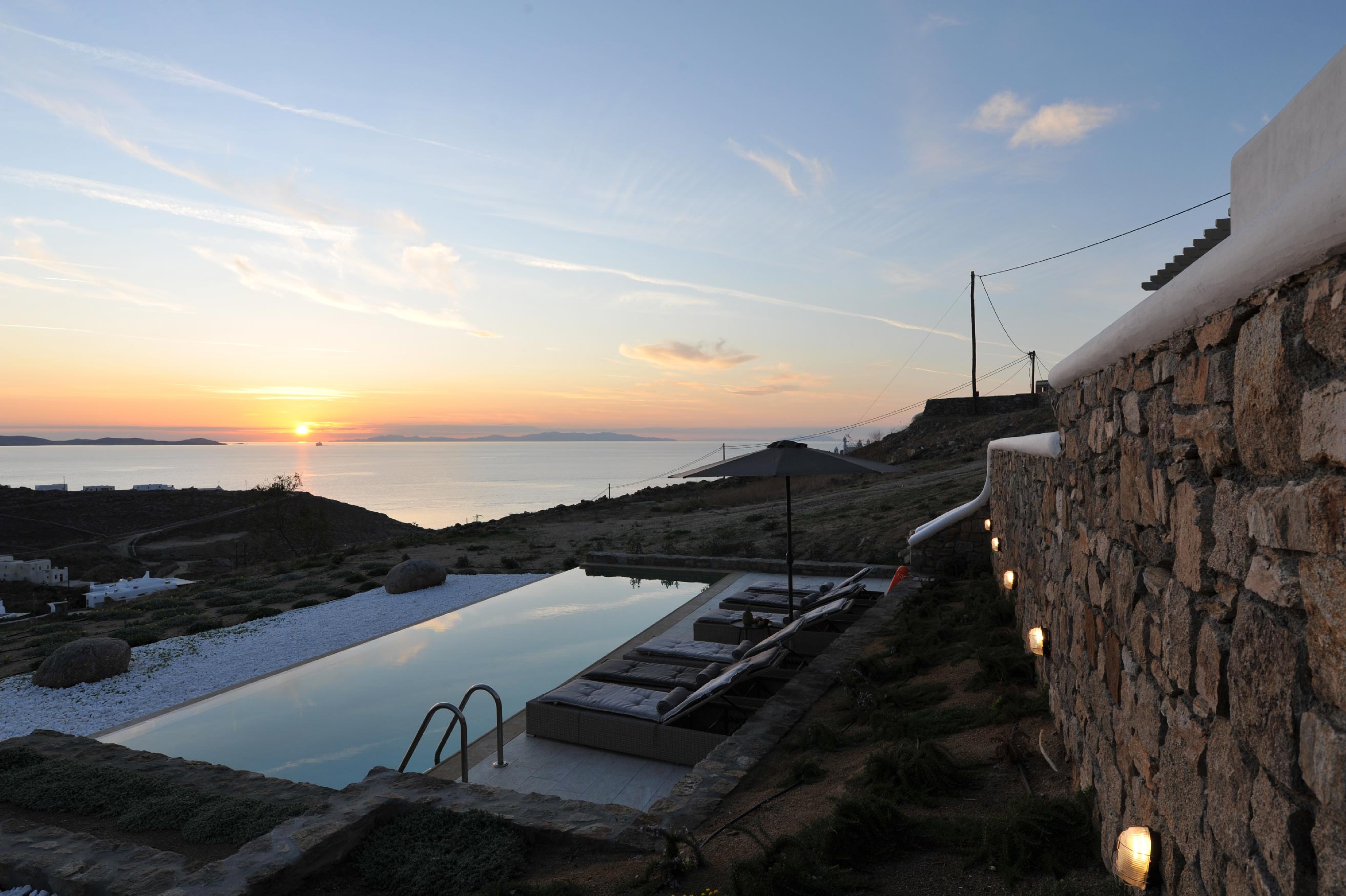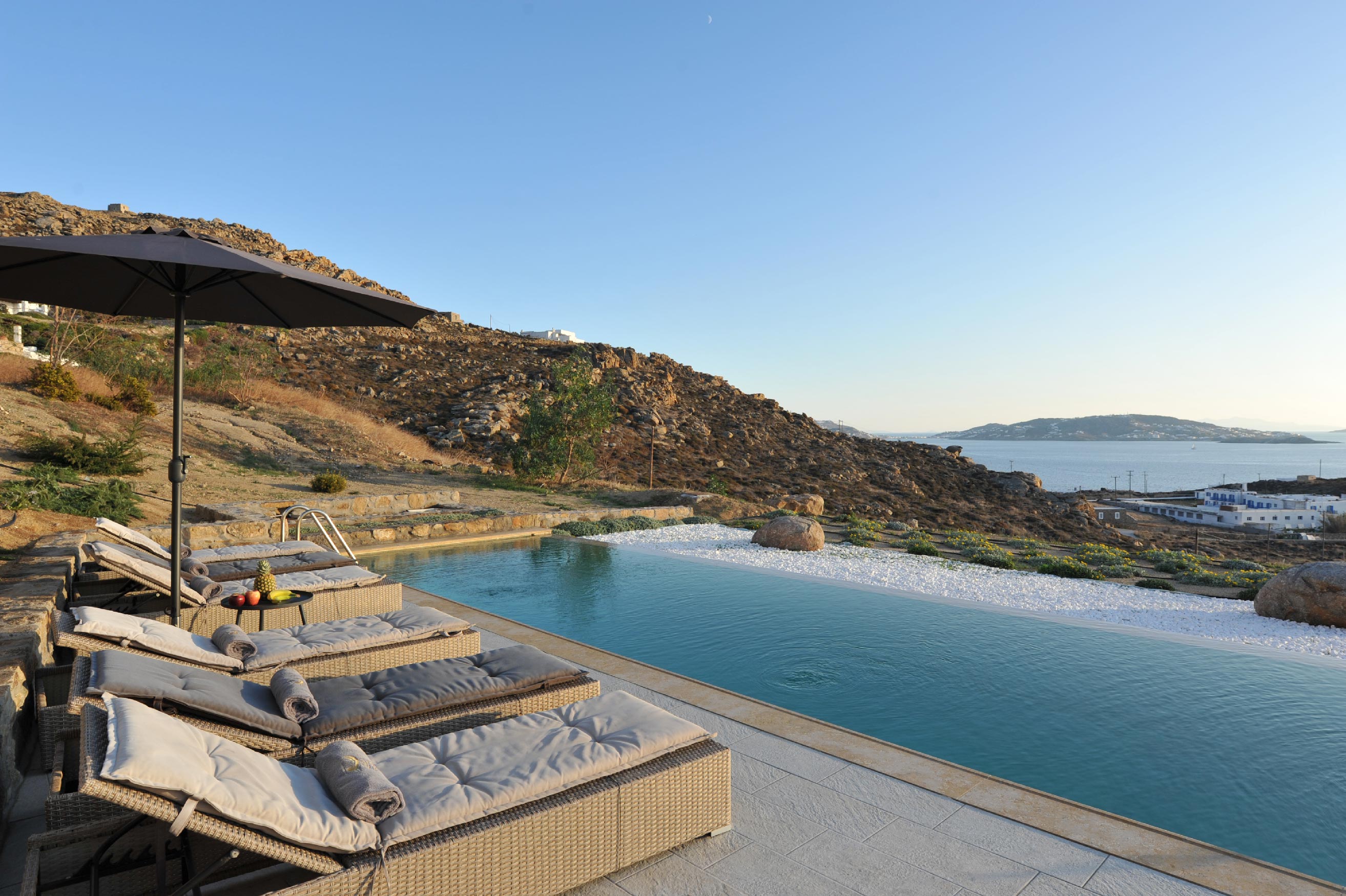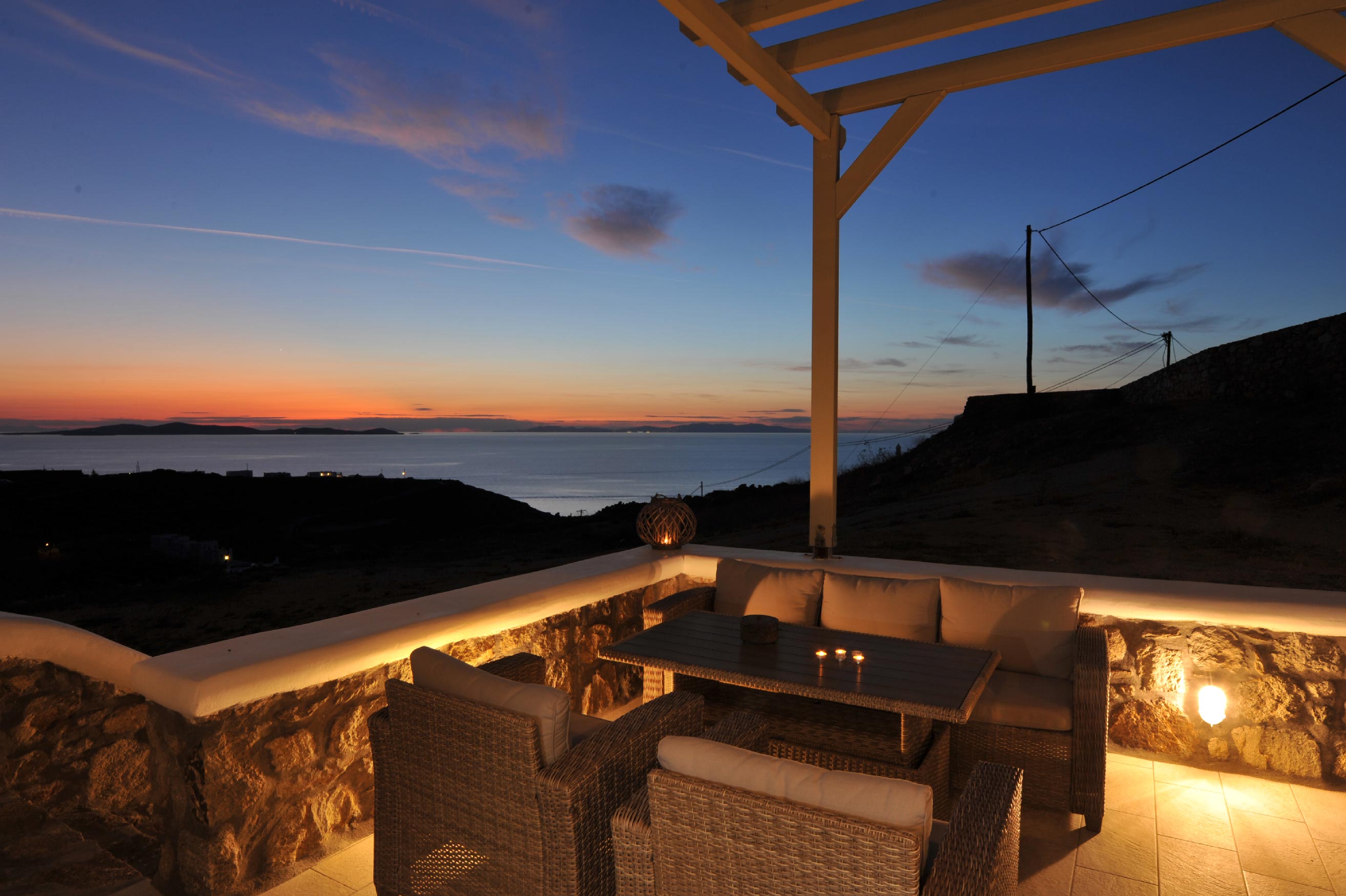 Welcome to villa Gratia, your luxurious 115 m2 villa perched on a hillside overlooking the picturesque Houlakia bay in Mykonos. This newly built retreat (2019) offers the perfect blend of proximity to Mykonos town (just 4.9 km away) and tranquility away from the hustle and bustle. With stunning views of the Aegean Sea and neighboring islands Syros and Rhenia, Peace boasts three bedrooms, each with its own bathroom featuring rain showers and private balconies to soak in the mesmerizing vistas. The upper level bedrooms provide a serene escape, while the lower level offers a cozy living room with a convertible sofa bed, a dining area, and a fully-equipped kitchen.