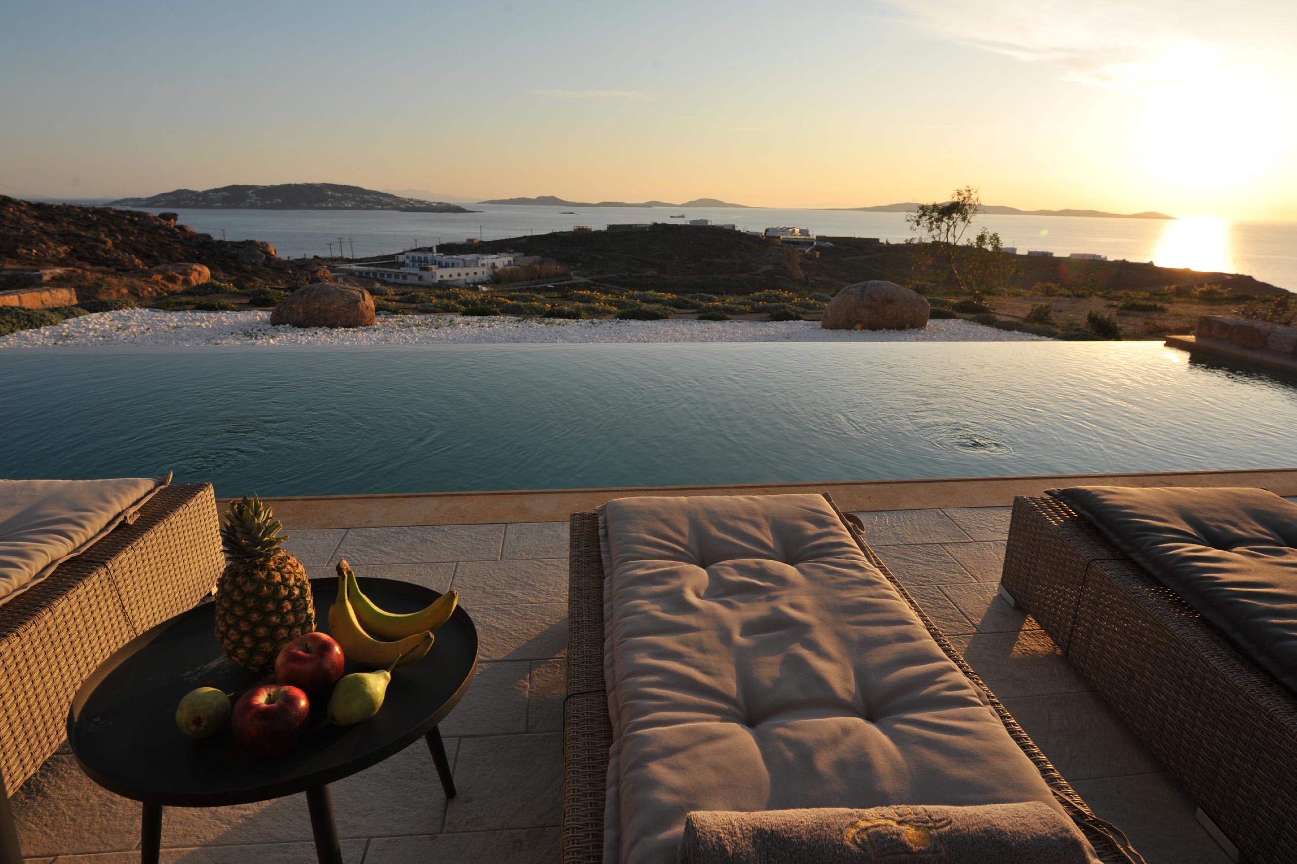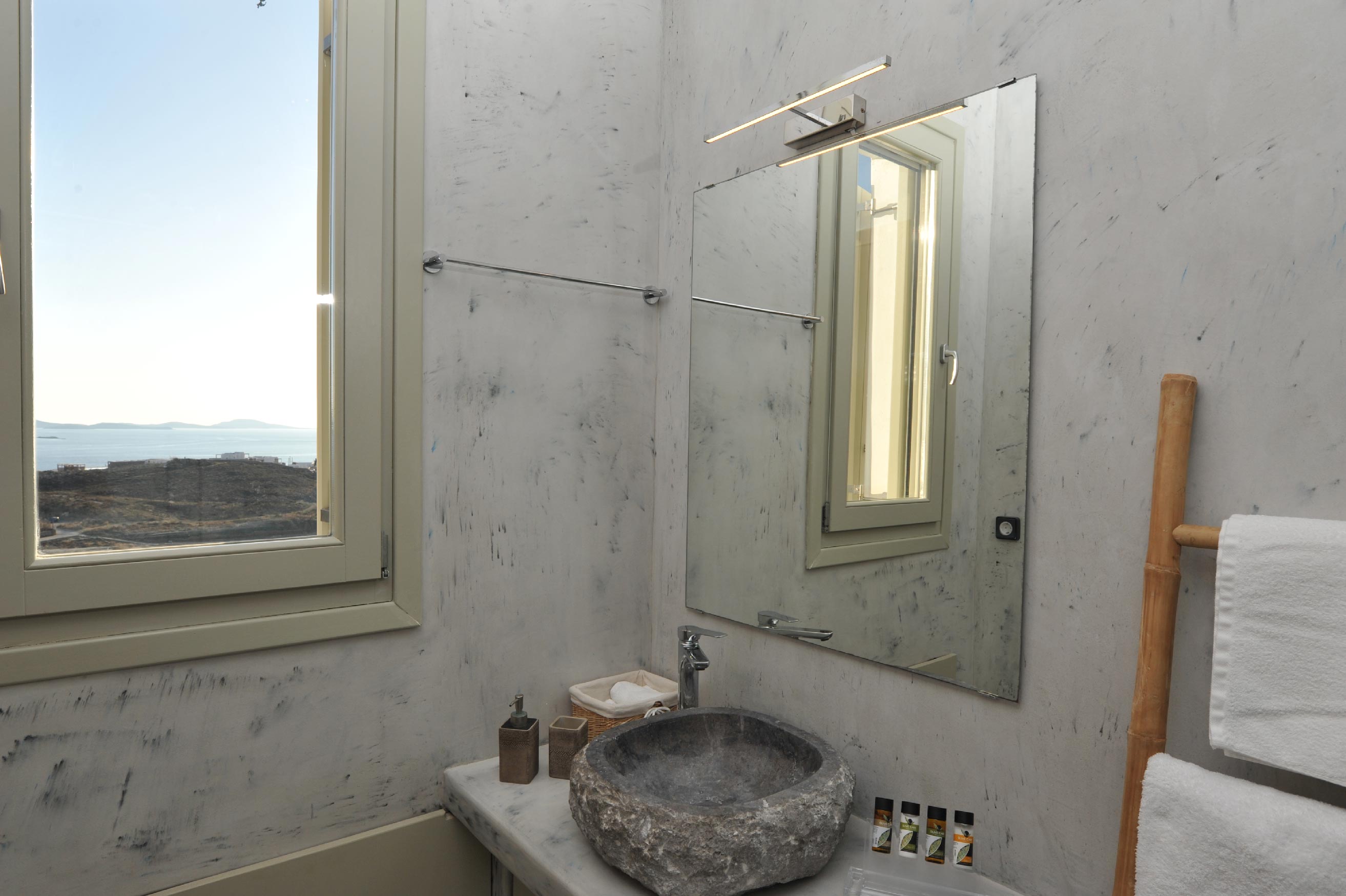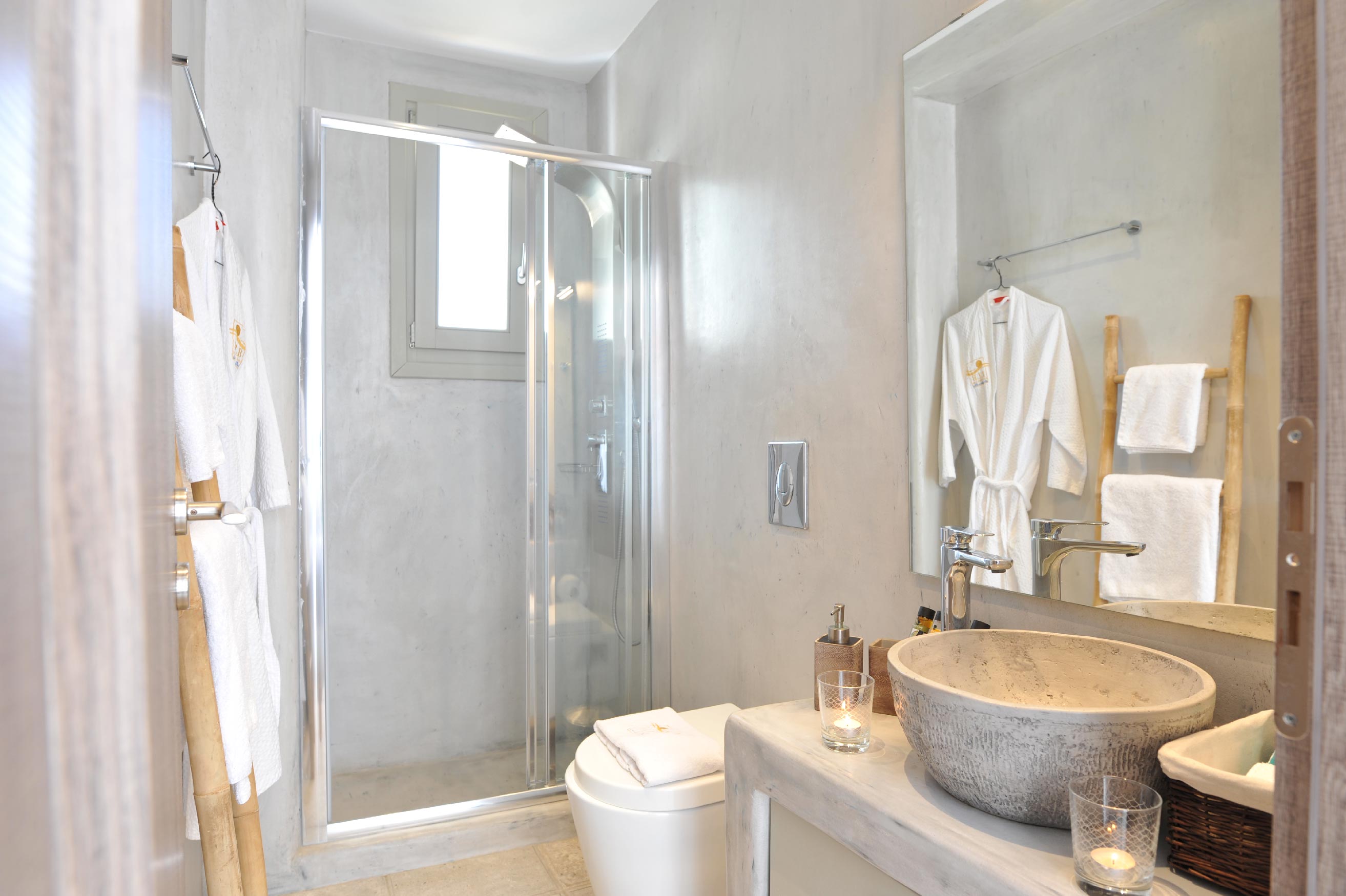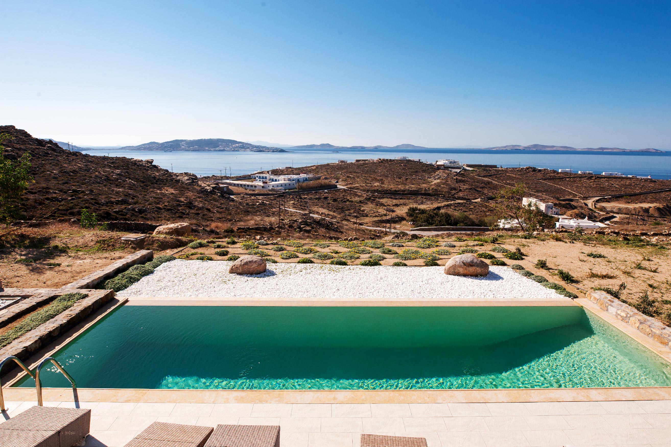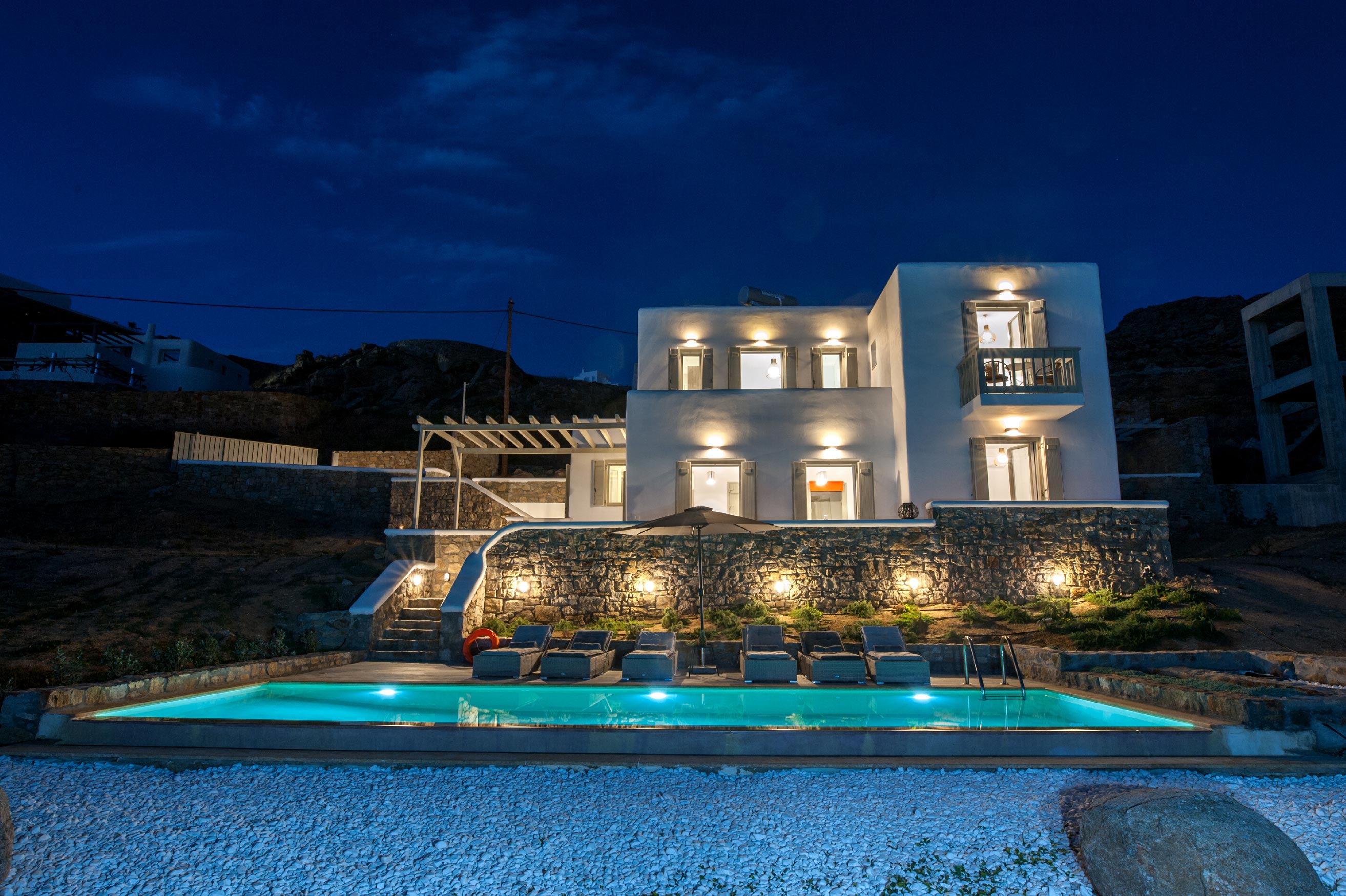 Welcome to villa Gratia, your luxurious 115 m2 villa perched on a hillside overlooking the picturesque Houlakia bay in Mykonos. This newly built retreat (2019) offers the perfect blend of proximity to Mykonos town (just 4.9 km away) and tranquility away from the hustle and bustle. With stunning views of the Aegean Sea and neighboring islands Syros and Rhenia, Peace boasts three bedrooms, each with its own bathroom featuring rain showers and private balconies to soak in the mesmerizing vistas. The upper level bedrooms provide a serene escape, while the lower level offers a cozy living room with a convertible sofa bed, a dining area, and a fully-equipped kitchen.