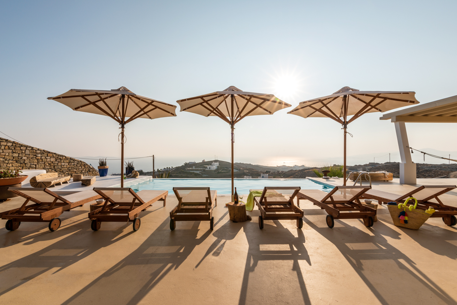 Its amazing view from the outdoor sitting areas where one can relax and enjoy a view of Delos, Tinos, Syros and the magic hour of one of the most enchanting sunsets.