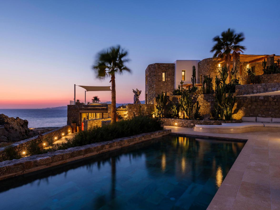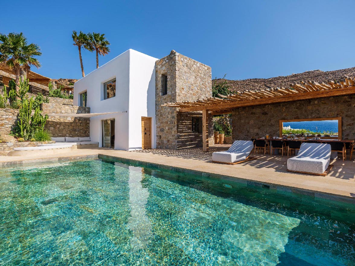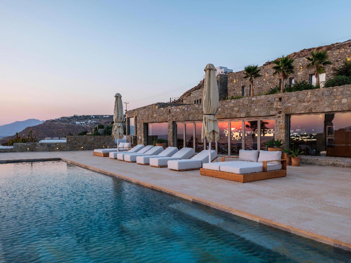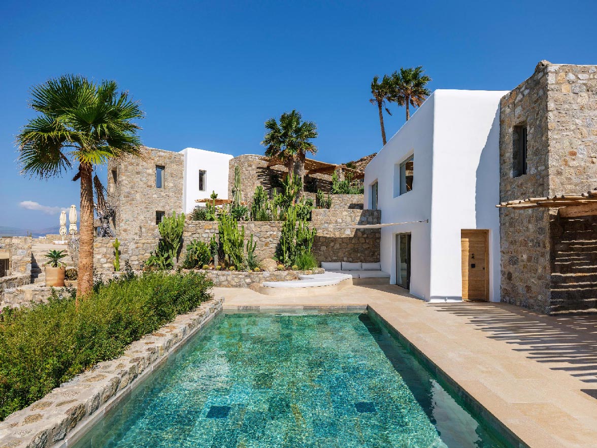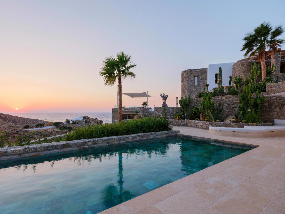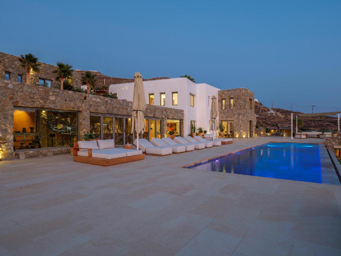Irida boasts an exclusive perch with breathtaking views of Chouloukas Beach on the captivating Mykonos Island. This architecturally striking stone villa blends contemporary elegance with lavish amenities, ensuring an unforgettable experience for all who choose to stay. Take pleasure in the sweeping sunset and captivating Aegean scenery that graces this extraordinary property. The Villa presents an architectural design characterized by its contemporary and stylish aesthetics. It features three captivating swimming pools, elegantly framed by opulent sun loungers, providing a breathtaking setting for memorable sunset vistas. Enhancing its allure, an outdoor dining area is discreetly nestled beneath a protective pergola, complemented by a meticulously crafted stone barbecue, ensuring a delightful experience of al fresco dining beneath the starlit night sky