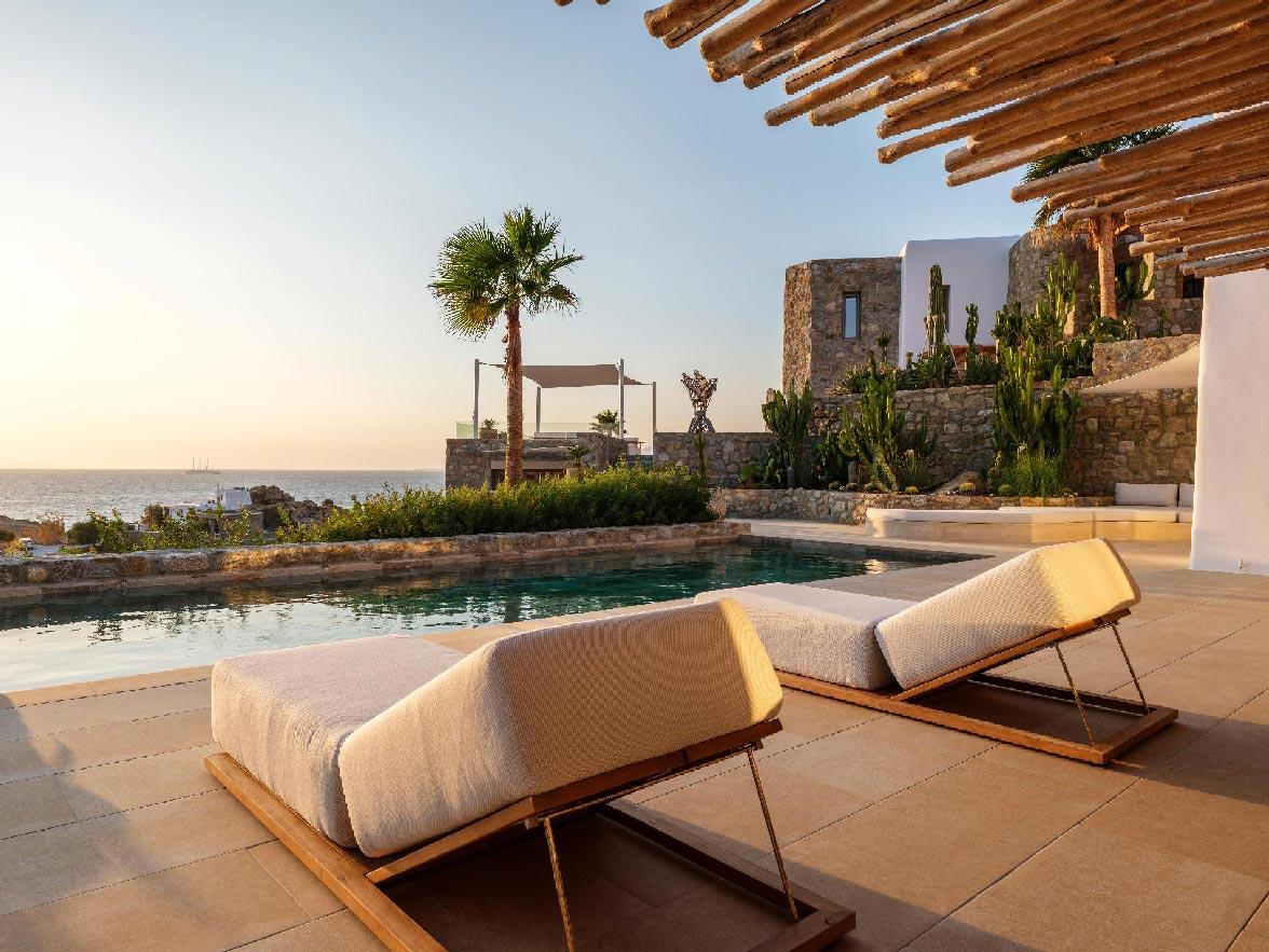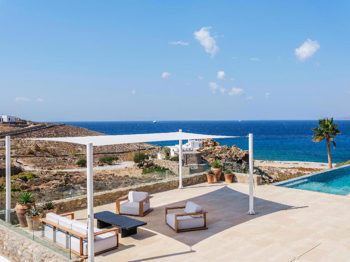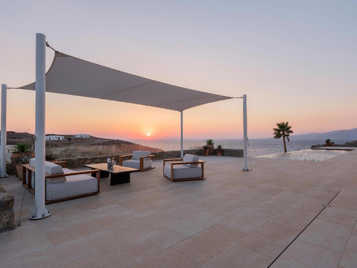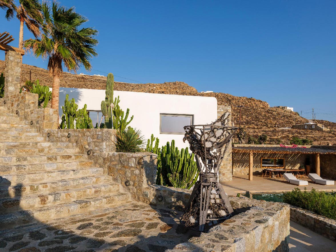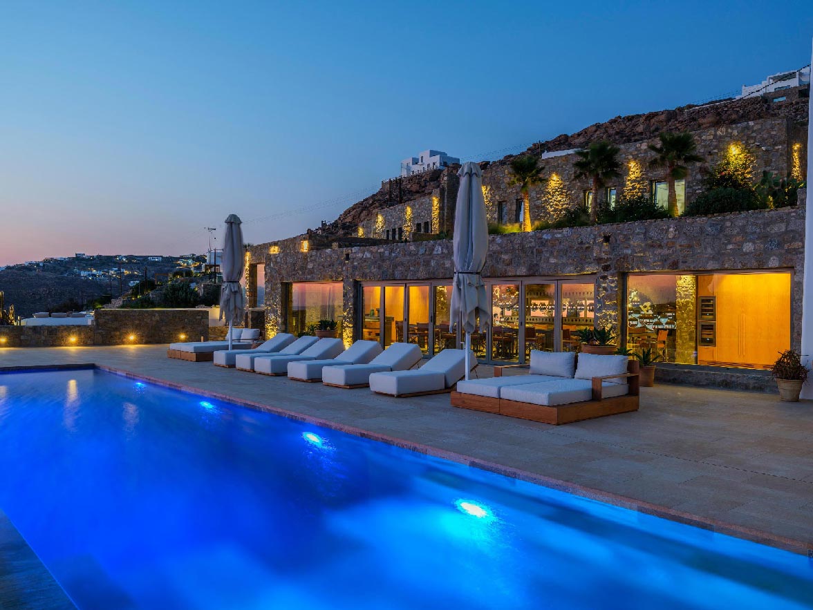 Irida boasts an exclusive perch with breathtaking views of Chouloukas Beach on the captivating Mykonos Island. This architecturally striking stone villa blends contemporary elegance with lavish amenities, ensuring an unforgettable experience for all who choose to stay. Take pleasure in the sweeping sunset and captivating Aegean scenery that graces this extraordinary property. The Villa presents an architectural design characterized by its contemporary and stylish aesthetics. It features three captivating swimming pools, elegantly framed by opulent sun loungers, providing a breathtaking setting for memorable sunset vistas. Enhancing its allure, an outdoor dining area is discreetly nestled beneath a protective pergola, complemented by a meticulously crafted stone barbecue, ensuring a delightful experience of al fresco dining beneath the starlit night sky