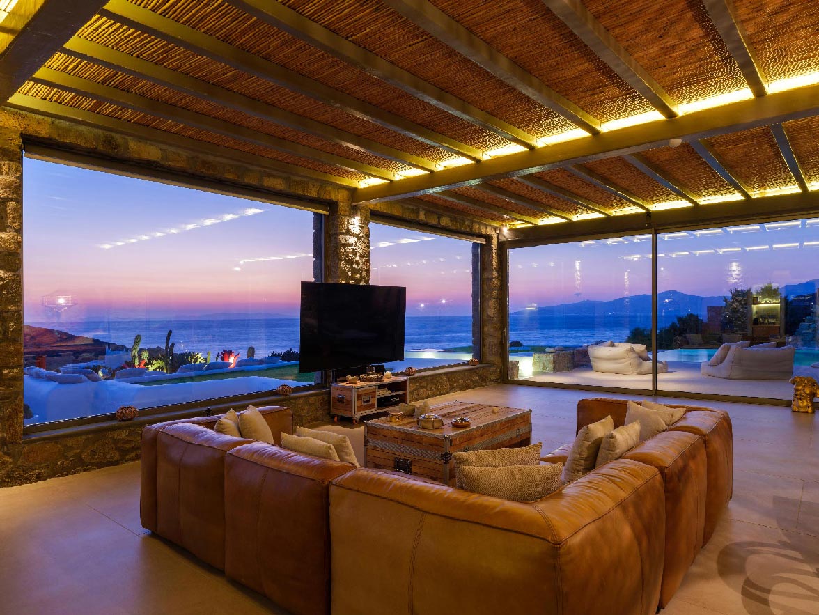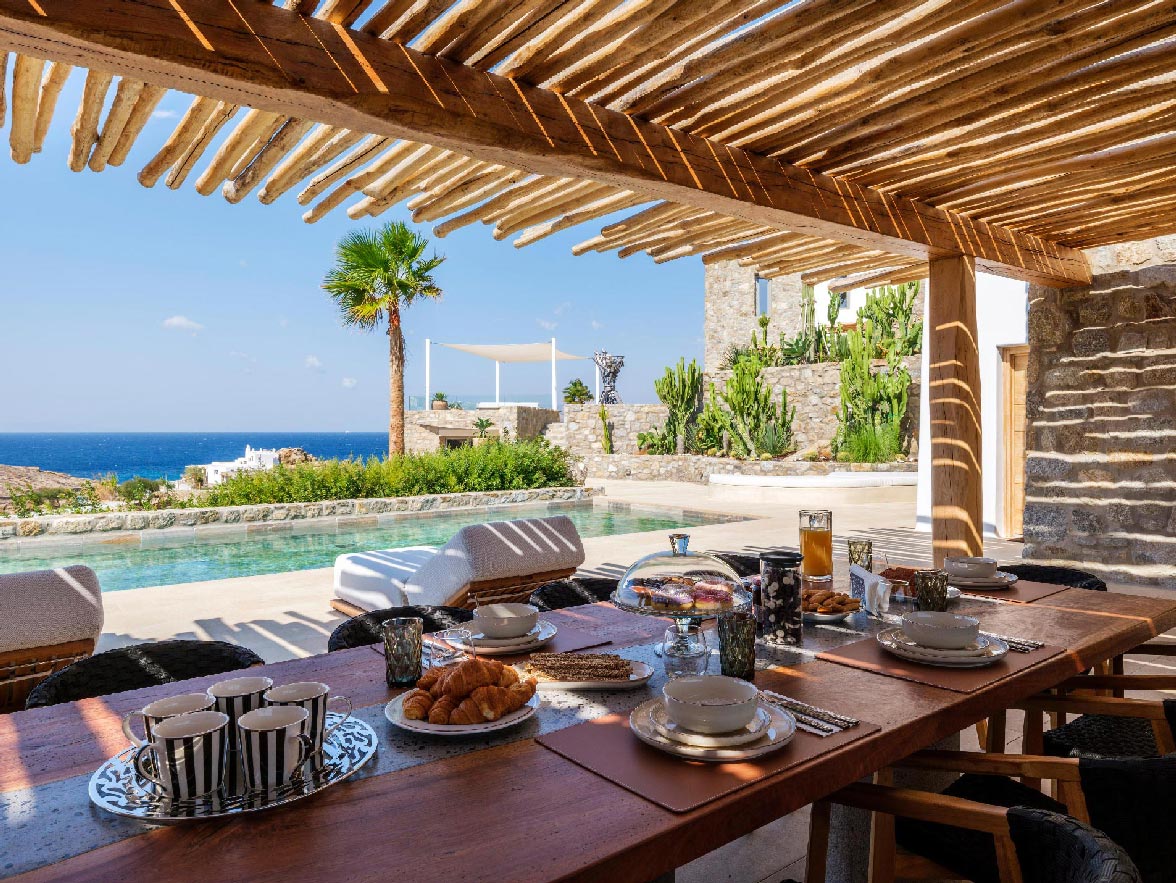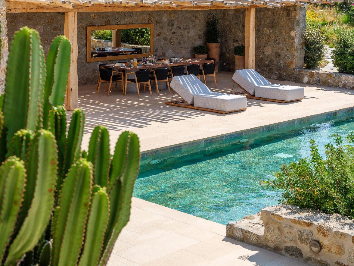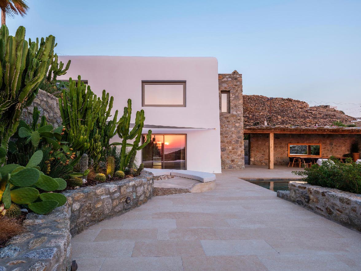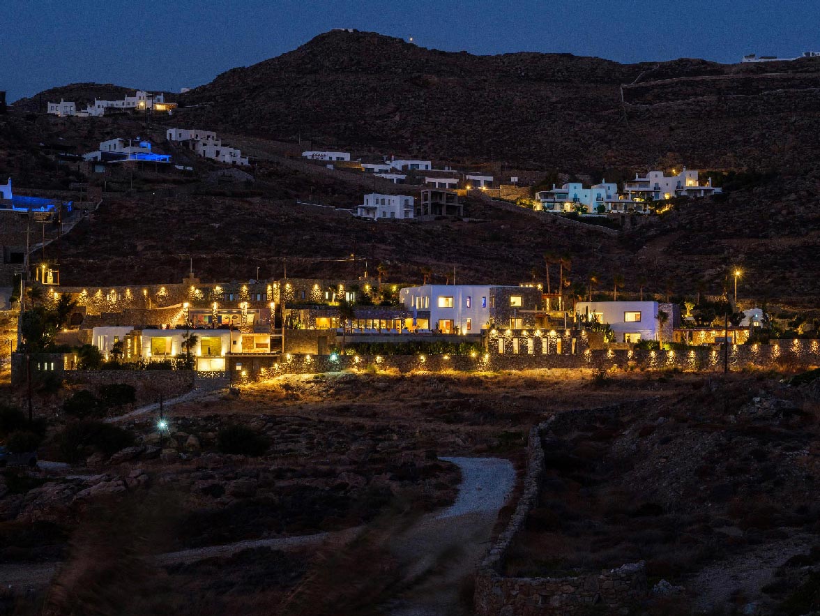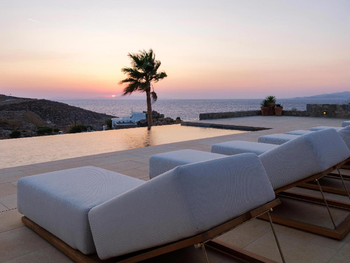 Irida boasts an exclusive perch with breathtaking views of Chouloukas Beach on the captivating Mykonos Island. This architecturally striking stone villa blends contemporary elegance with lavish amenities, ensuring an unforgettable experience for all who choose to stay. Take pleasure in the sweeping sunset and captivating Aegean scenery that graces this extraordinary property. The Villa presents an architectural design characterized by its contemporary and stylish aesthetics. It features three captivating swimming pools, elegantly framed by opulent sun loungers, providing a breathtaking setting for memorable sunset vistas. Enhancing its allure, an outdoor dining area is discreetly nestled beneath a protective pergola, complemented by a meticulously crafted stone barbecue, ensuring a delightful experience of al fresco dining beneath the starlit night sky