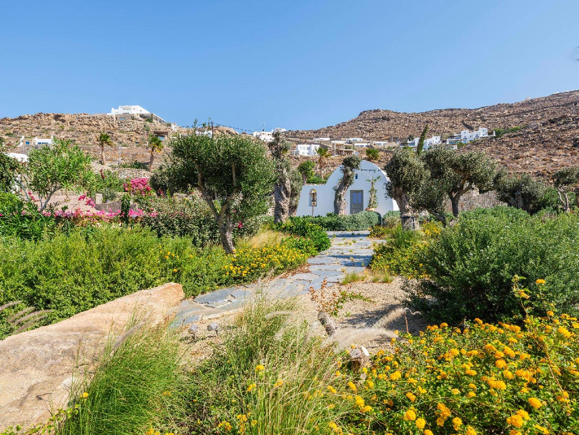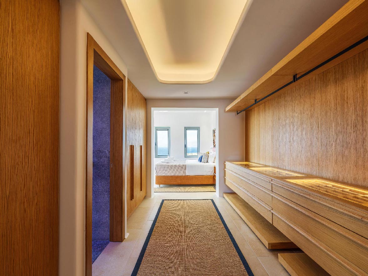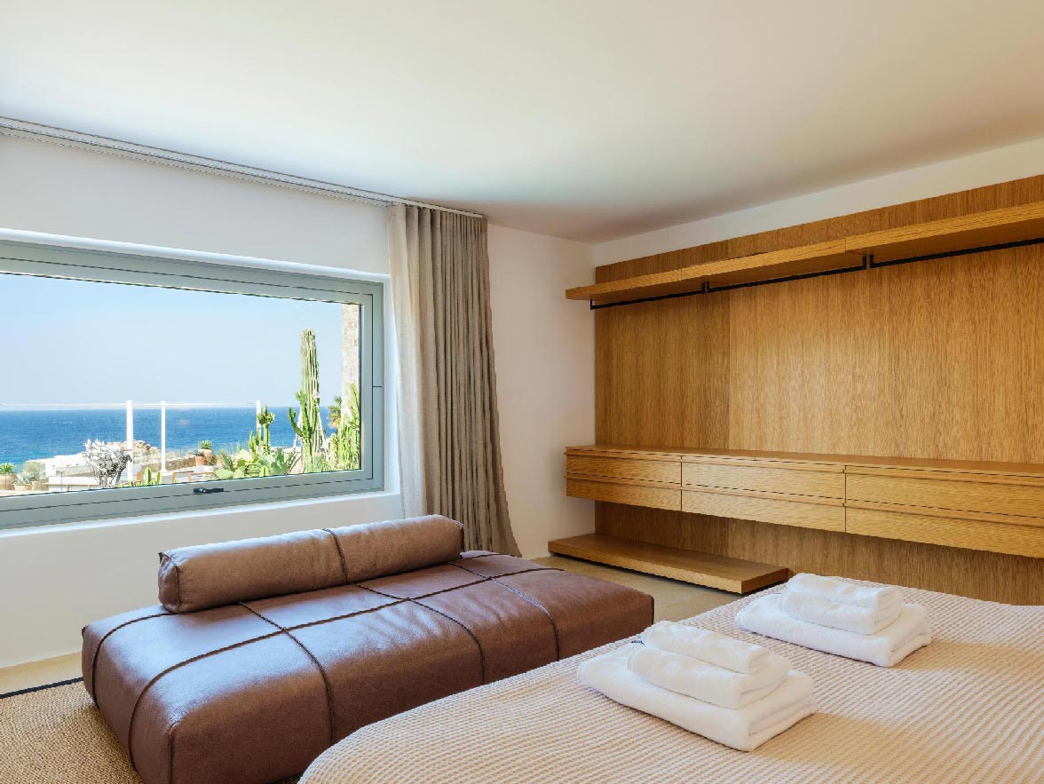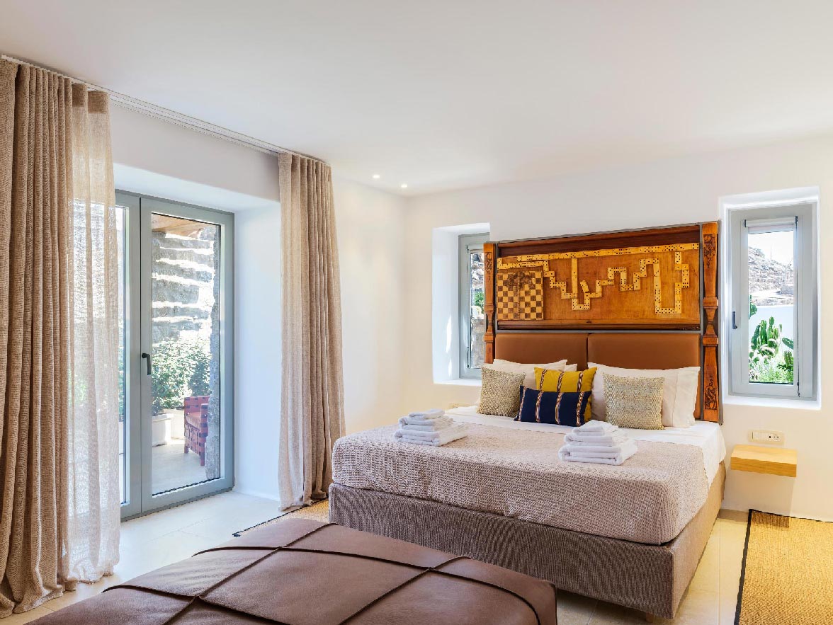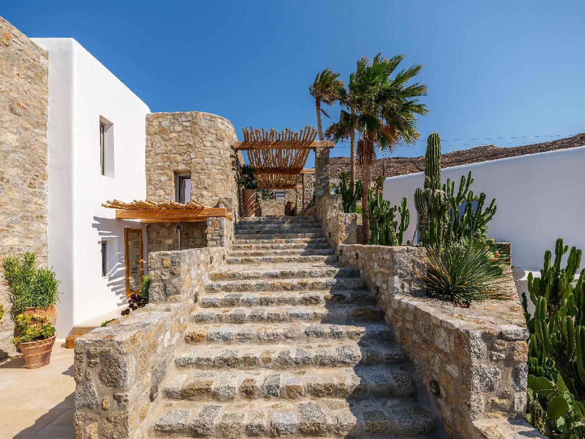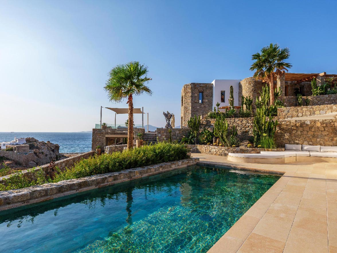 Irida boasts an exclusive perch with breathtaking views of Chouloukas Beach on the captivating Mykonos Island. This architecturally striking stone villa blends contemporary elegance with lavish amenities, ensuring an unforgettable experience for all who choose to stay. Take pleasure in the sweeping sunset and captivating Aegean scenery that graces this extraordinary property. The Villa presents an architectural design characterized by its contemporary and stylish aesthetics. It features three captivating swimming pools, elegantly framed by opulent sun loungers, providing a breathtaking setting for memorable sunset vistas. Enhancing its allure, an outdoor dining area is discreetly nestled beneath a protective pergola, complemented by a meticulously crafted stone barbecue, ensuring a delightful experience of al fresco dining beneath the starlit night sky