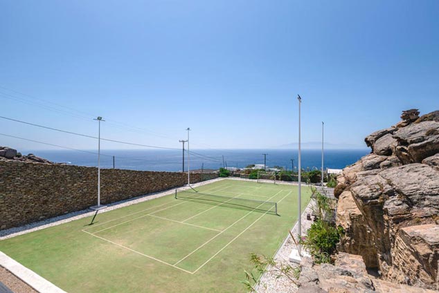 Events friendly Villa with spacious outdoors facilities, including stone-built lounge areas and BBQ facility, well-lit gardens and an enchanting infinity pool with jacuzzi offering unparallel view to the Aegean Sea. The Outdoor experience is further enhanced by the private tennis court at the side of the property, a rare feature in Mykonos’ summer villas. Tennis court can also be transformed into a football field.