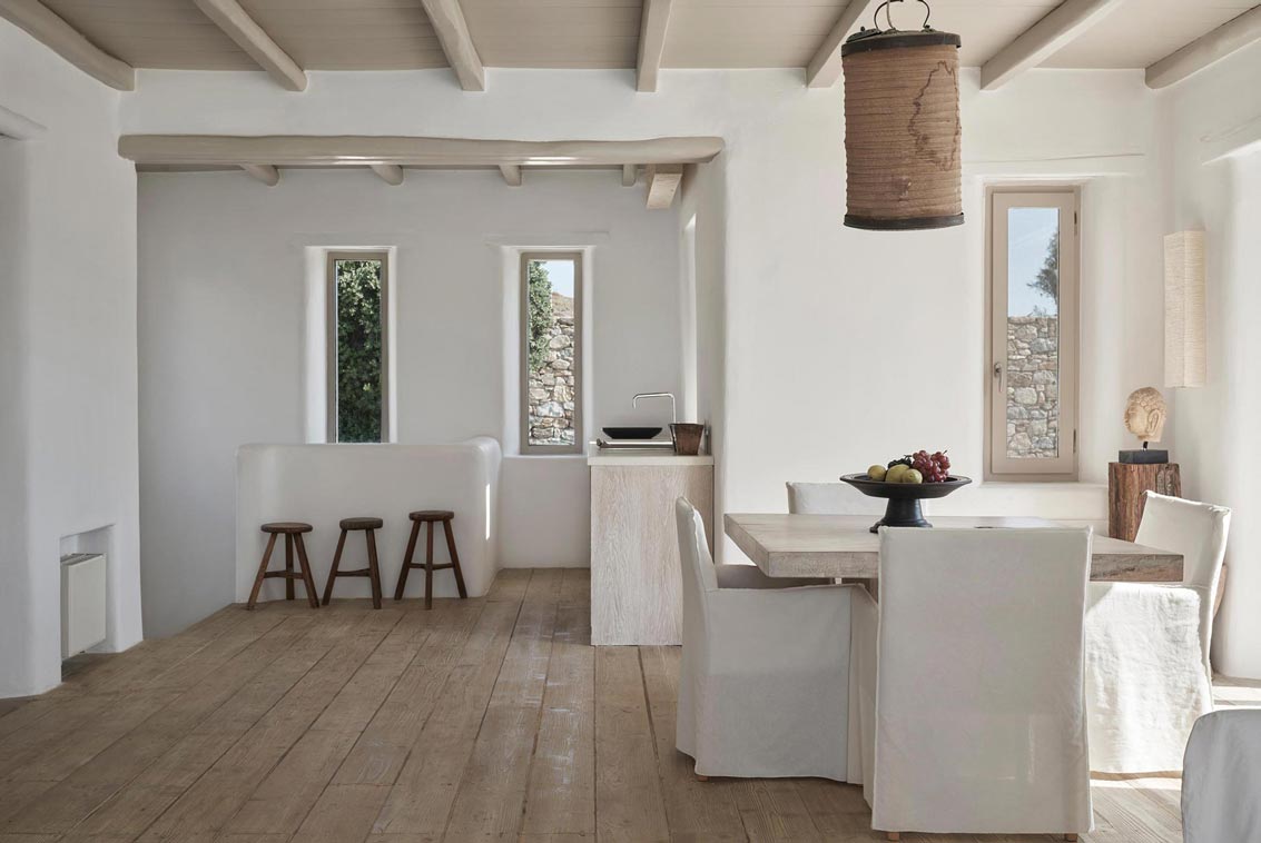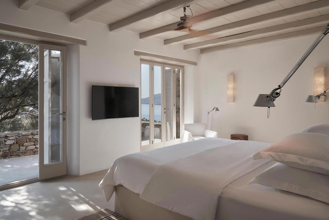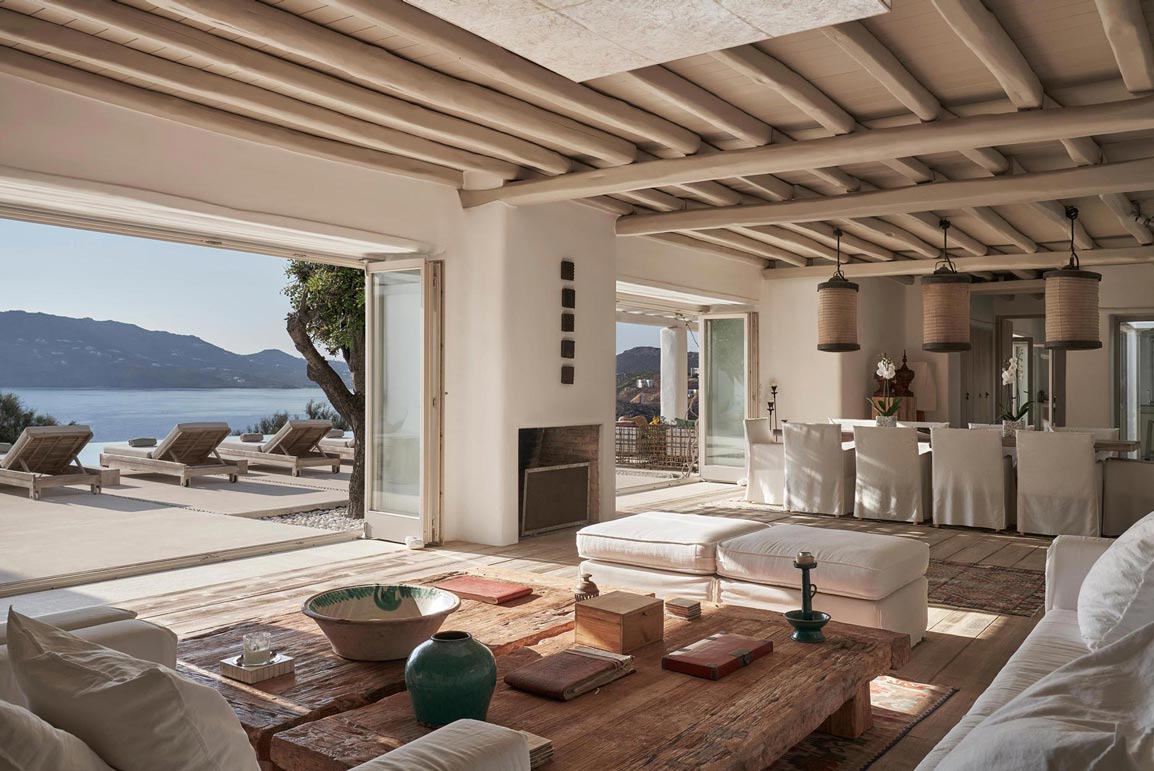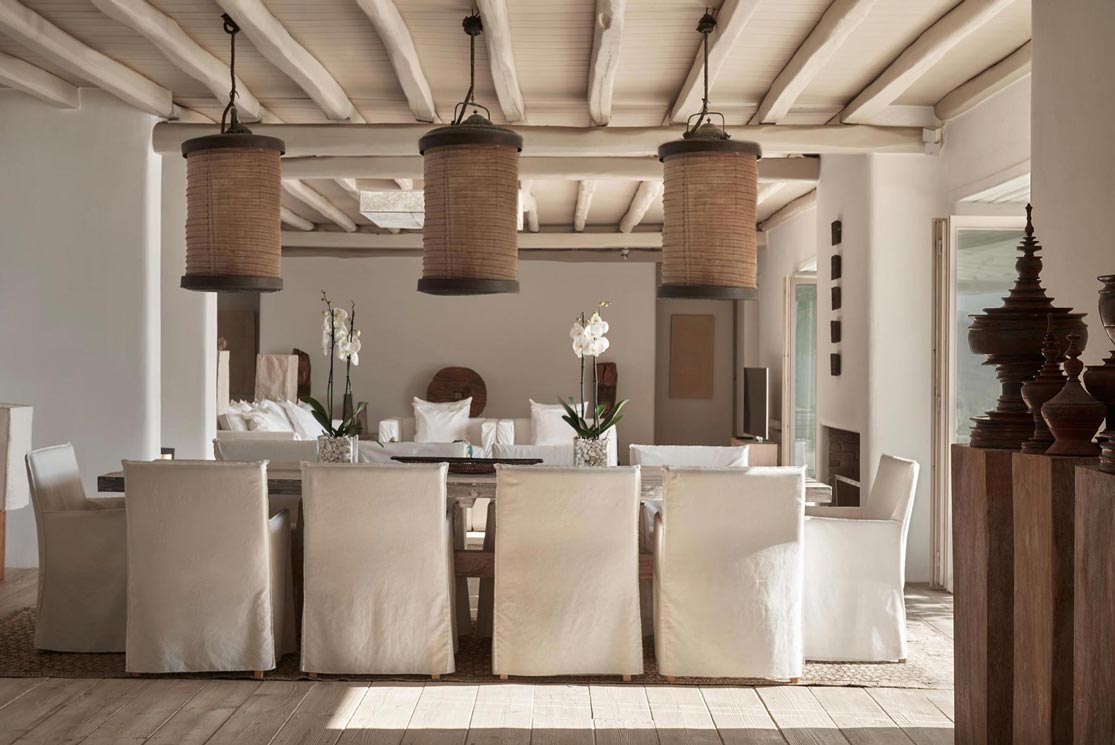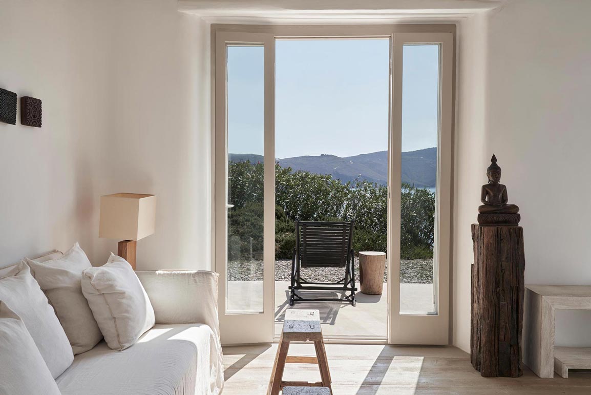 Villa Kallisti offers classic Mykonian style at its best, with an airy, easy and happy atmosphere. Agios Sostis beach with its church and famous little taverna is only a 5 minute walk below while Panormos beach is only a short drive away. The retractable glass French windows
