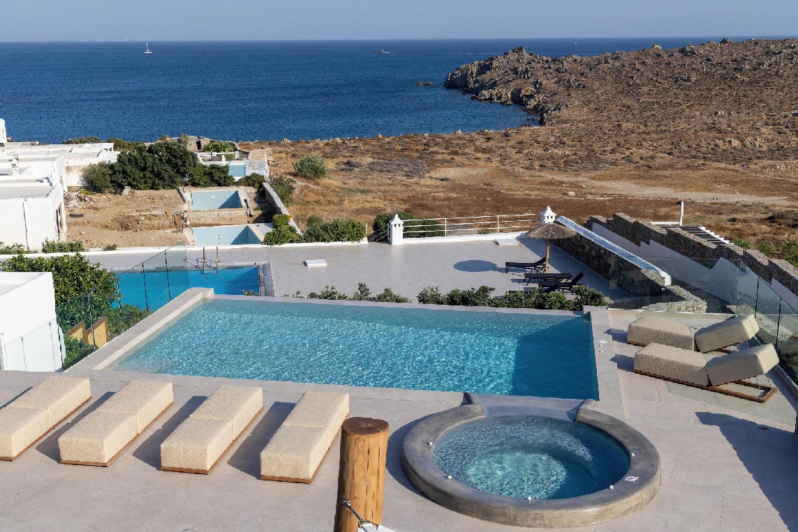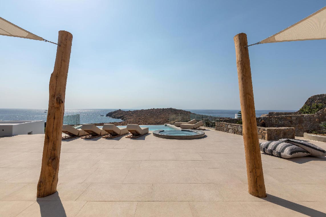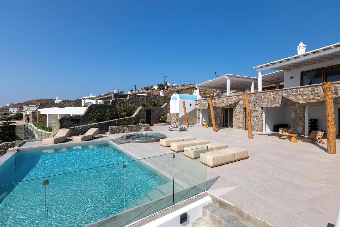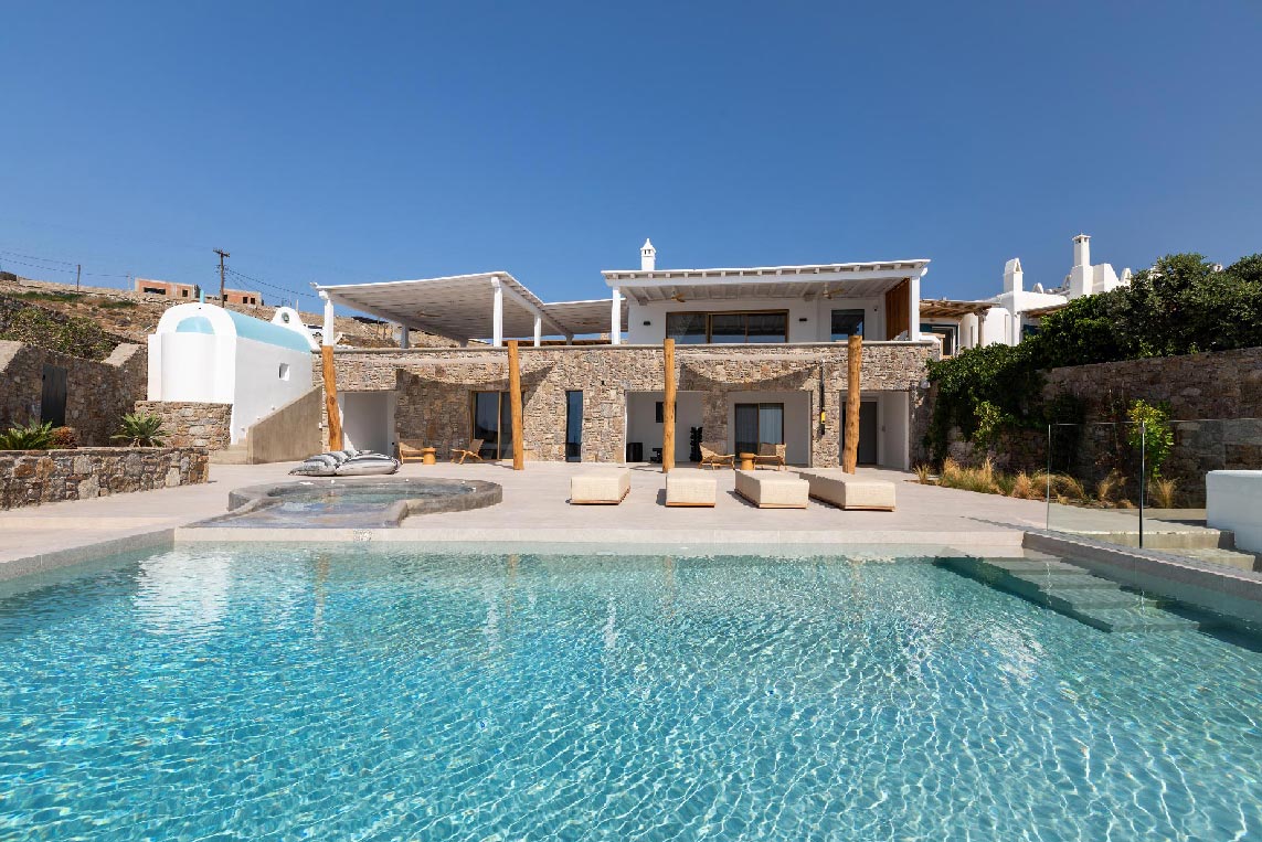 Is the epitome of Mykonian luxury, a superb, newly built 350 m2 house surrounded by a 1800 m2 plot that is nestled on a hill just 80 meters from the pristine shores of the exclusive Cavo Glyfadi beach in the Aleomandra area. Villa Karmella is a showcase of contemporary elegance and comfort. You can breathe in the peace of the residence vibes yet still get involved in the local bars and eateries in a flash. The villa features six stylish bedrooms with en suite bathrooms, spacious living areas and a fully equipped kitchen. On the outdoor, the large terrace features a heated swimming pool, jacuzzi, daybeds, outdoor dining area and a lush garden. There is also a wonderful, bright guest house available for those who might relish a bit more privacy. The property is beautifully designed by an indepedent architectural studio with the perfect mix of modern and cosy features.