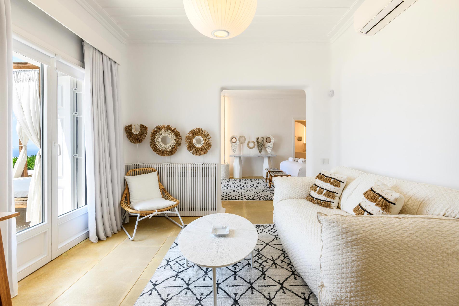 The main villa includes 3 main levels. The ground floor has an open plan living area with direct Sea view, a dining area and a professional kitchen. The are 9 bedrooms in total and can accommodate 18 guests. Villa Leander has several sitting and lounge areas, and it is great for big gatherings.