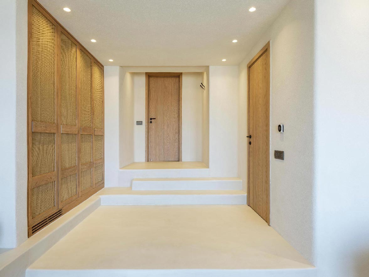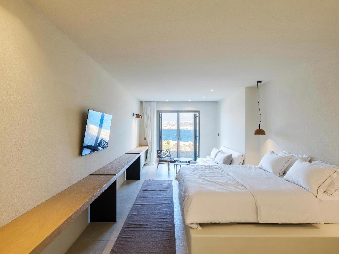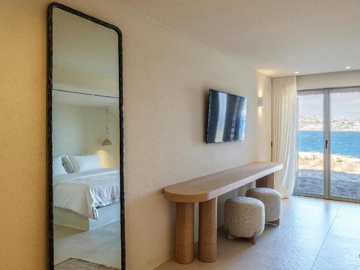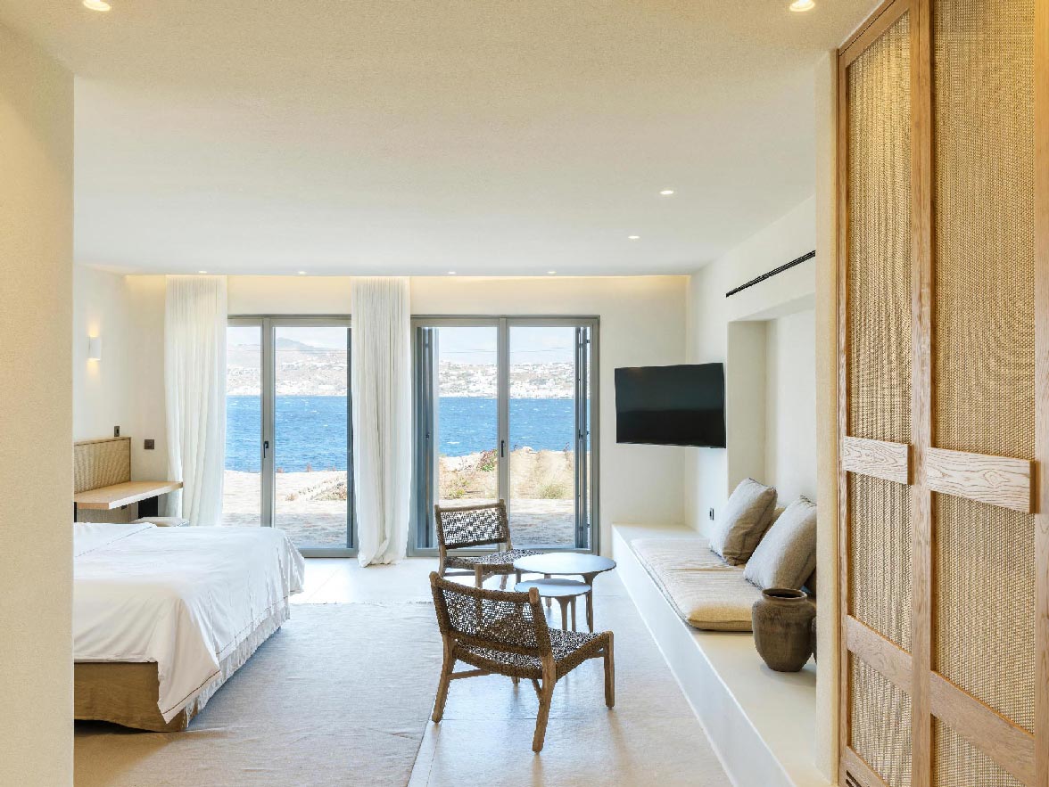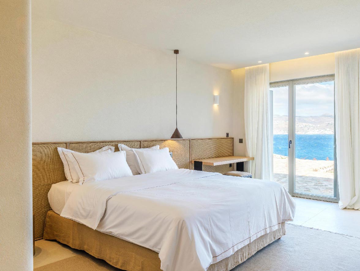This luxurious property of 400 sq.m. expands in 3 levels and consists of 6 master bedrooms -all with luxurious beds and en suite bathrooms-, 1 WC, a spacious living room and a fully equipped kitchen. The property has a very spacious private outdoor terrace with a 100sq.m. infinity pool, well protected by the strong winds that often blow in Mykonos island.