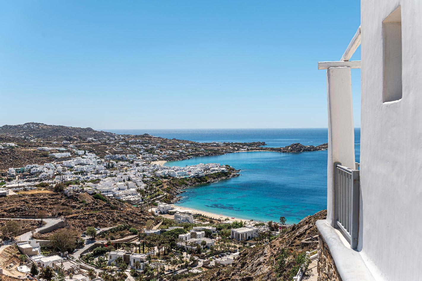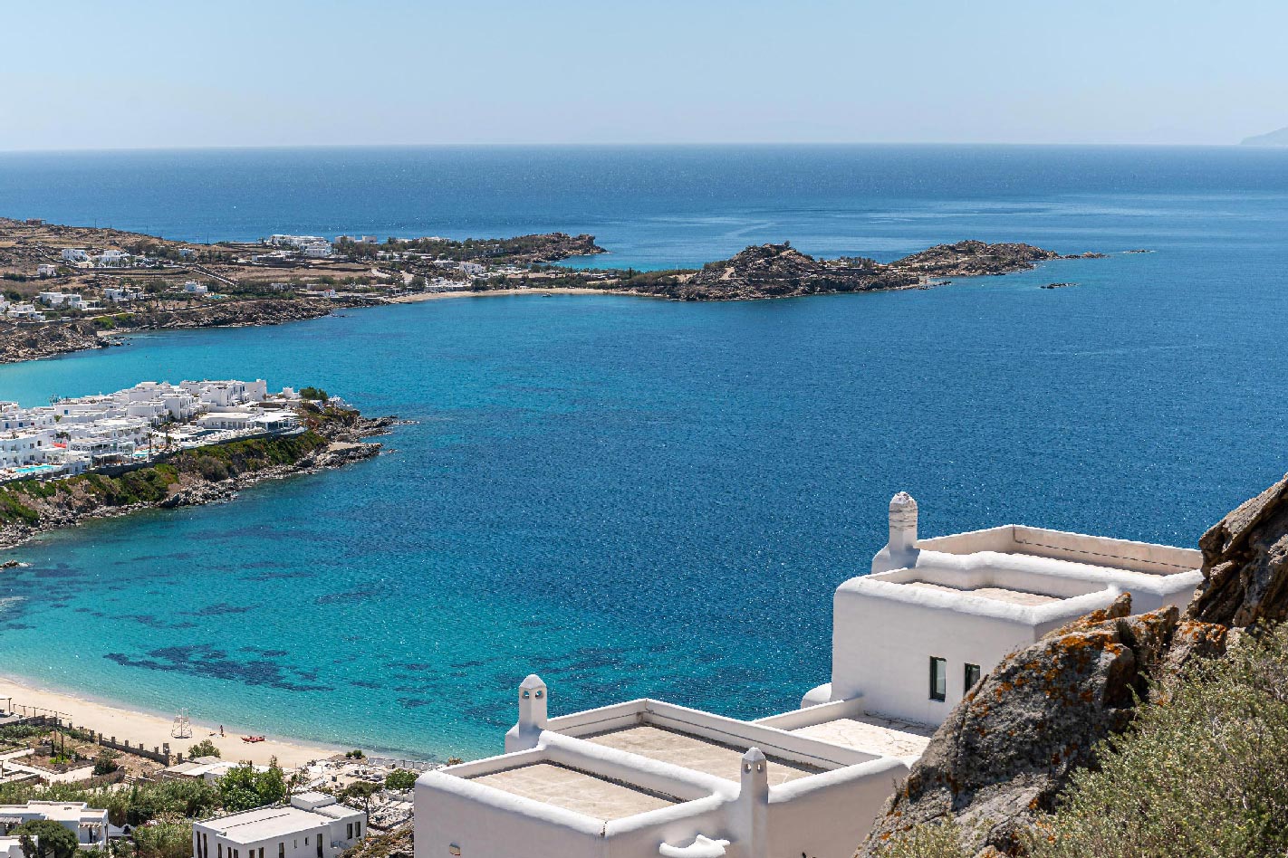 In the all things bold and beautiful island of Mykonos, scattered across a steep rocky slope above the island’s most renowned Psarou Beach stands Villa Leona;