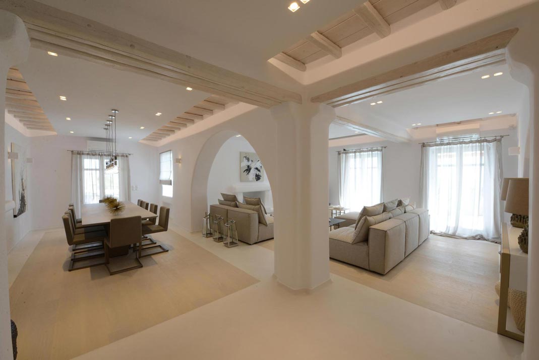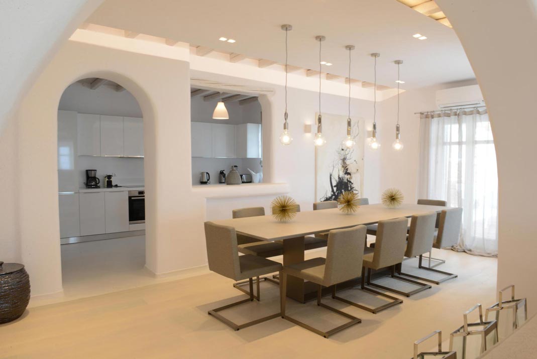 This 8 bedroom Villa with private pool in Tourlos, enjoys an unforgettable location overlooking the Aegean Sea. Mykonos Town is a 10 min ride, while Psarou, Ornos, St. John and Agios Stefanos beaches, are within a 20 min drive or less. The villa embodies an efficient combination of Cycladic architecture and contemporary design.