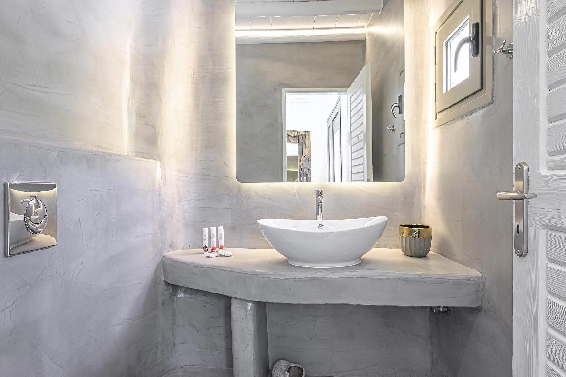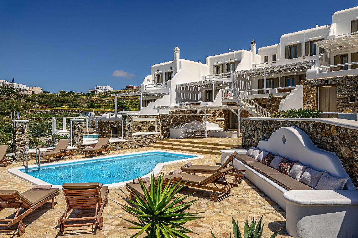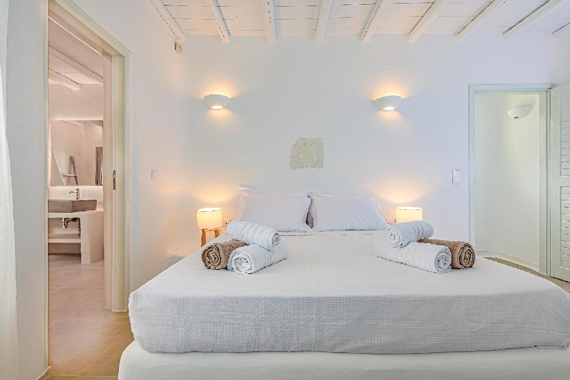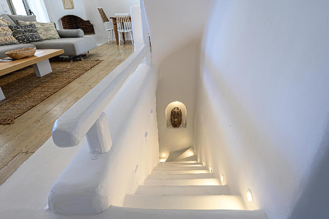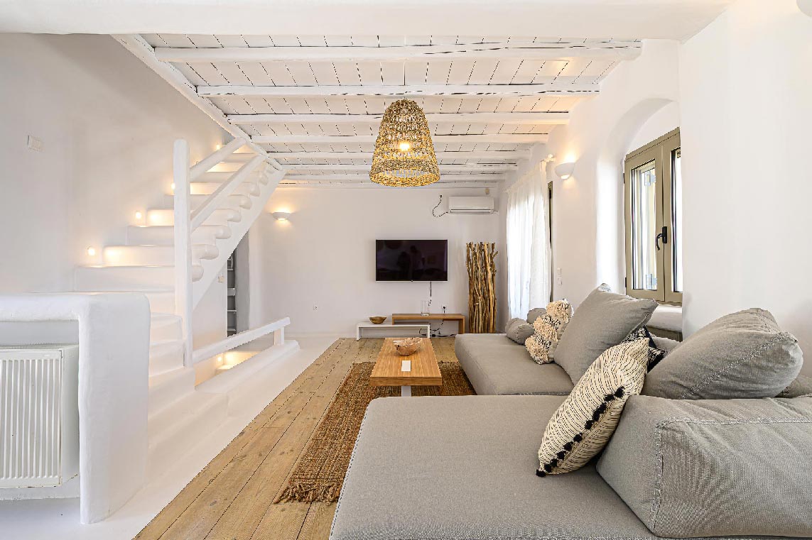 A hillside hideaway in a secluded nearly rural area although close to the town, where you can relax after a long day at the magnificent beaches of the island or a long night in the vivid nightlife. Carved on a hill, 200m from the coast, in an extraordinary setting framed by beautiful countryside, it blends uniquely in the rocky topography of its hillside, prime and unspoiled, setting. Traditional interiors, all in white, perched on a hillside with breath-taking, panoramic views over the Aegean Sea boasting a large open plan living area indoors and outdoors and offering privacy and seclusion in a very idyllic spot.