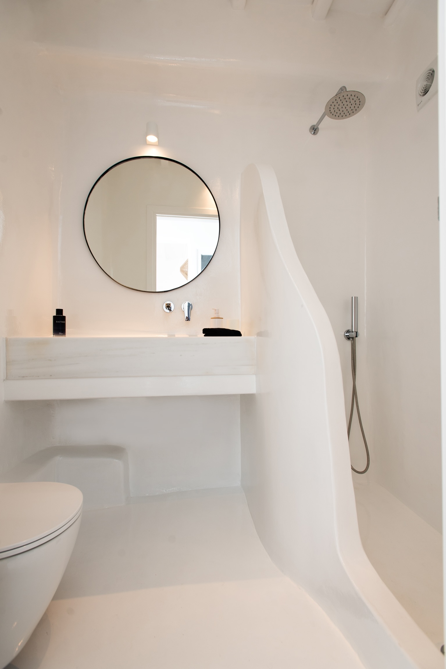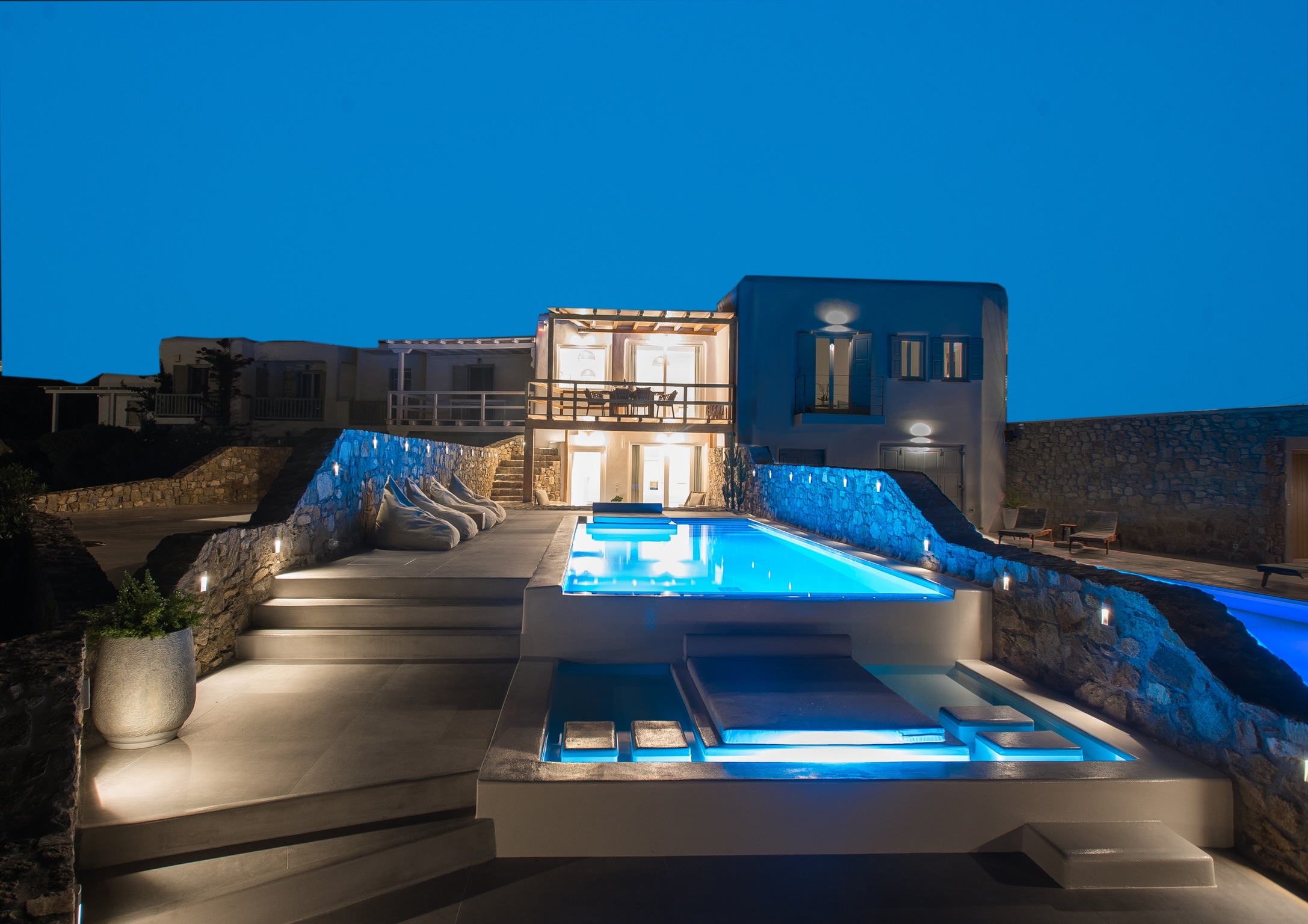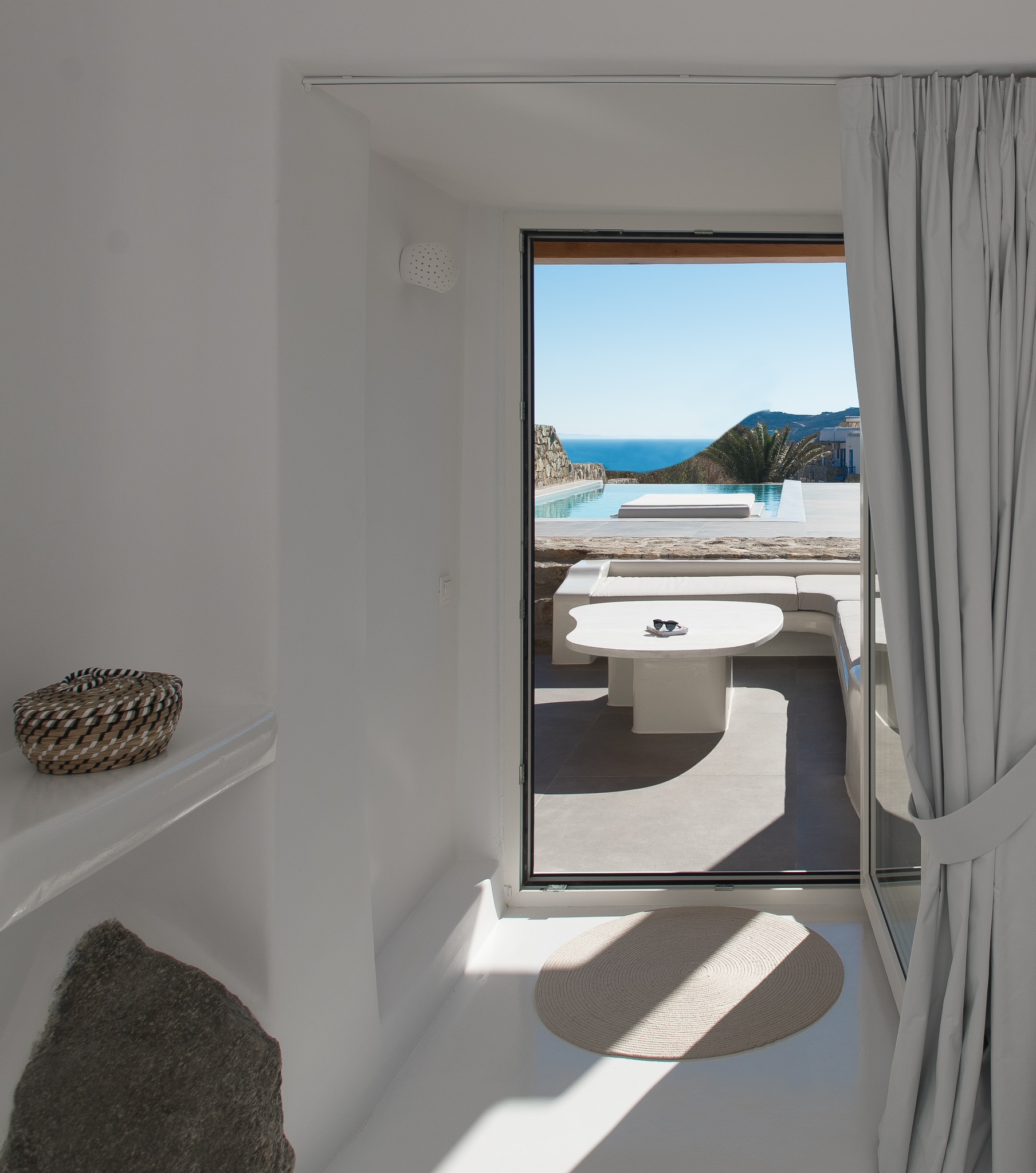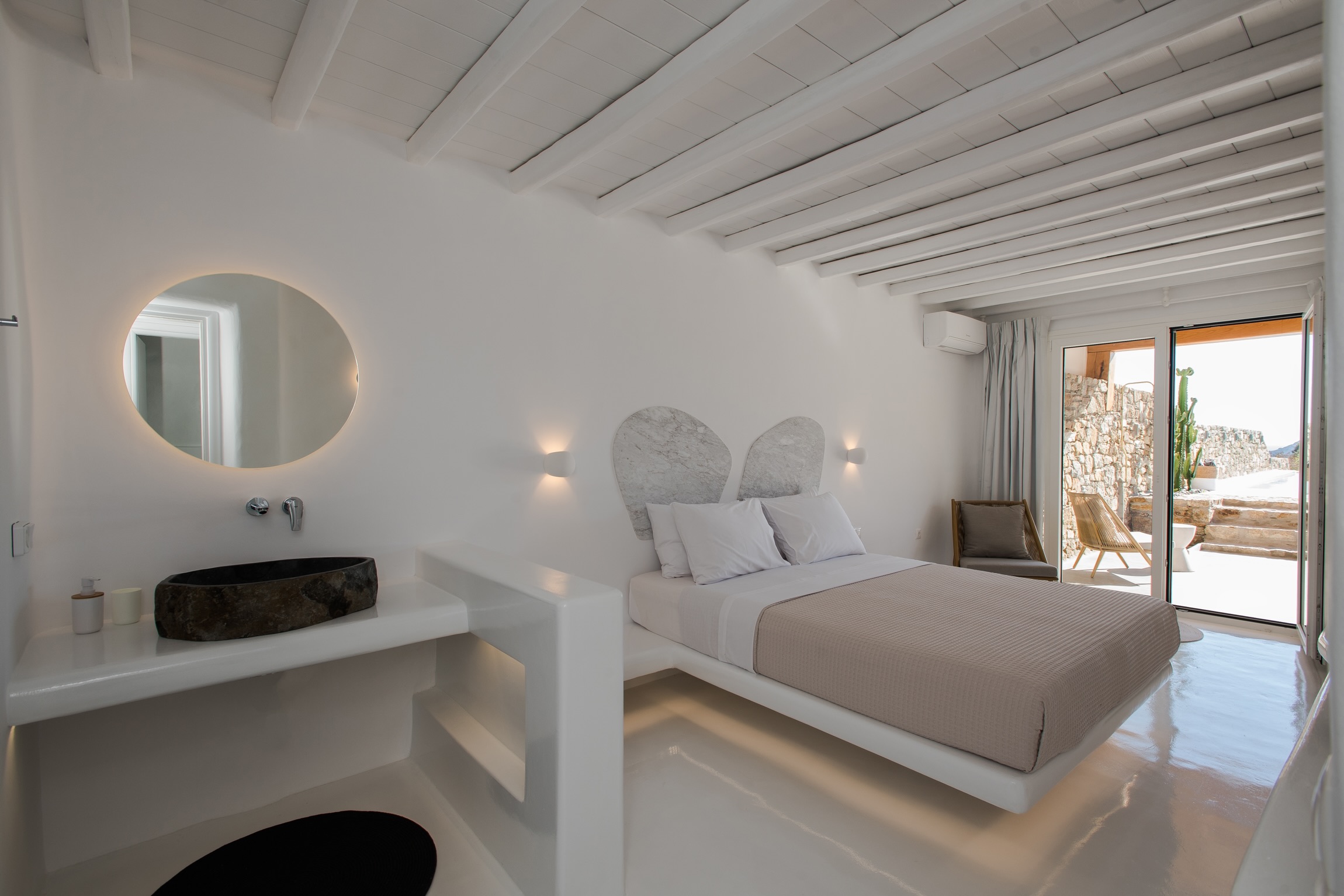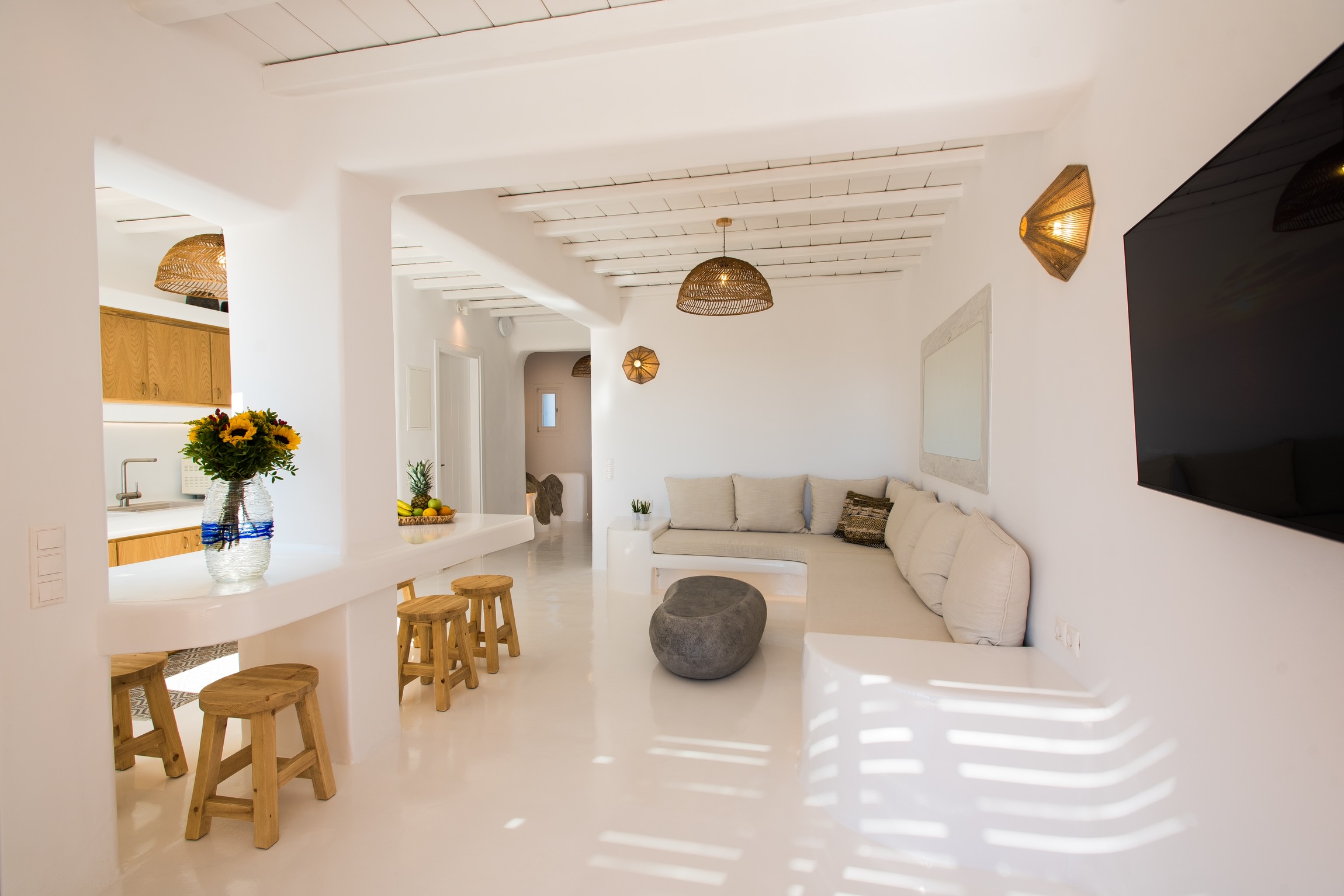 Mykonian rocks and artwork marbles decorate the interior and exterior of the villa.