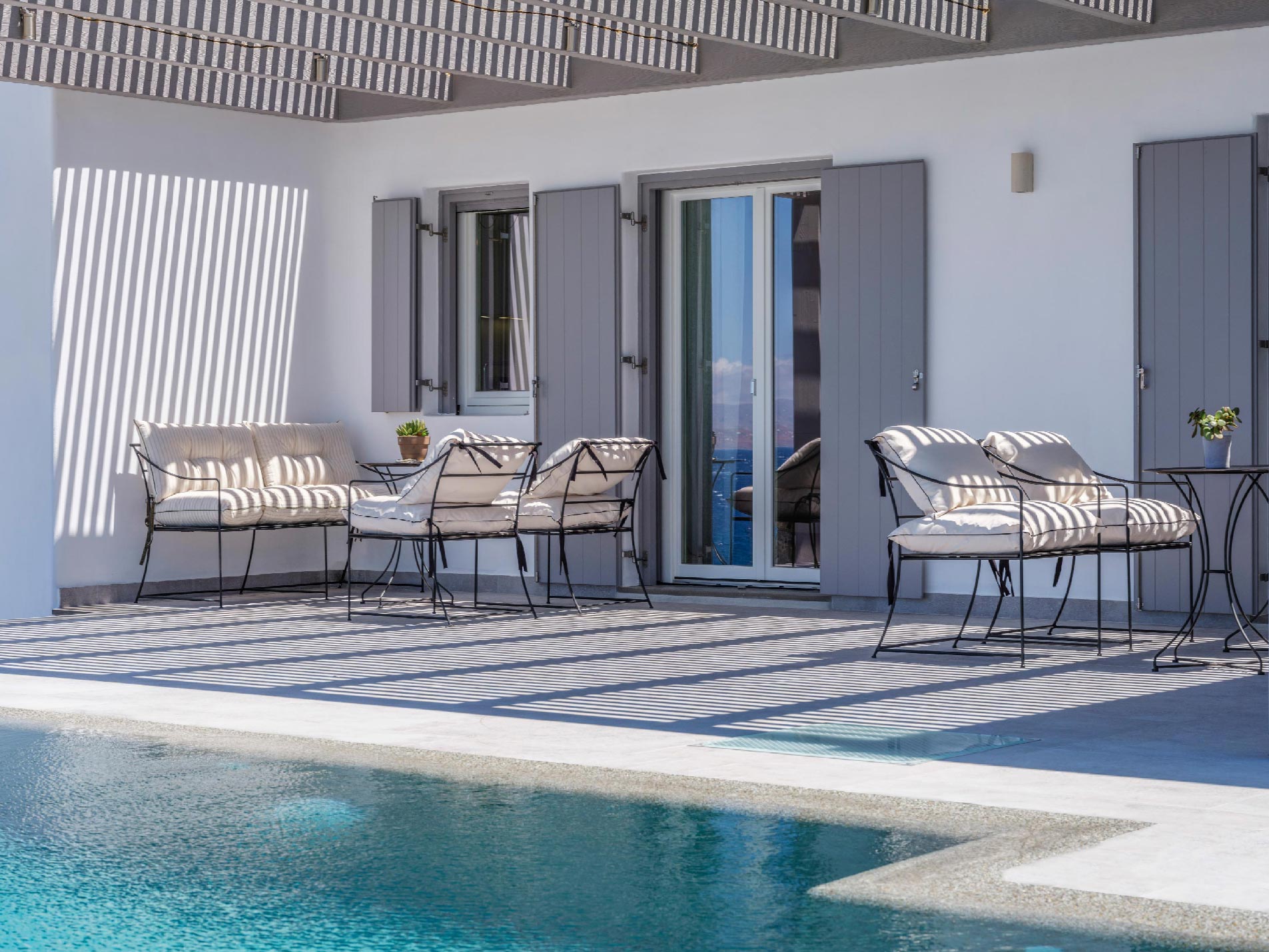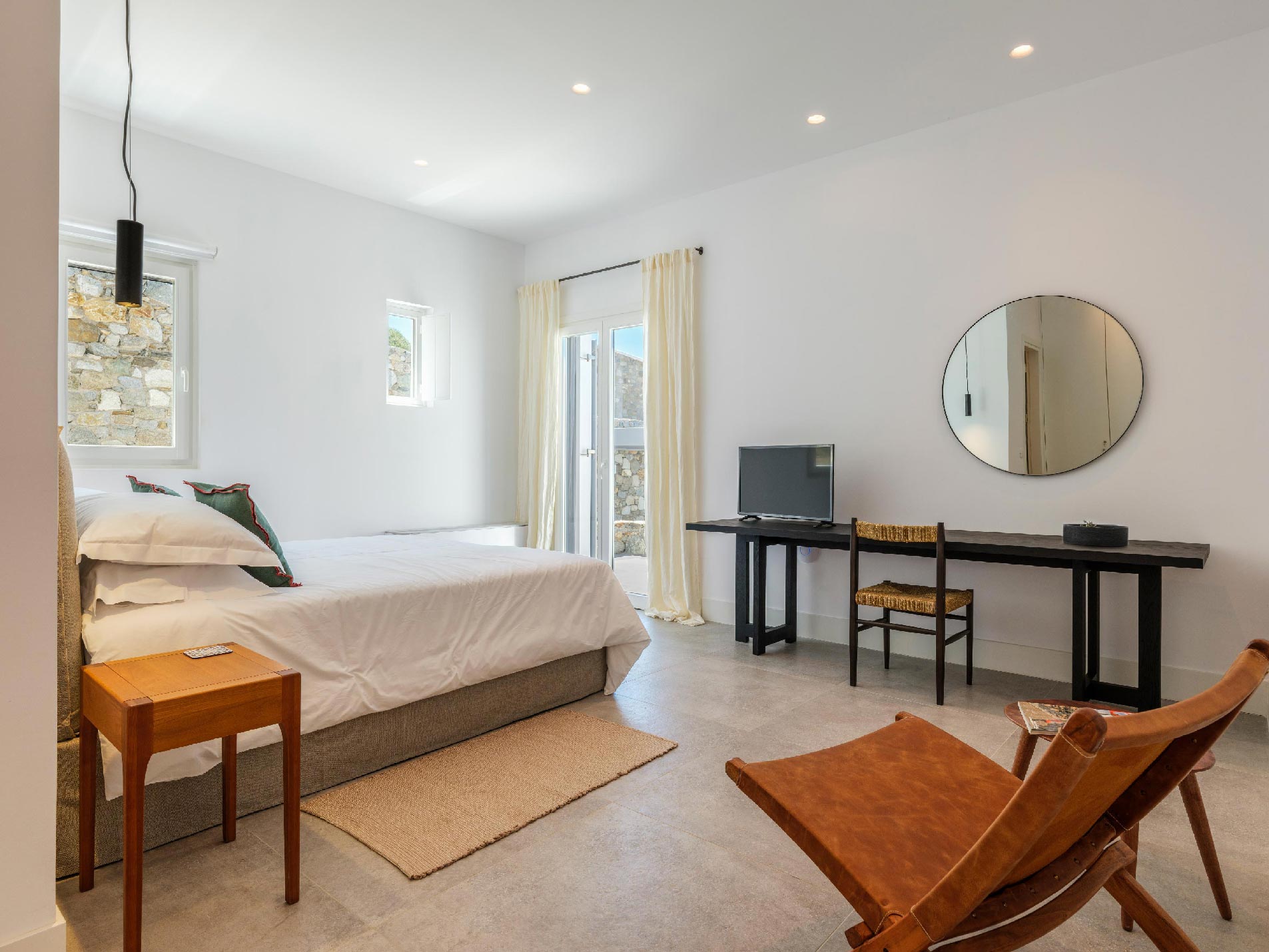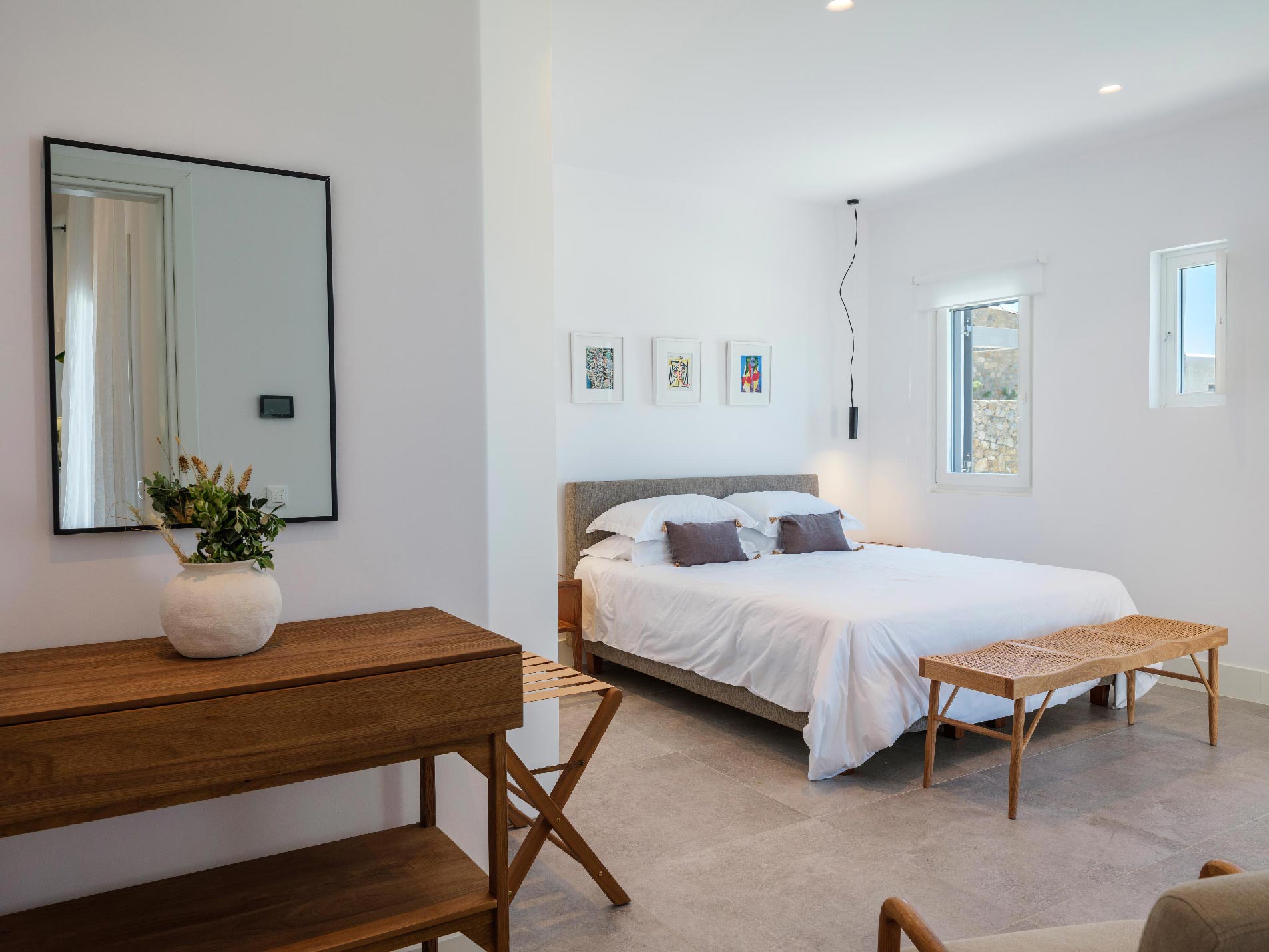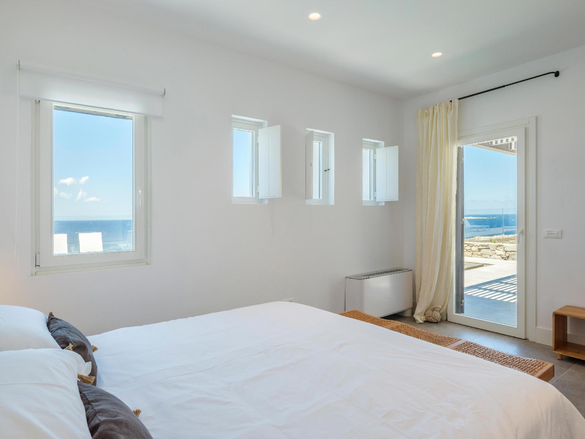 ➢ 3 Double bedroom with queen sized bed and ensuite bathroom. Equipped with AC, wardrobe, safe box and has direct access to pool and bed views to the Aegean Sea.