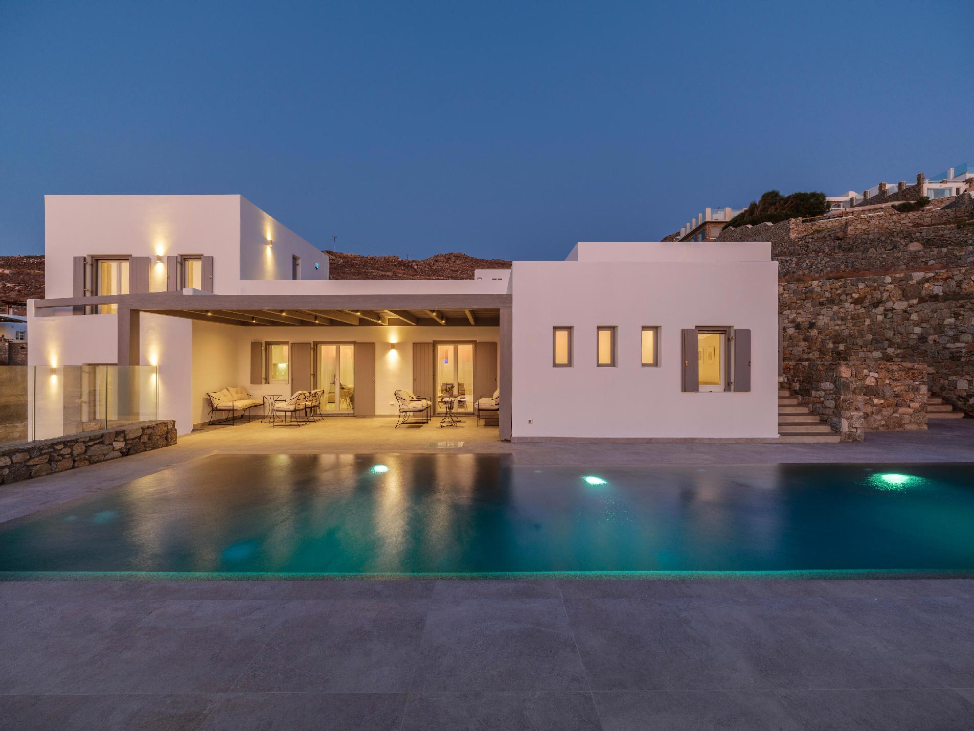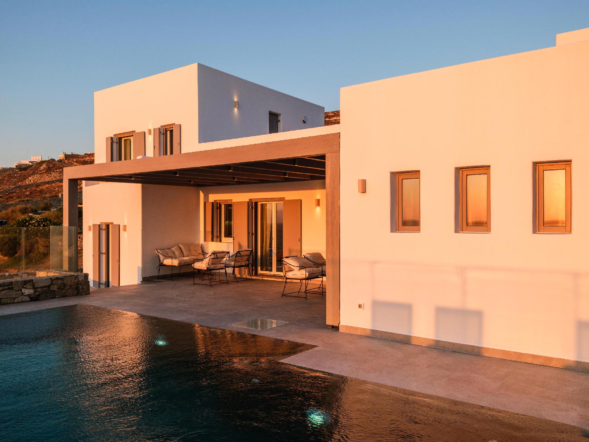 Boasting a privileged location in the Pouli area, just a few minutes away from the vibrant town of Mykonos, this beachfront villa is a luxurious modern retreat that epitomizes elegance and comfort. This modern architectural masterpiece seamlessly blends contemporary design with breathtaking natural beauty. Each of the spacious bedrooms features an ensuite bathroom, providing comfort and privacy, and has been tastefully decorated with high-end finishes.