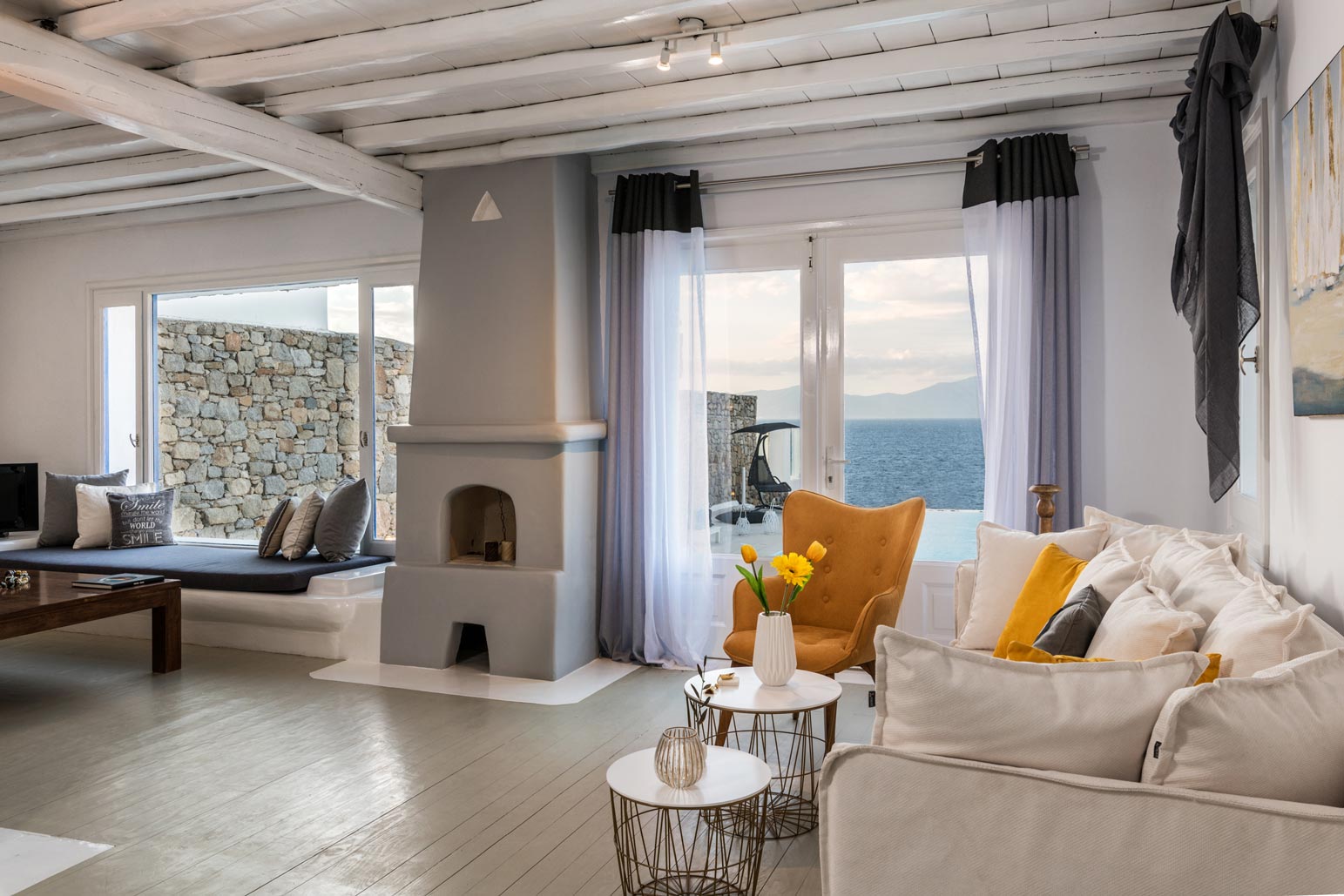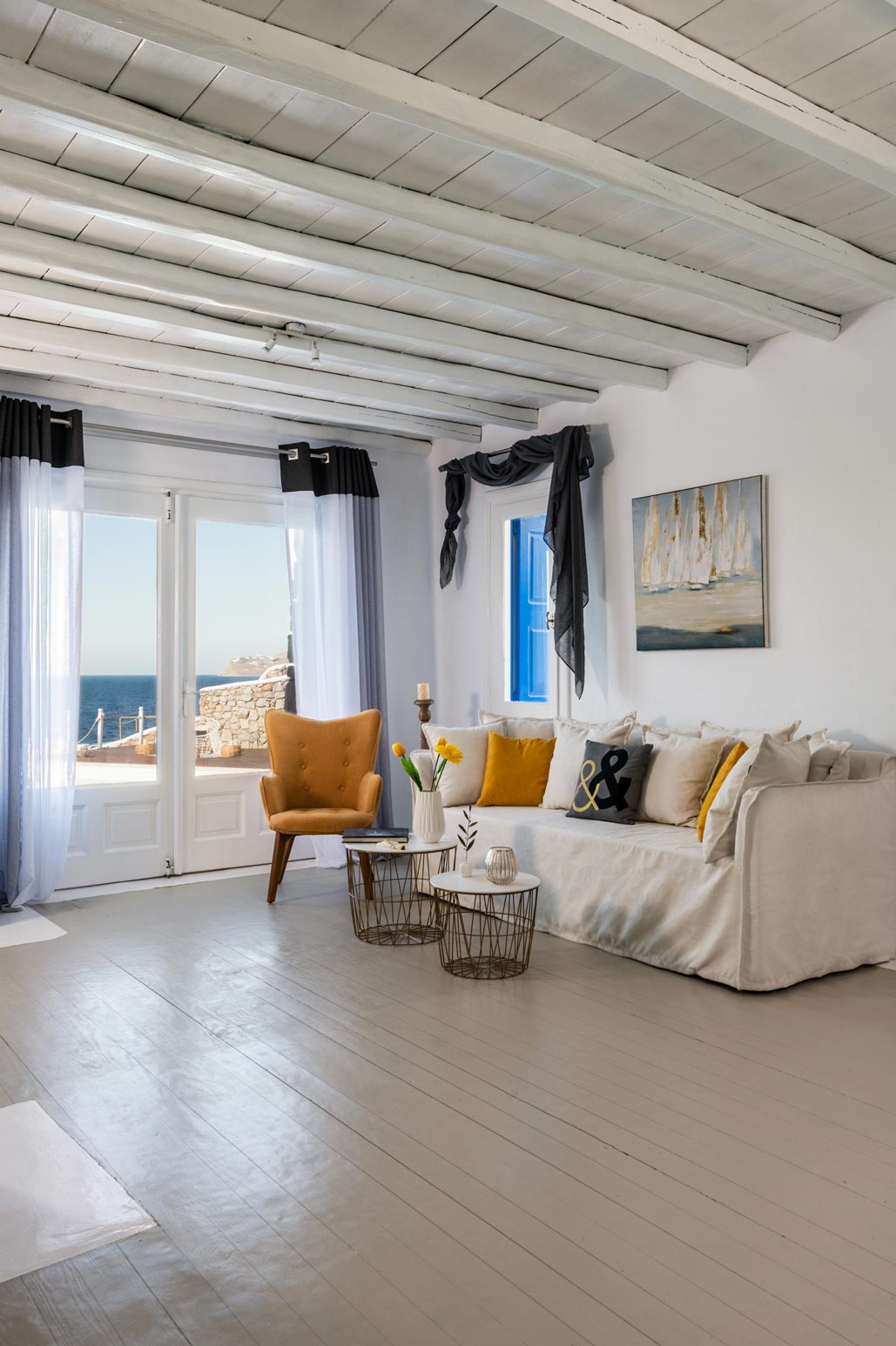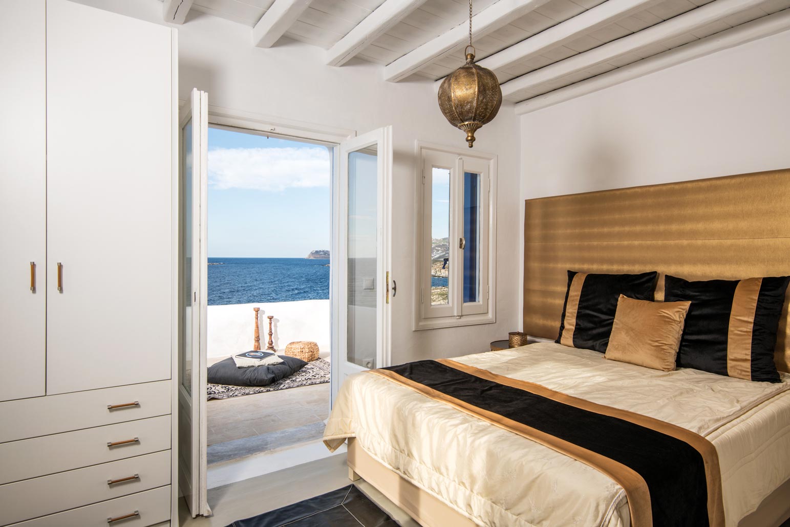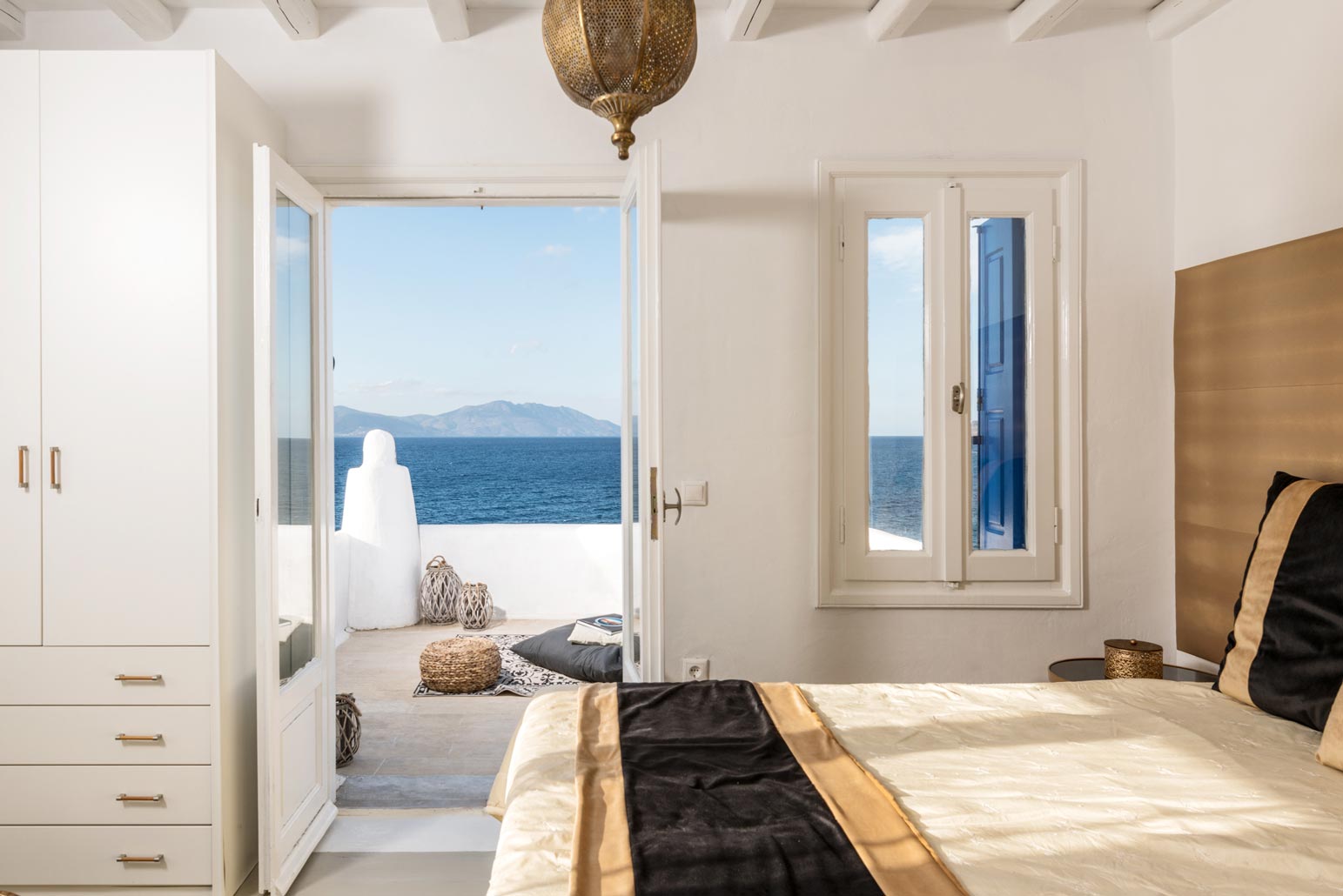 Villa Myrtia is devided into three levels. On the first level -ground floor- which overlooks the swimming pool and the beach, there are the kitchen, the dining room, the sitting room with two sofa beds and two couches, the bathroom and a storage. On the second level there is a suite with a private balcony and the master bedroom overlooking the pool, the sea and the town of Mykonos. On the third level there is a master bedroom with two balconies, one of which has a view to the pool, the sea and the town of Mykonos as well. Apart from the above, there are also two master houses with independent entrances at the pool level.