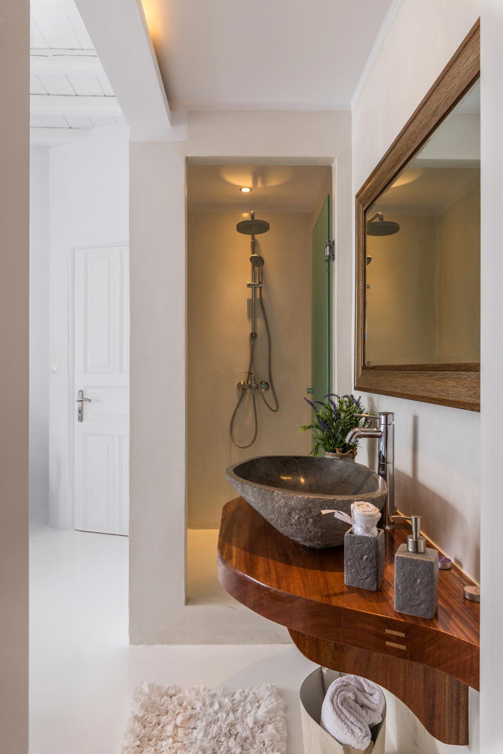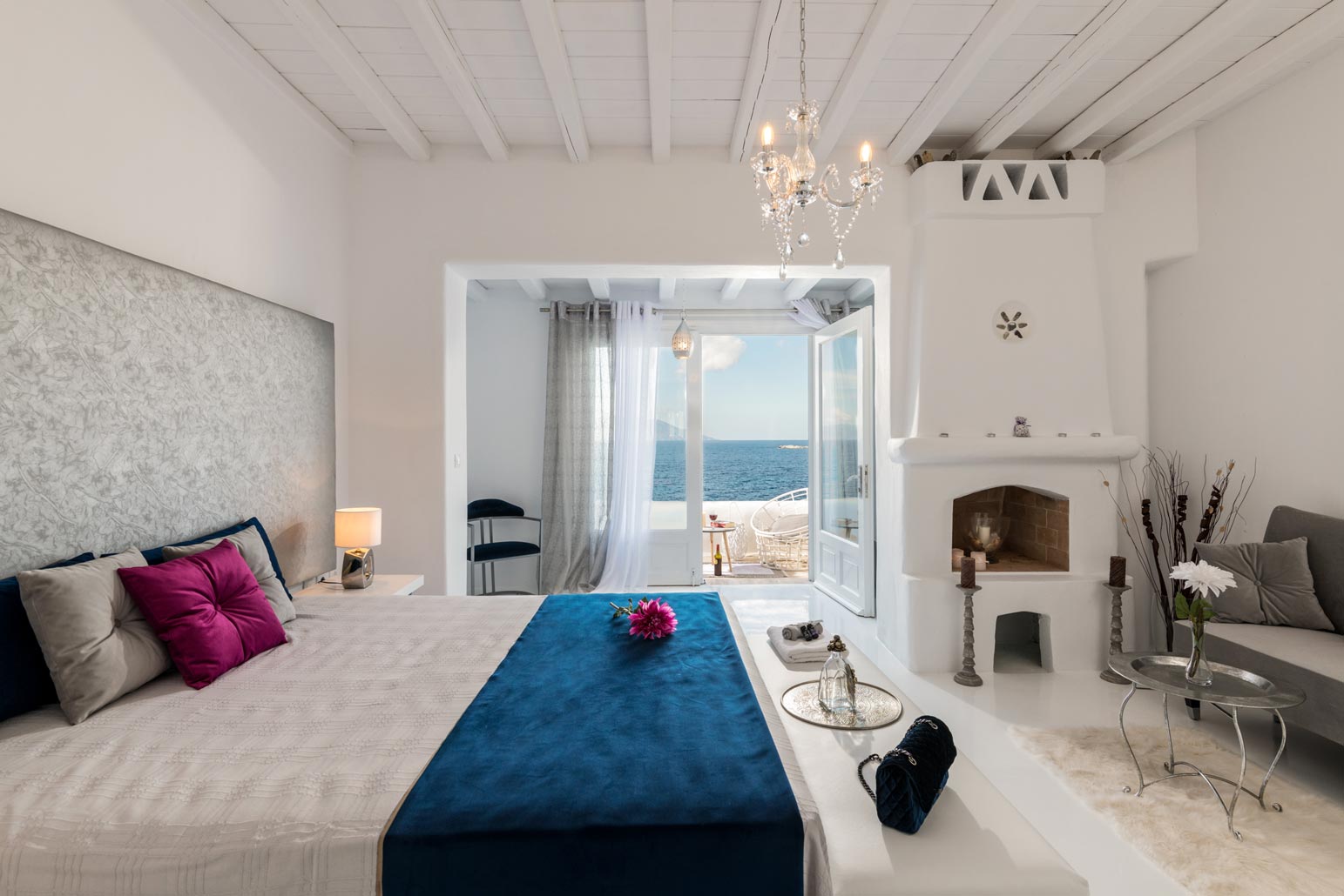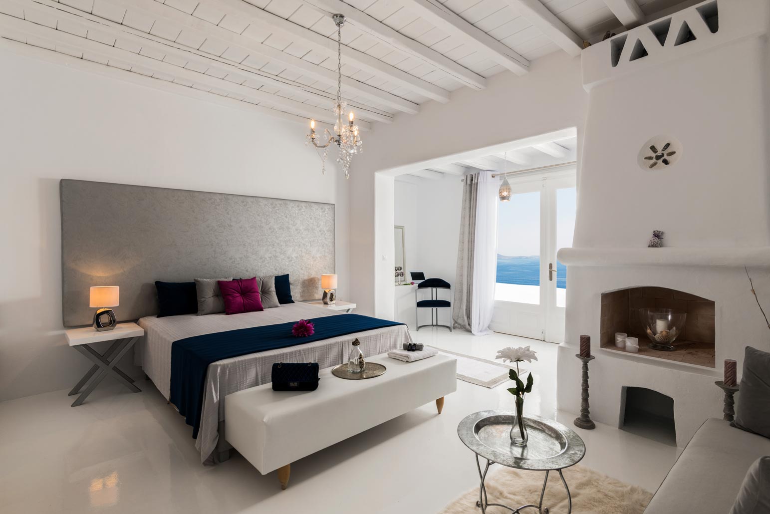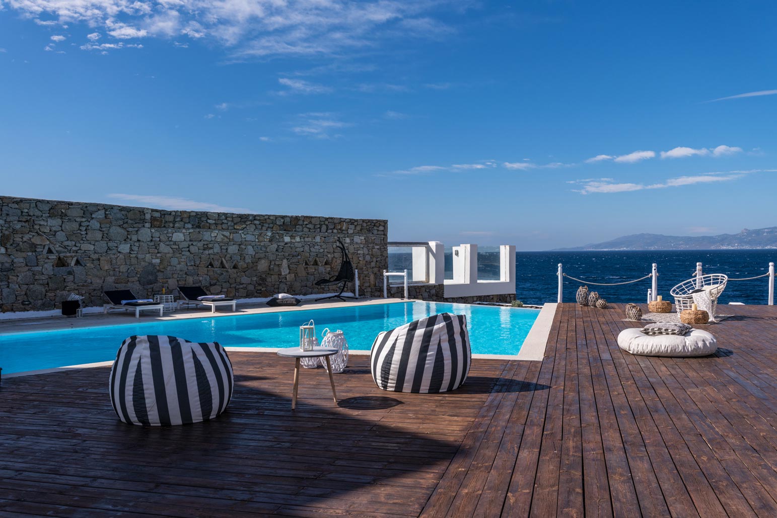 Villa Myrtia is devided into three levels. On the first level -ground floor- which overlooks the swimming pool and the beach, there are the kitchen, the dining room, the sitting room with two sofa beds and two couches, the bathroom and a storage. On the second level there is a suite with a private balcony and the master bedroom overlooking the pool, the sea and the town of Mykonos. On the third level there is a master bedroom with two balconies, one of which has a view to the pool, the sea and the town of Mykonos as well. Apart from the above, there are also two master houses with independent entrances at the pool level.