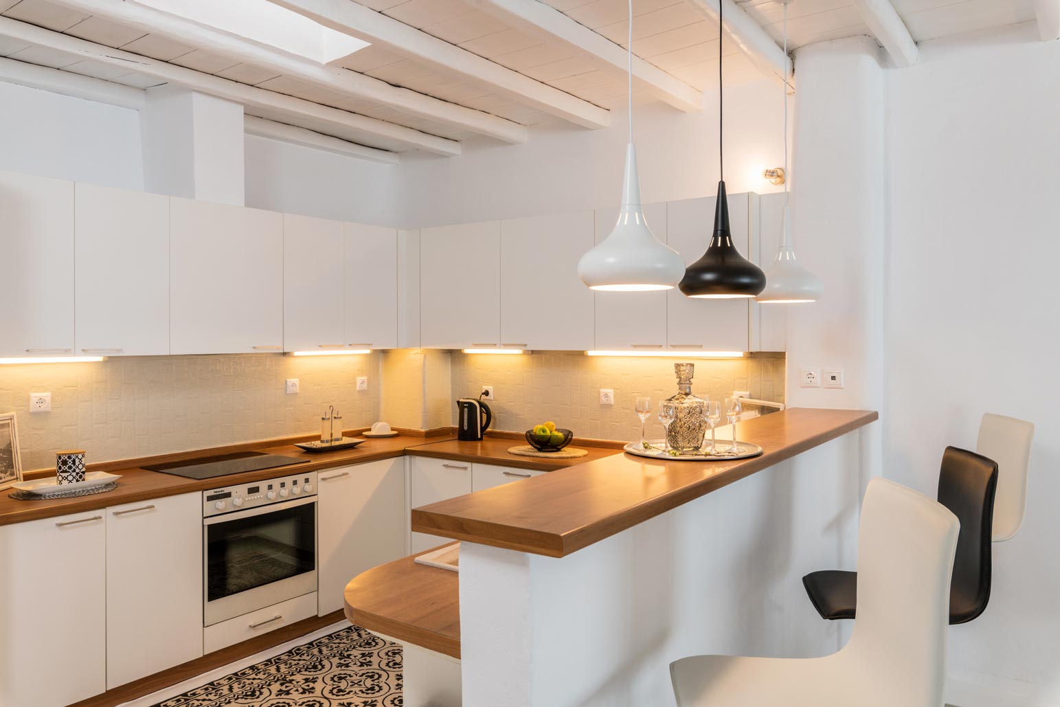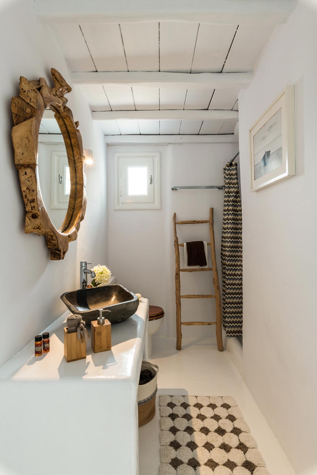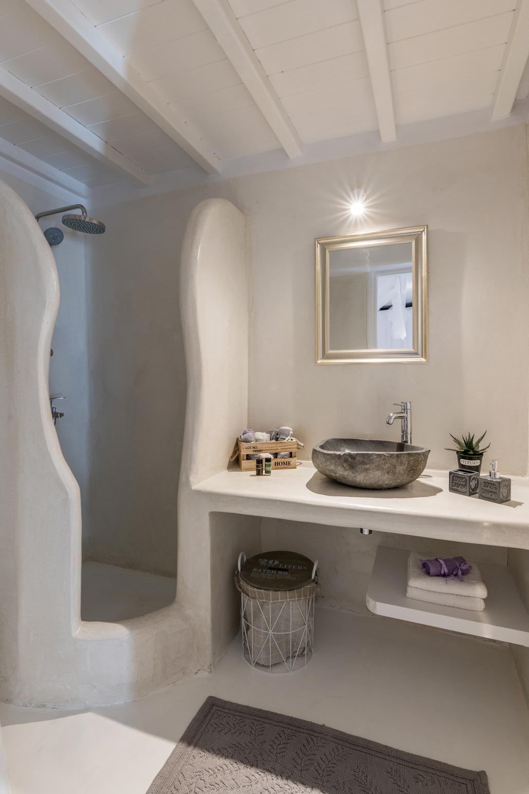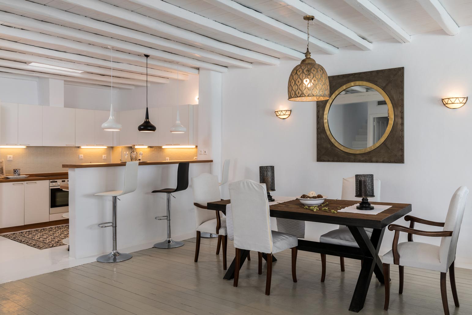 Villa Myrtia is devided into three levels. On the first level -ground floor- which overlooks the swimming pool and the beach, there are the kitchen, the dining room, the sitting room with two sofa beds and two couches, the bathroom and a storage. On the second level there is a suite with a private balcony and the master bedroom overlooking the pool, the sea and the town of Mykonos. On the third level there is a master bedroom with two balconies, one of which has a view to the pool, the sea and the town of Mykonos as well. Apart from the above, there are also two master houses with independent entrances at the pool level.
