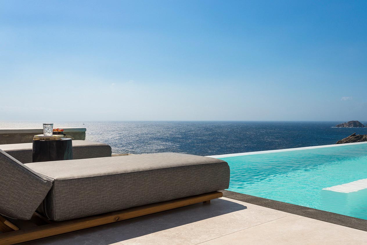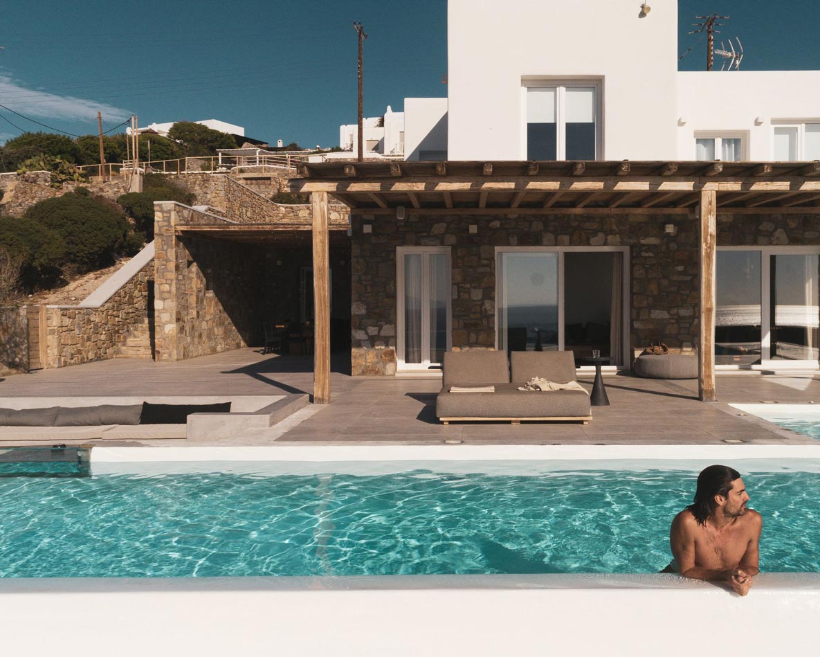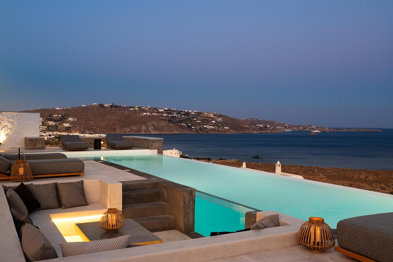 A newly renovated and completely refurbished property of al- luring luxury has been brought back to life to invite its distin- guished guests on a creative journey of refined design and an experience of blissful luxury. Laying gracefully on a matchless location that provides a panoramic view to the sapphire waters of the Aegean Sea and the colorful sunrise, in the popular area of Aleomandra, only a few minutes drive from Ornos village and its fashionable beach and just 5 km away from the pulsating Mykonos Town with its vibrant nightlife.
