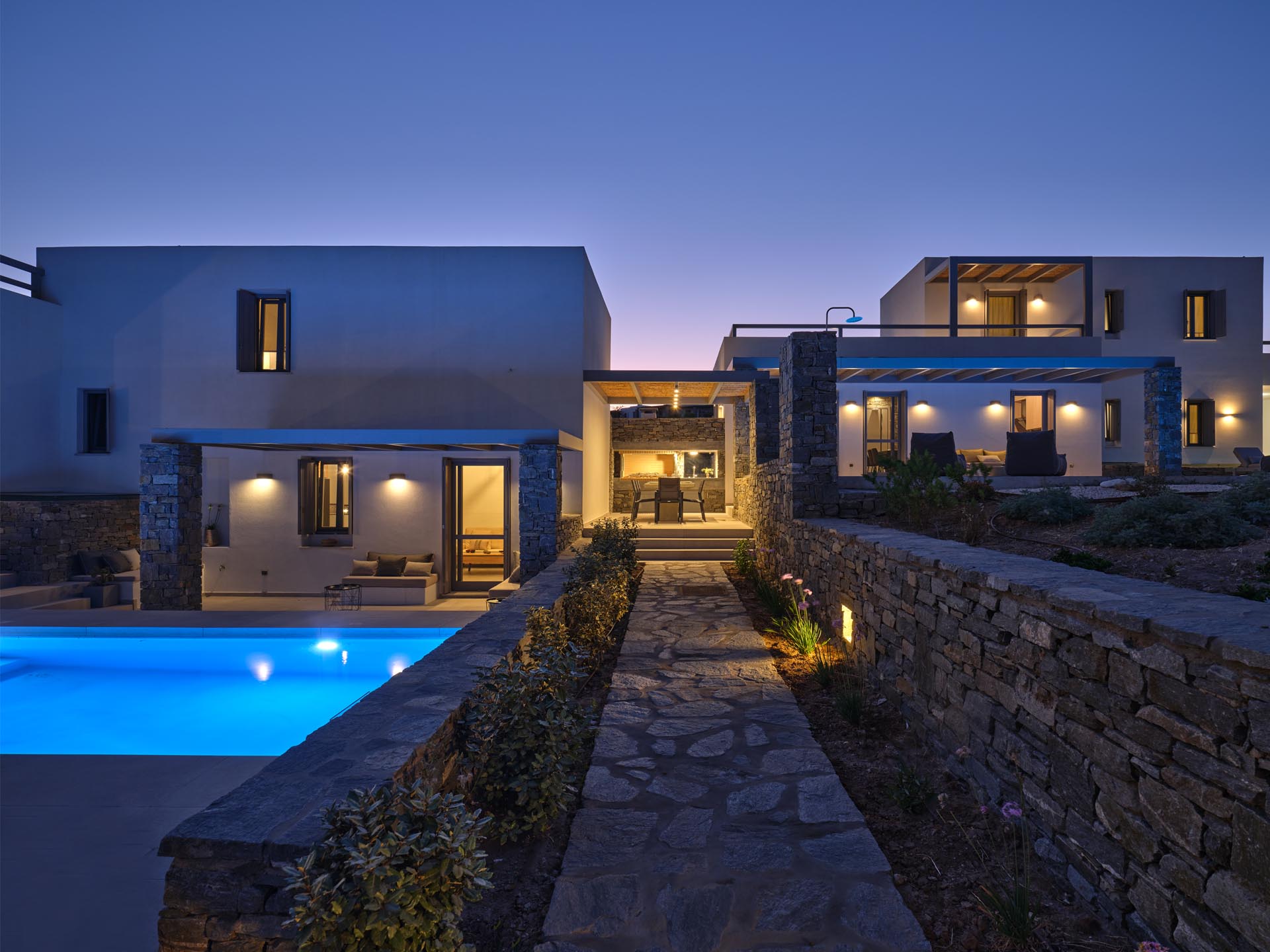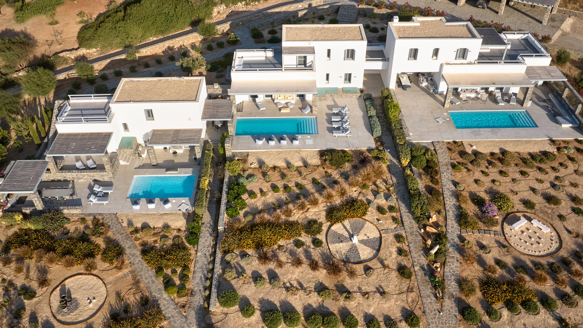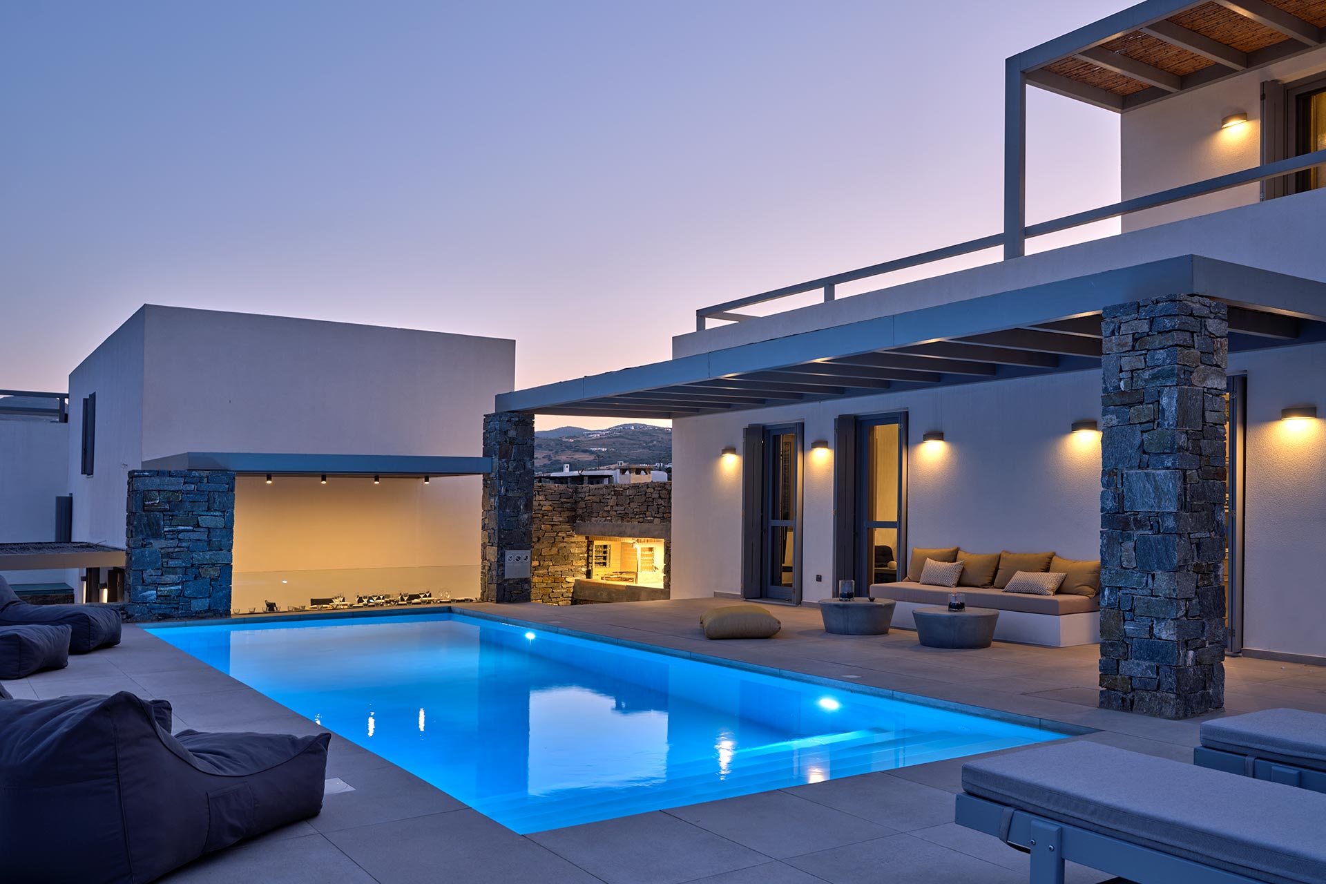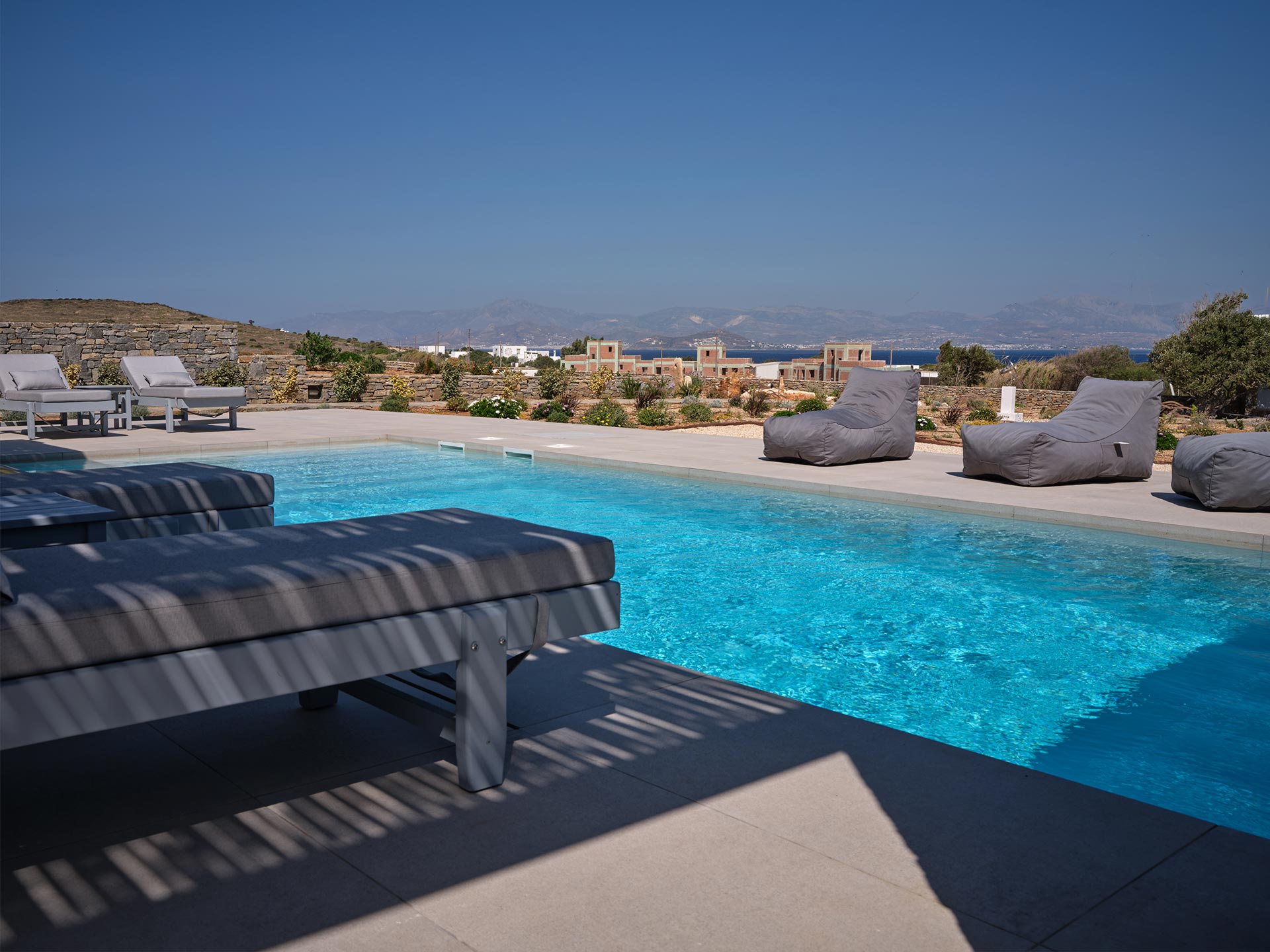 Villa Olivia is a luxurious residence complex at Isterni Paros, 4 klm from the beautiful town of Naousa, with the picturesque port and the exciting night life. Some of the most beautiful beaches of the island, like the Big and the Small Santa Maria, Ambelas and Kolimbithres, are just a few minutes’ drive away from the complex, while some others, such as Golden Beach, Molos, Kalogeros and Monastiri are a bit further, but the crystal-clear sea and the golden sand will reward even the most demanding visitors. The residences are amphitheatrically built, totally attuned in the surroundings, offering serenity, privacy and a unique view facing the island of Naxos.