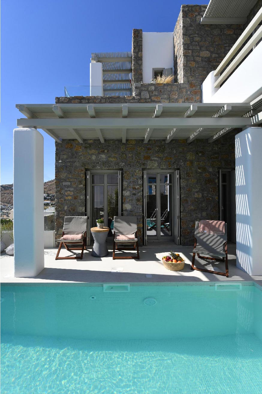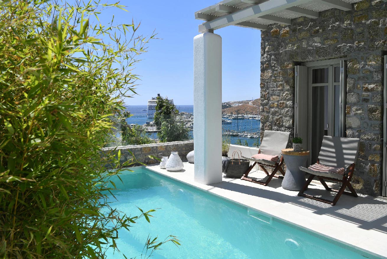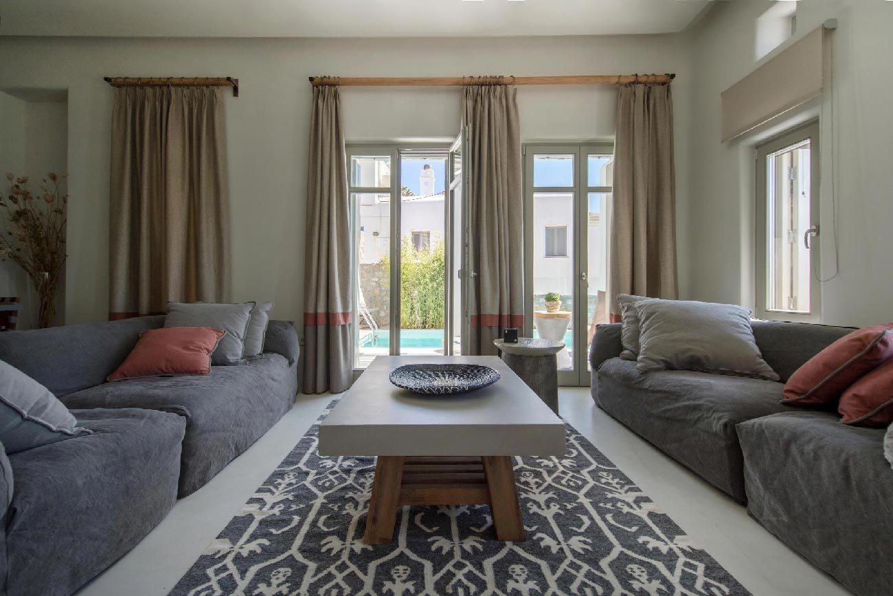 Mykonos. Whether you’re traveling with family or a large group of friends, this villa is the perfect destination. Plus, guests have easy access to an unorganized beach within walking distance.
