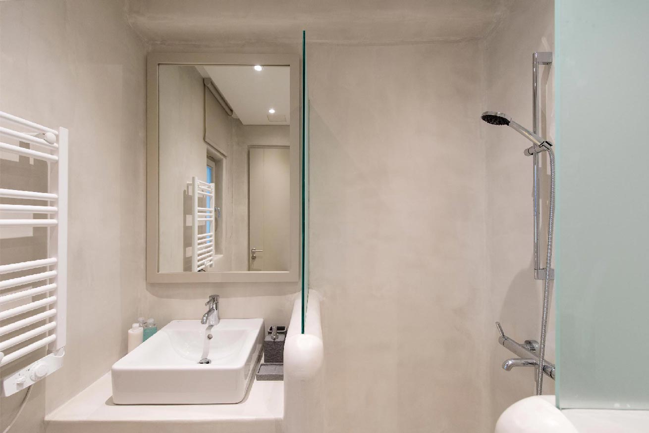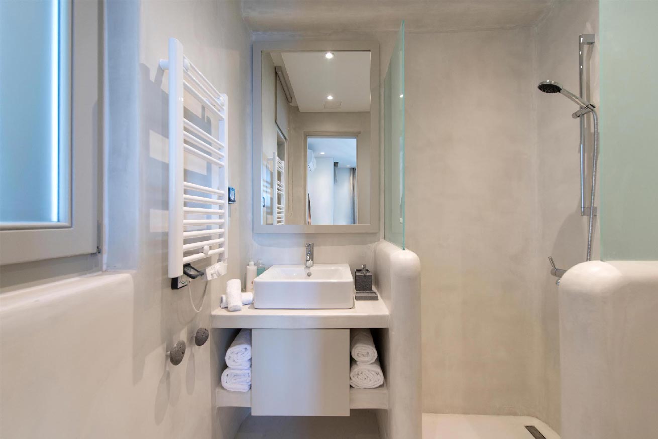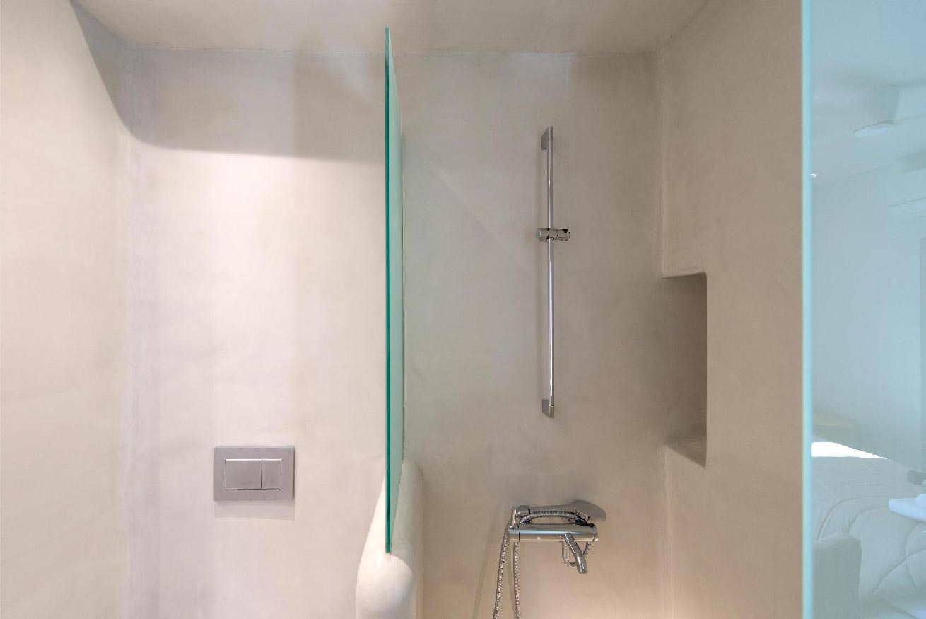 bathroom with shower, access to the pool