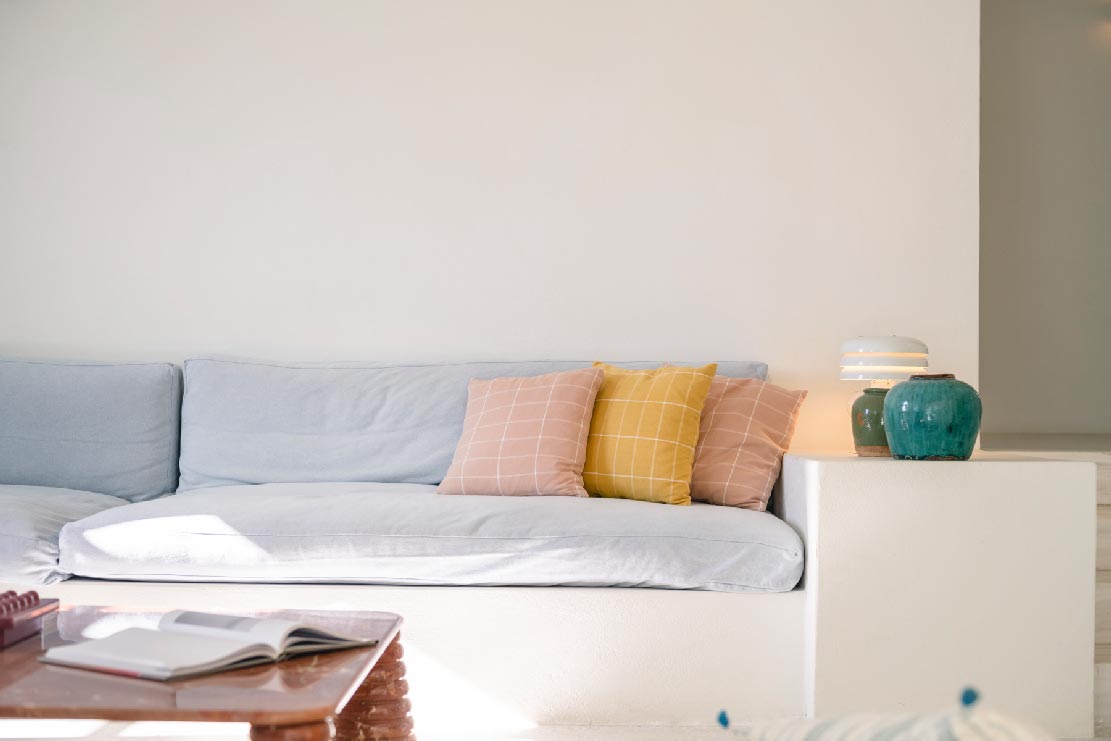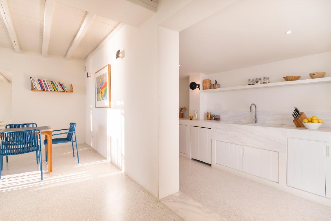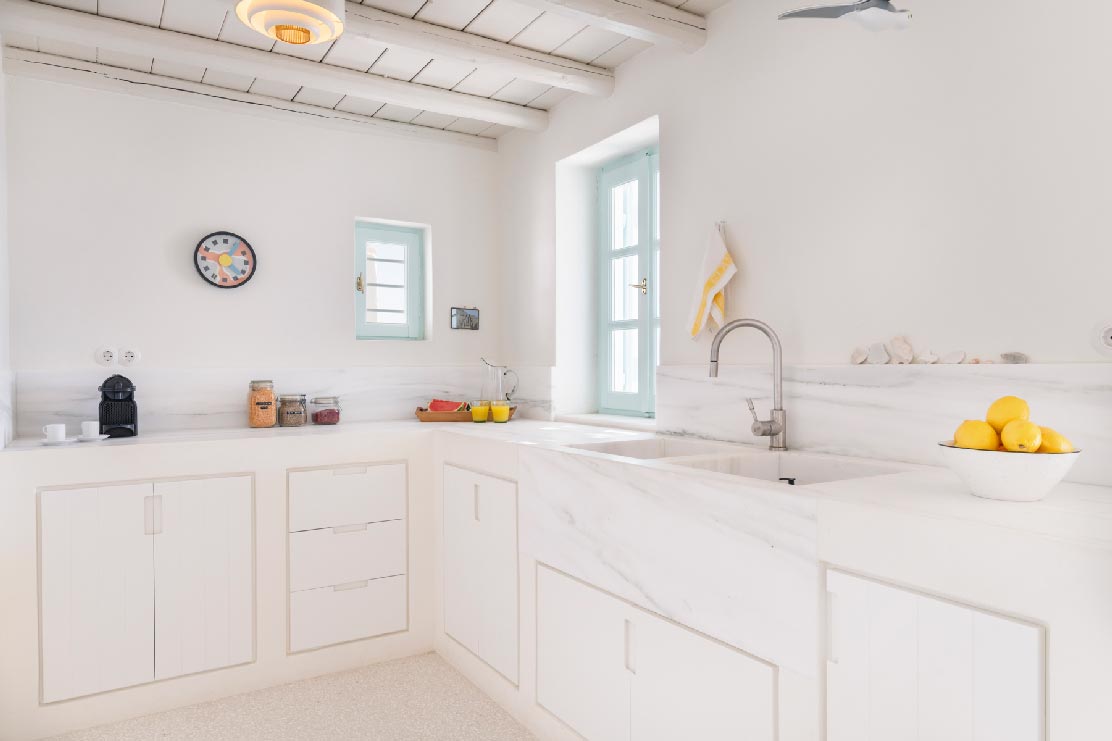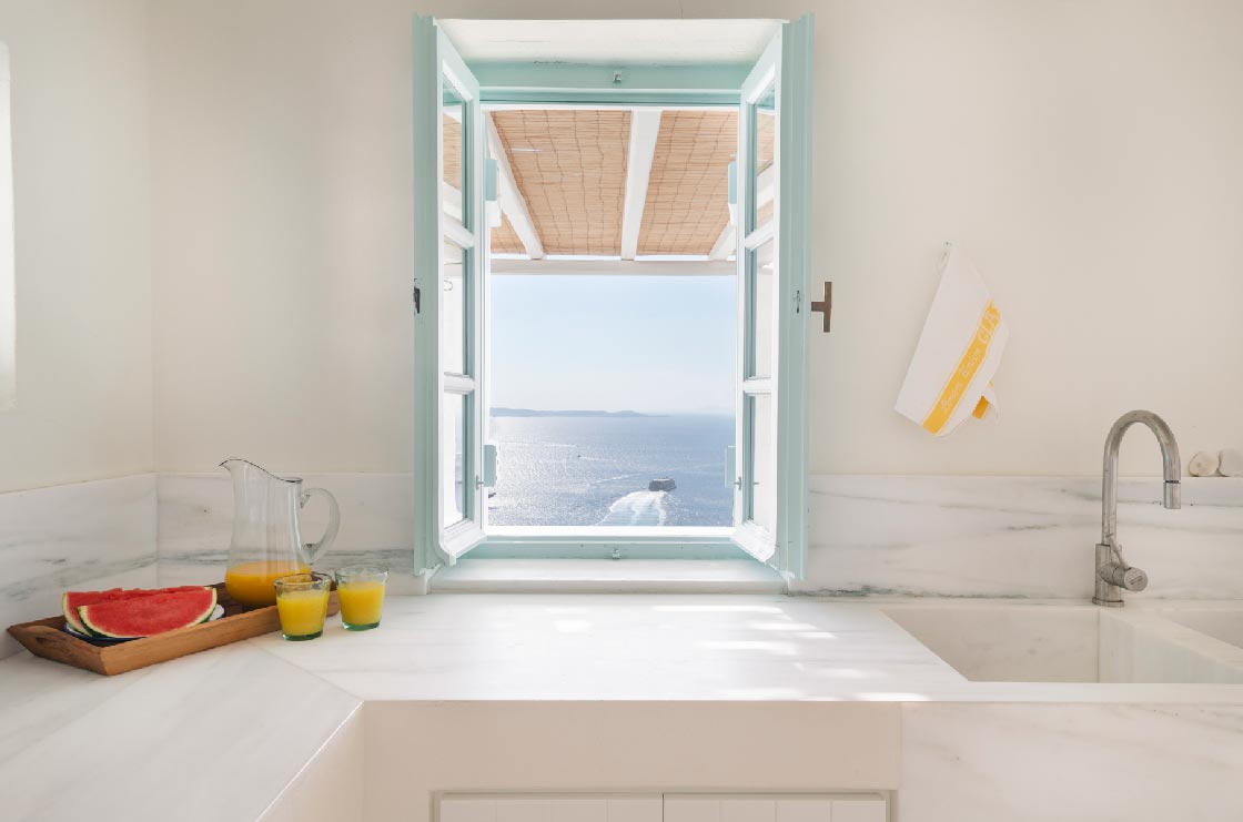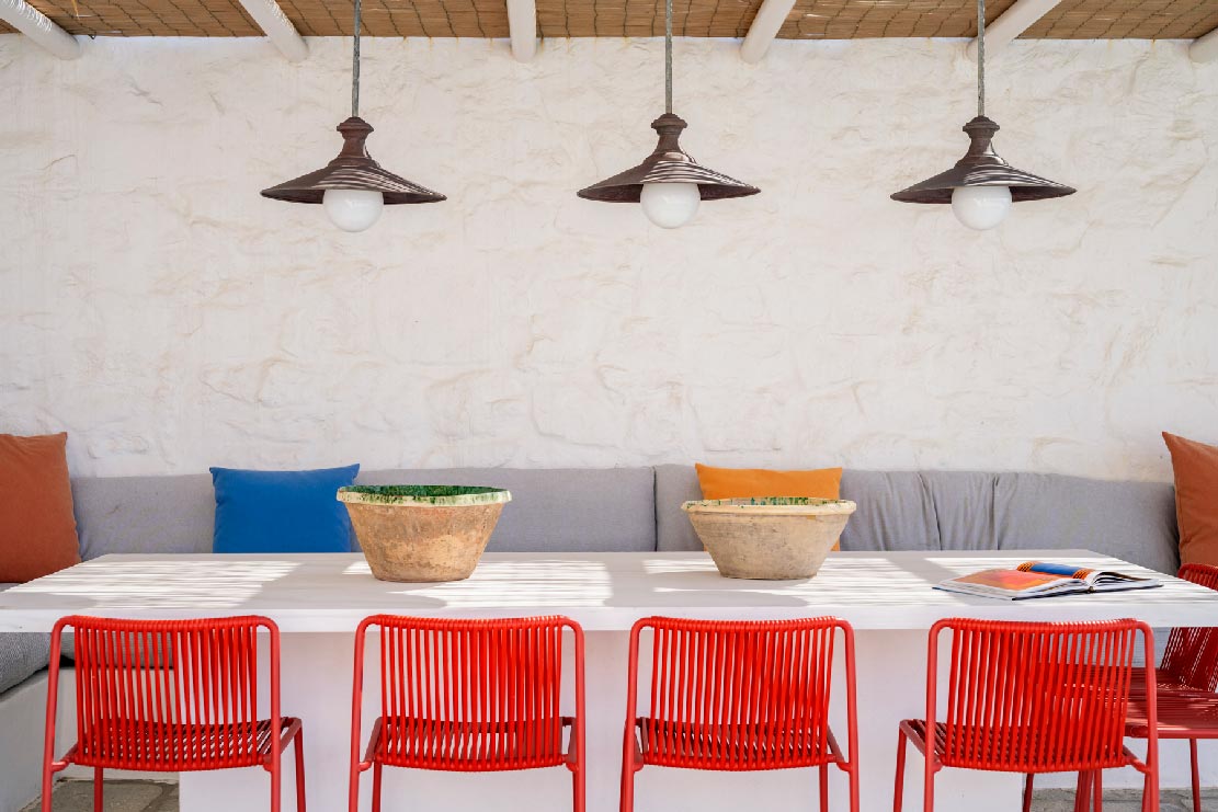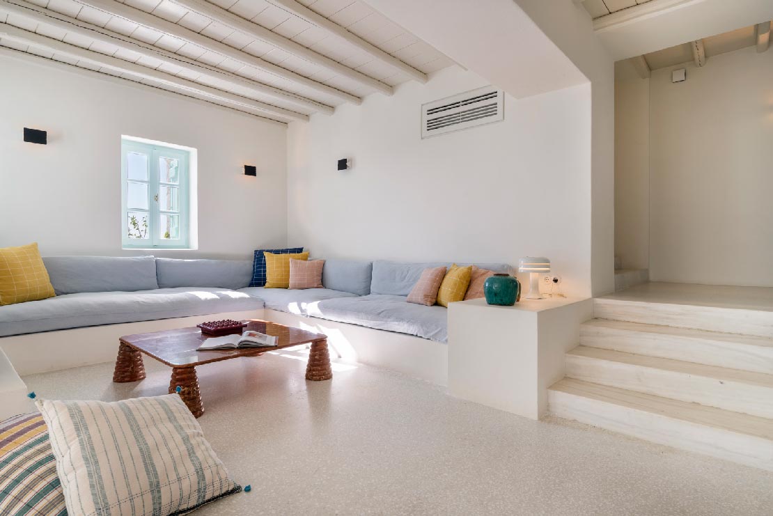 The original 1980’s building has been completely renovated in 2019 and personally decorated by the owners with handpicked design objects, antique furniture, original artworks and modern equipment, in a way that feels casual, laid back and effortless. The villa’s cool interiors feature pristine terrazzo floors throughout, rustic wood-carved doors, traditional ceramic tiles and superior local marble for the bathrooms and kitchen. Outside, a variety of terraces, balconies and niches distributed around the property allow for increased privacy even among a large group of guests. The villa is situated in Agia Sofia, an area that is sought-after for its breathtaking views, increased sense of privacy and close distance to Mykonos town and the entertainment spots on the island.