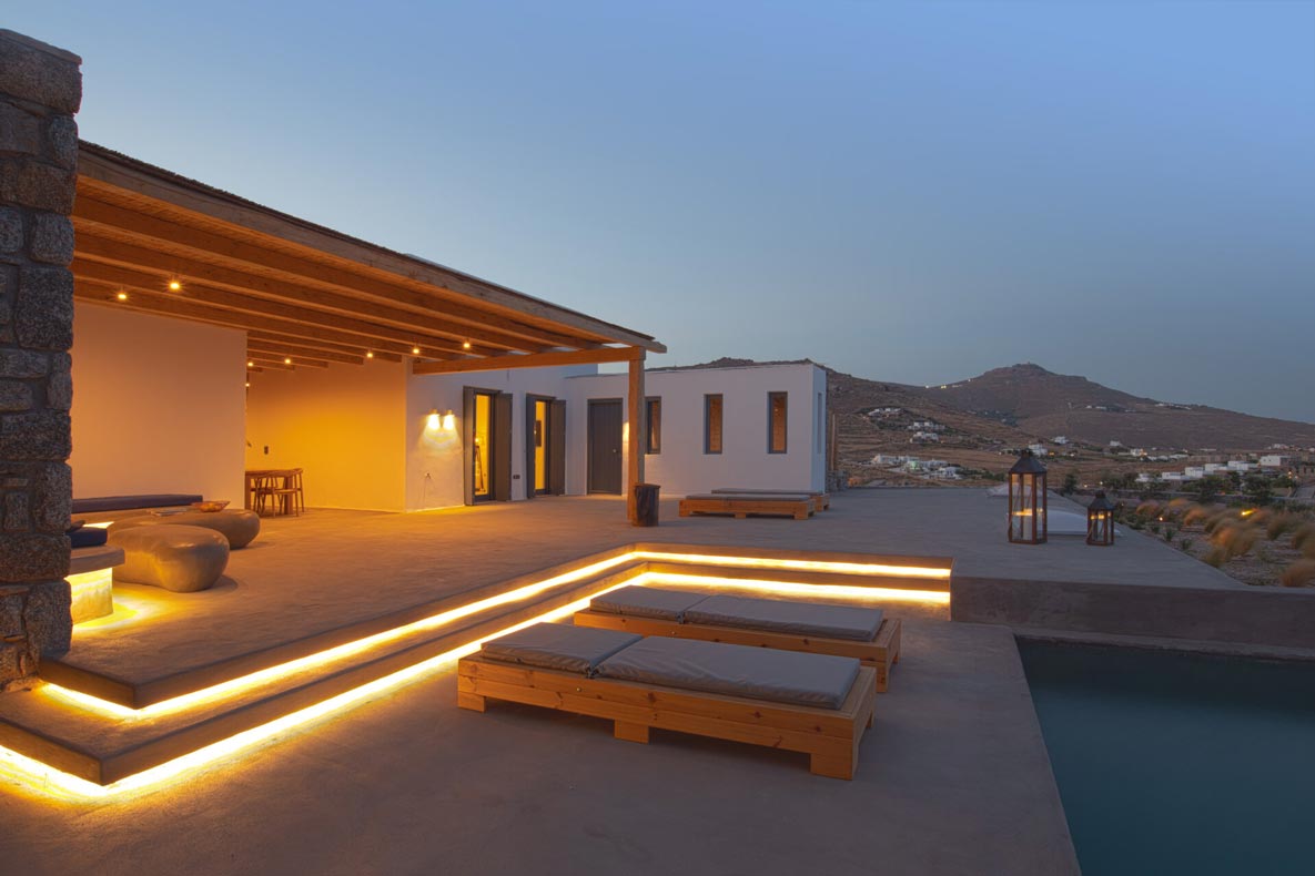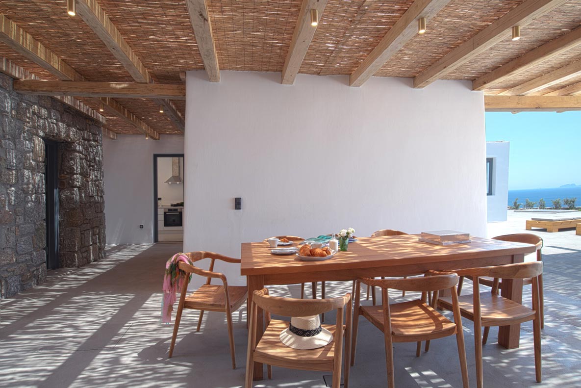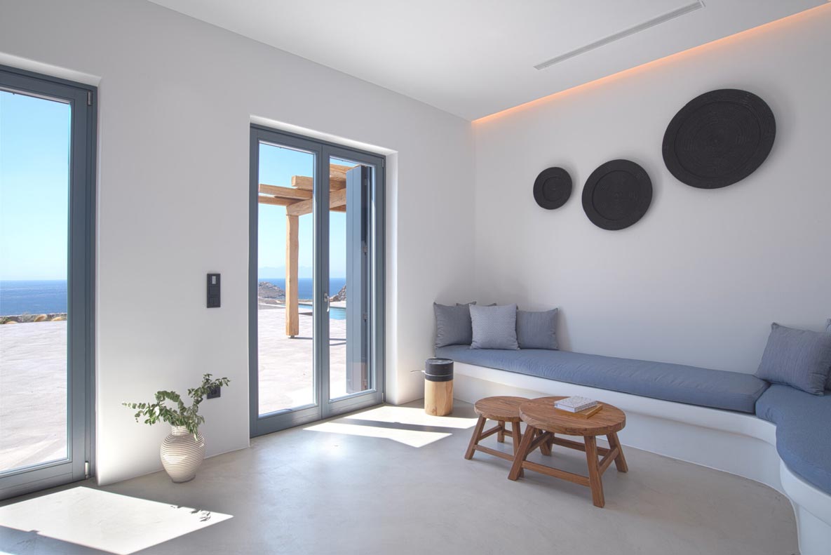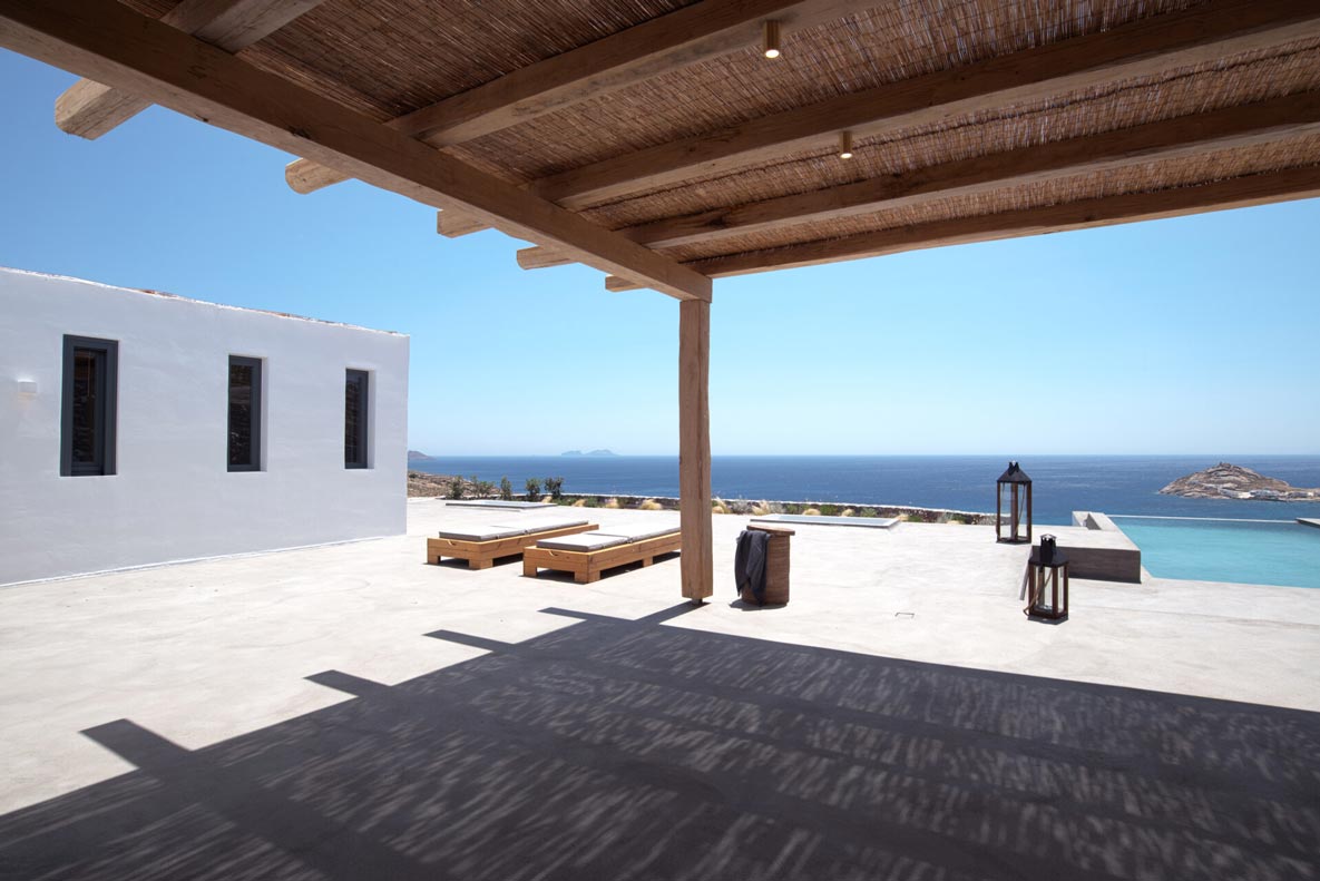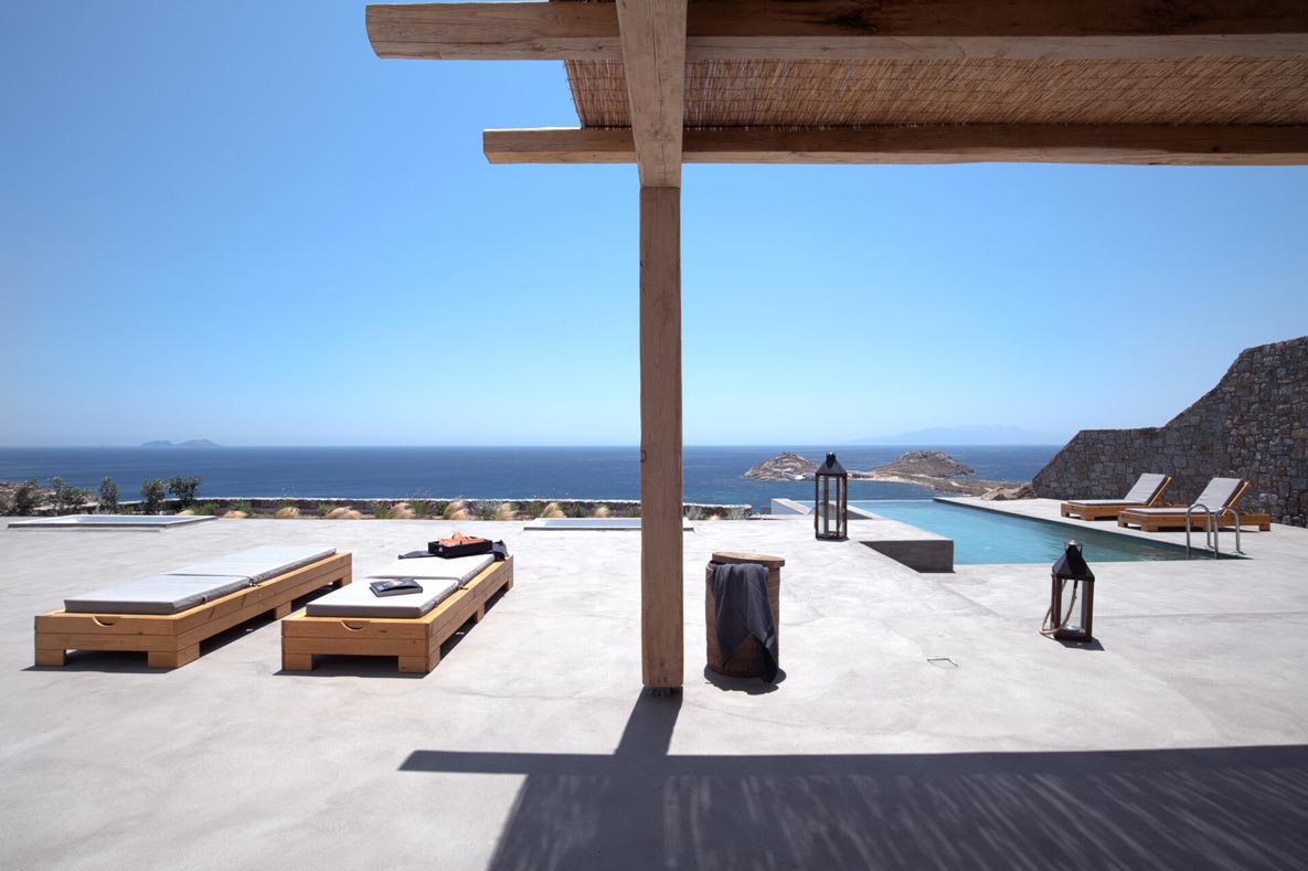 A stunning hillside villa graced with understated elegance: furnished in muted tones, warm woods, and local stone combine for a luxurious but relaxed ambiance. Breakfast in a pergola shaded lounge, indulge in fine dining on the expansive terraces, or float dreamily in your fabulous infinity pool where a cerulean sky invisibly joins the sea. Or perhaps watch Venus rise at sunset while toasting yet another Greek island magical day. Spellbinding, minimalist, über cool, living and sleeping areas overlooking the sun-drenched landscape of Mykonos. This Villa offers complete privacy and seclusion in luxurious comfort for up to 8 guests.