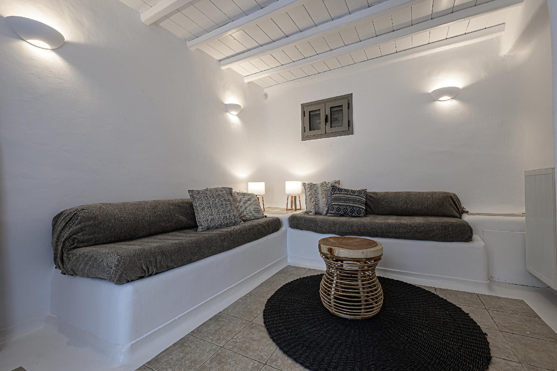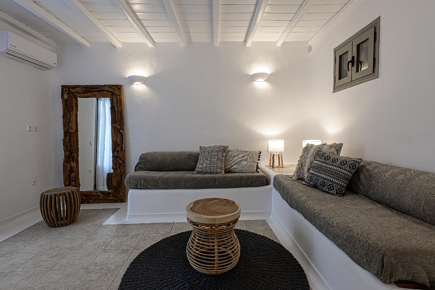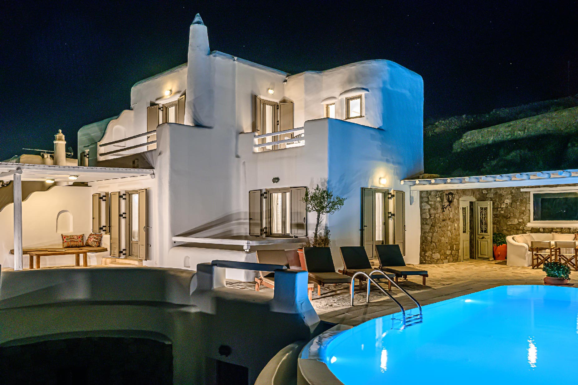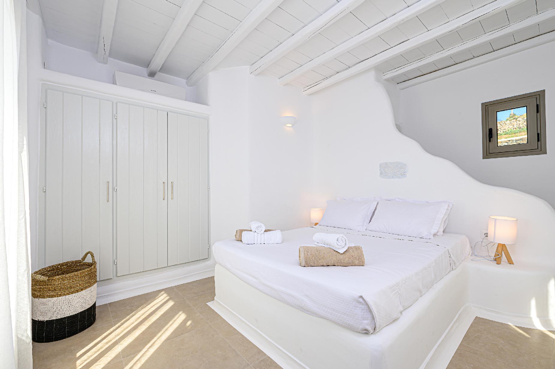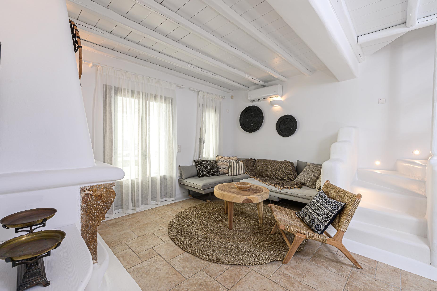 A hillside hideaway in a secluded nearly rural area although close to the town, where you can relax after a long day at the magnificent beaches of the island or a long night in the vivid nightlife. Carved on a hill, 200m from the coast, in an extraordinary setting framed by beautiful countryside, it blends uniquely in the rocky topography of its hillside, prime and unspoiled, setting.Traditional interiors, all in white, perched on a hillside with breath-taking, panoramic views over the Aegean Sea boasting a large open plan living area indoors and outdoors and offering privacy and seclusion in a very idyllic spot.