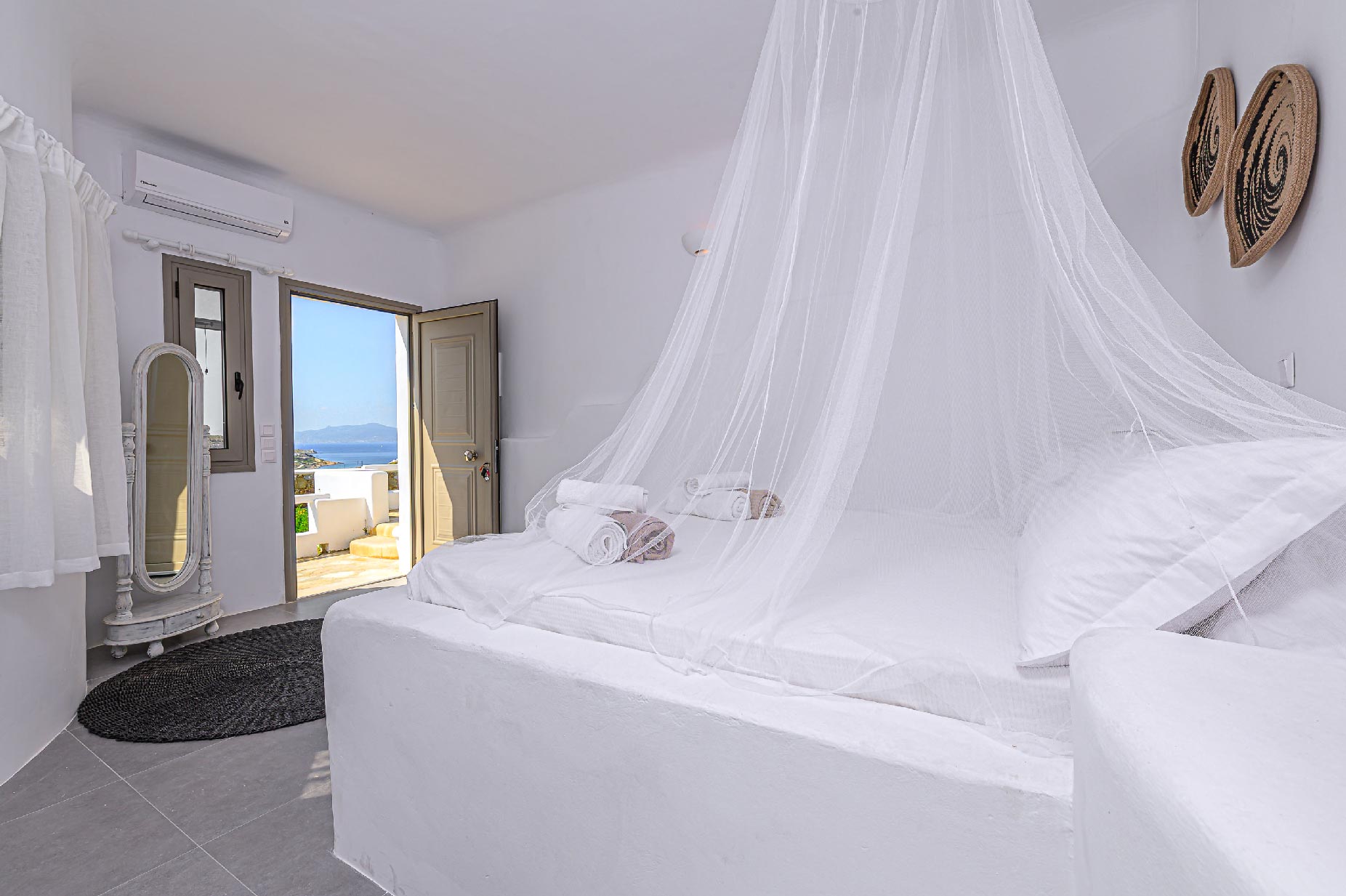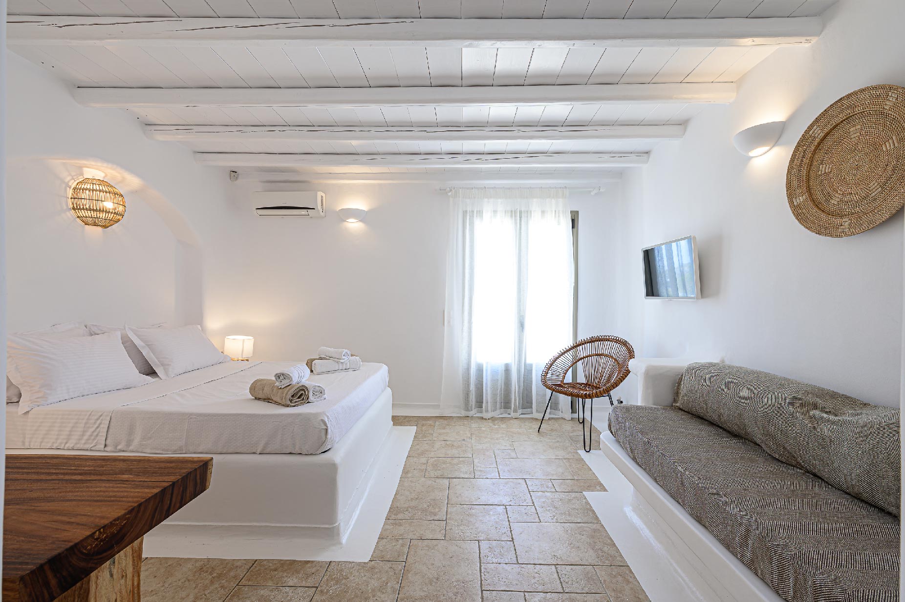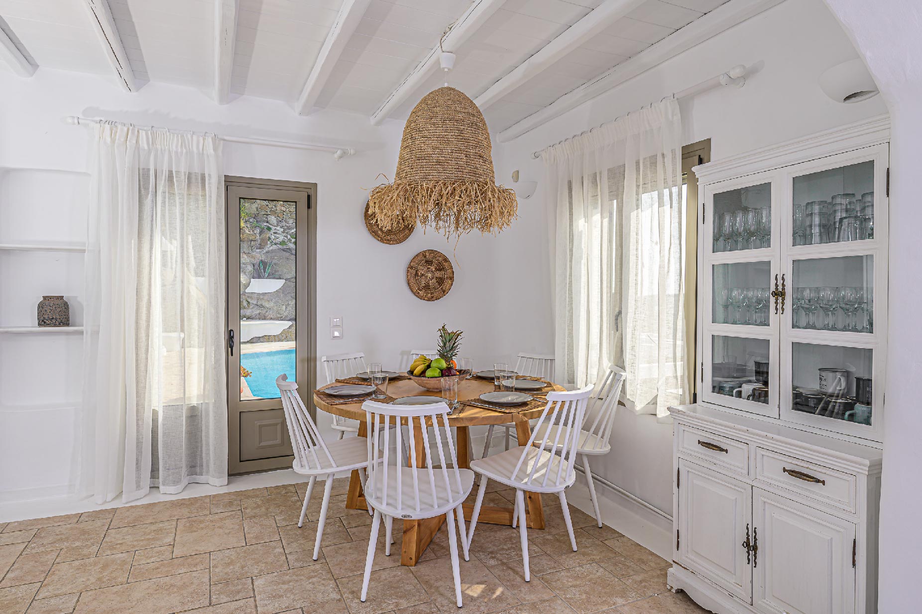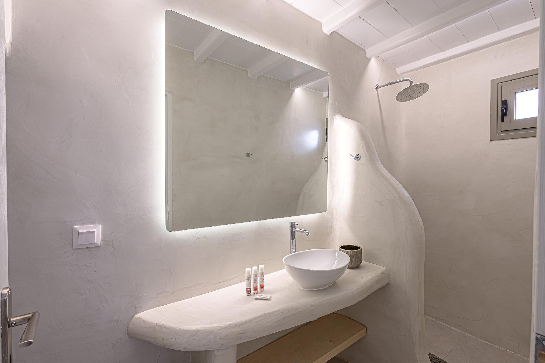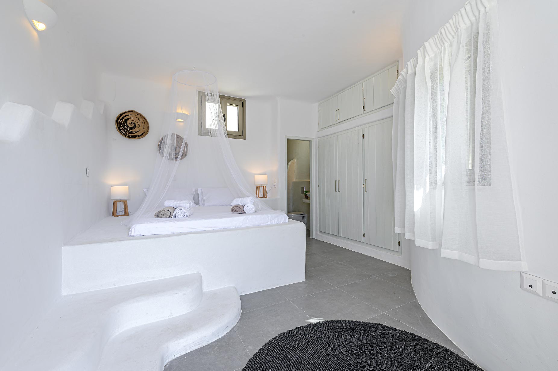 A hillside hideaway in a secluded nearly rural area although close to the town, where you can relax after a long day at the magnificent beaches of the island or a long night in the vivid nightlife. Carved on a hill, 200m from the coast, in an extraordinary setting framed by beautiful countryside, it blends uniquely in the rocky topography of its hillside, prime and unspoiled, setting.Traditional interiors, all in white, perched on a hillside with breath-taking, panoramic views over the Aegean Sea boasting a large open plan living area indoors and outdoors and offering privacy and seclusion in a very idyllic spot.