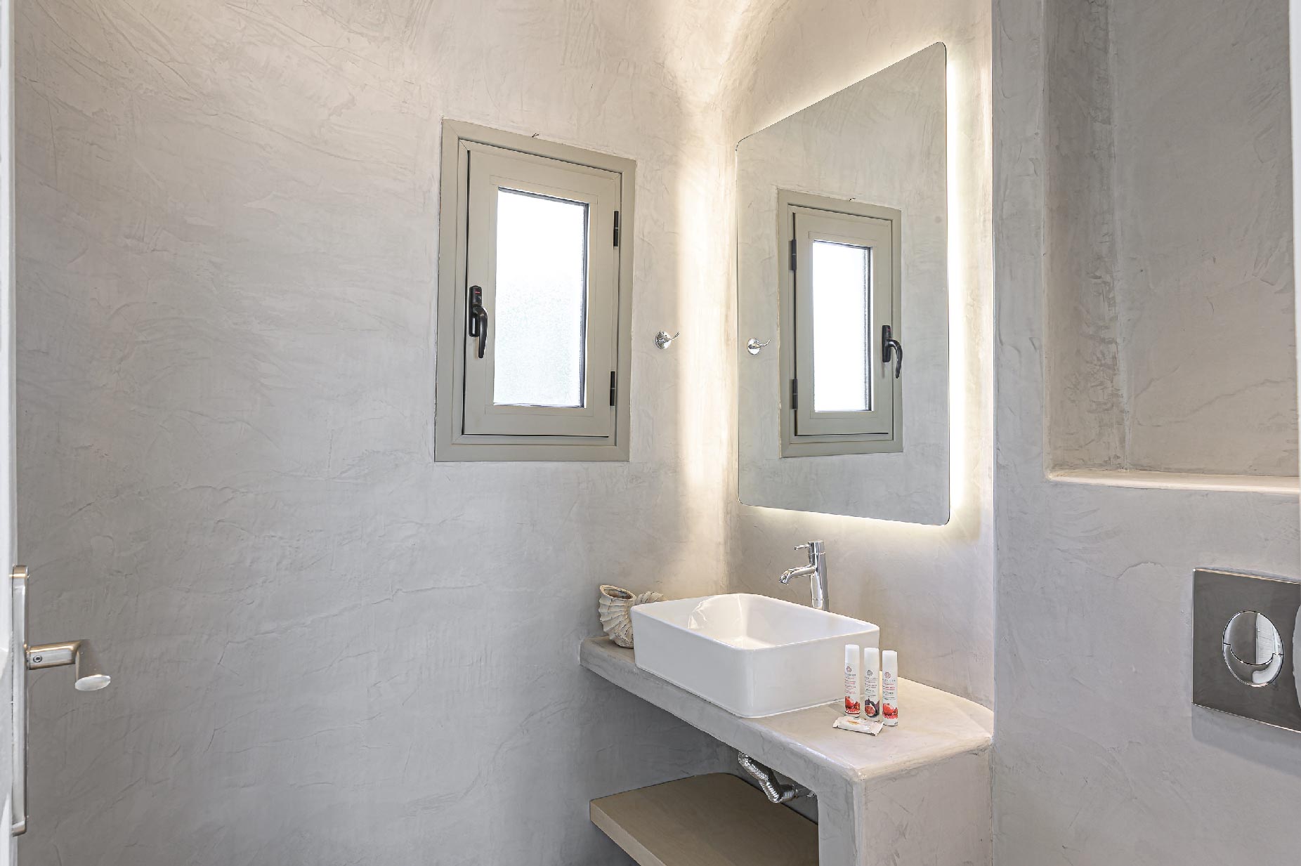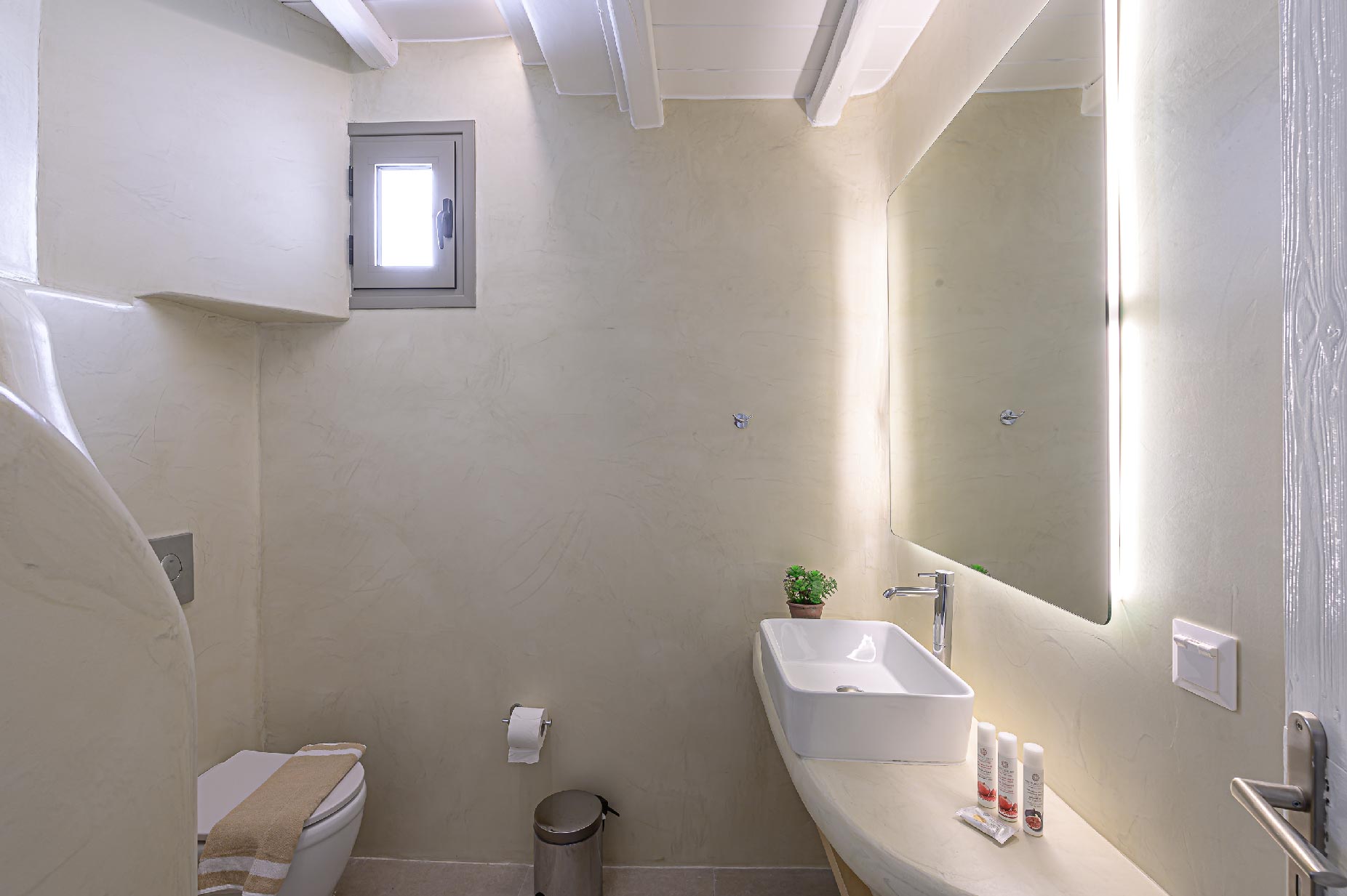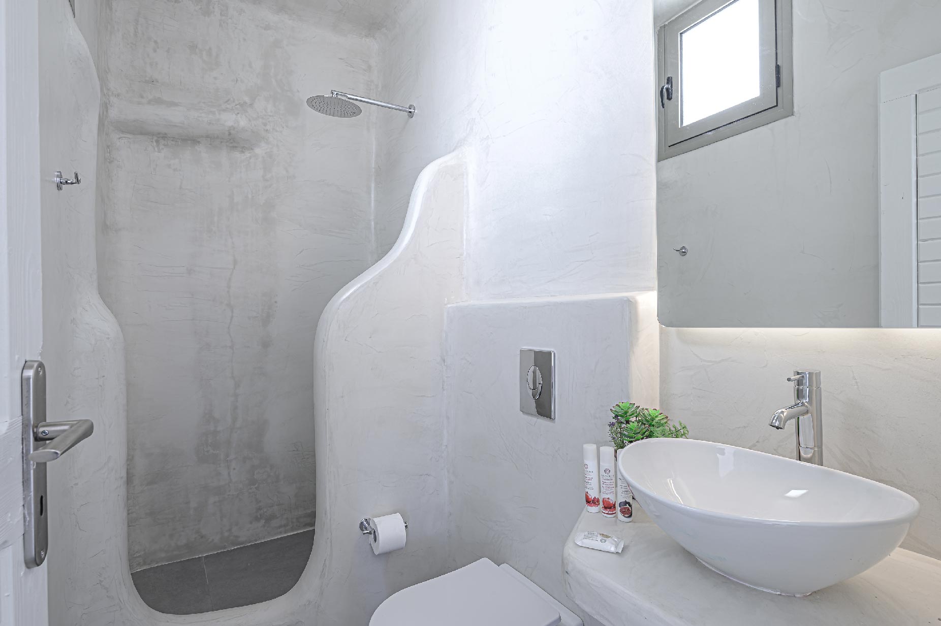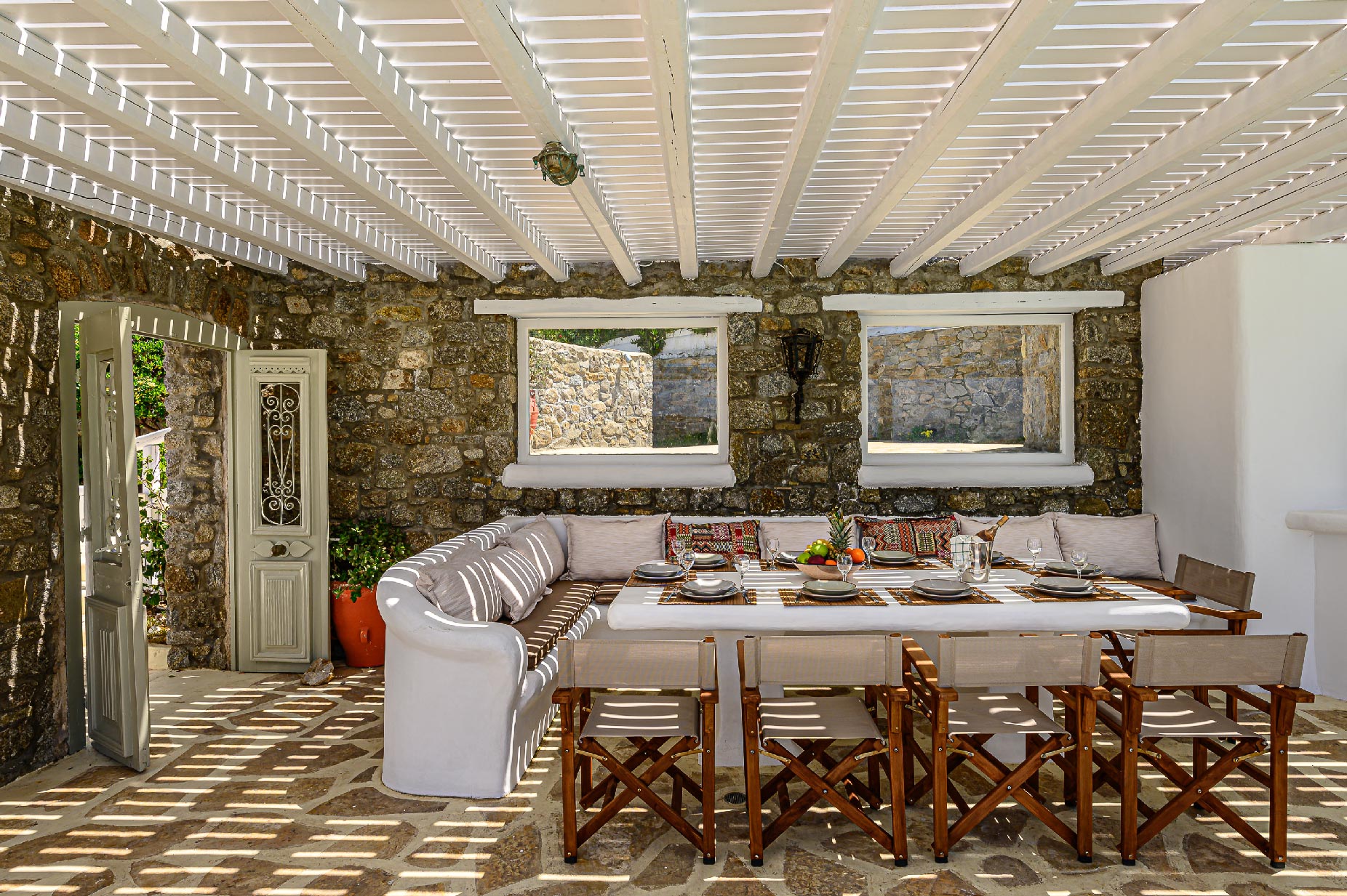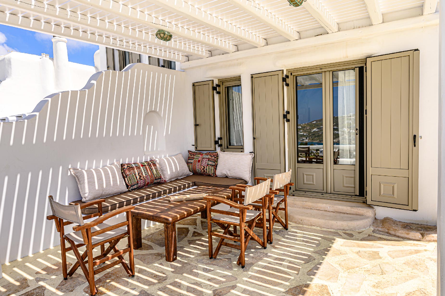 A hillside hideaway in a secluded nearly rural area although close to the town, where you can relax after a long day at the magnificent beaches of the island or a long night in the vivid nightlife. Carved on a hill, 200m from the coast, in an extraordinary setting framed by beautiful countryside, it blends uniquely in the rocky topography of its hillside, prime and unspoiled, setting.Traditional interiors, all in white, perched on a hillside with breath-taking, panoramic views over the Aegean Sea boasting a large open plan living area indoors and outdoors and offering privacy and seclusion in a very idyllic spot.