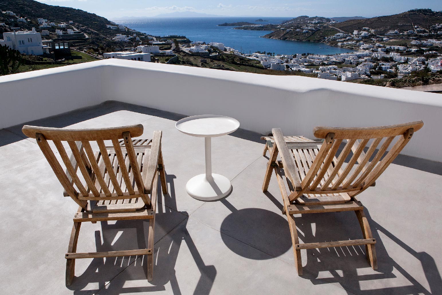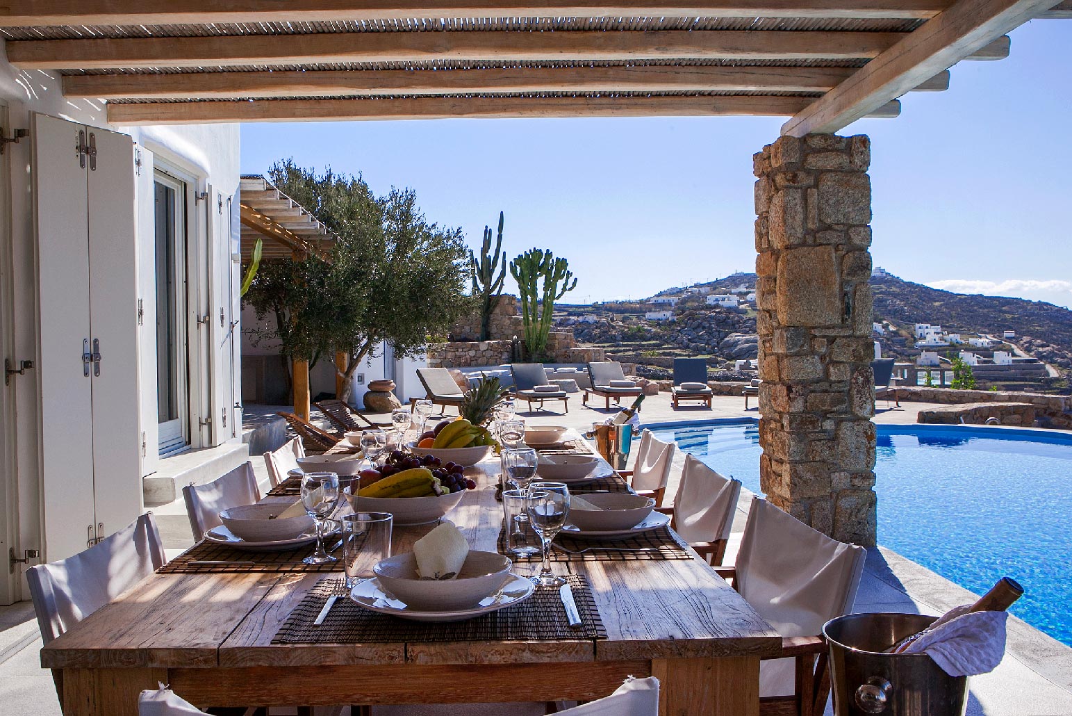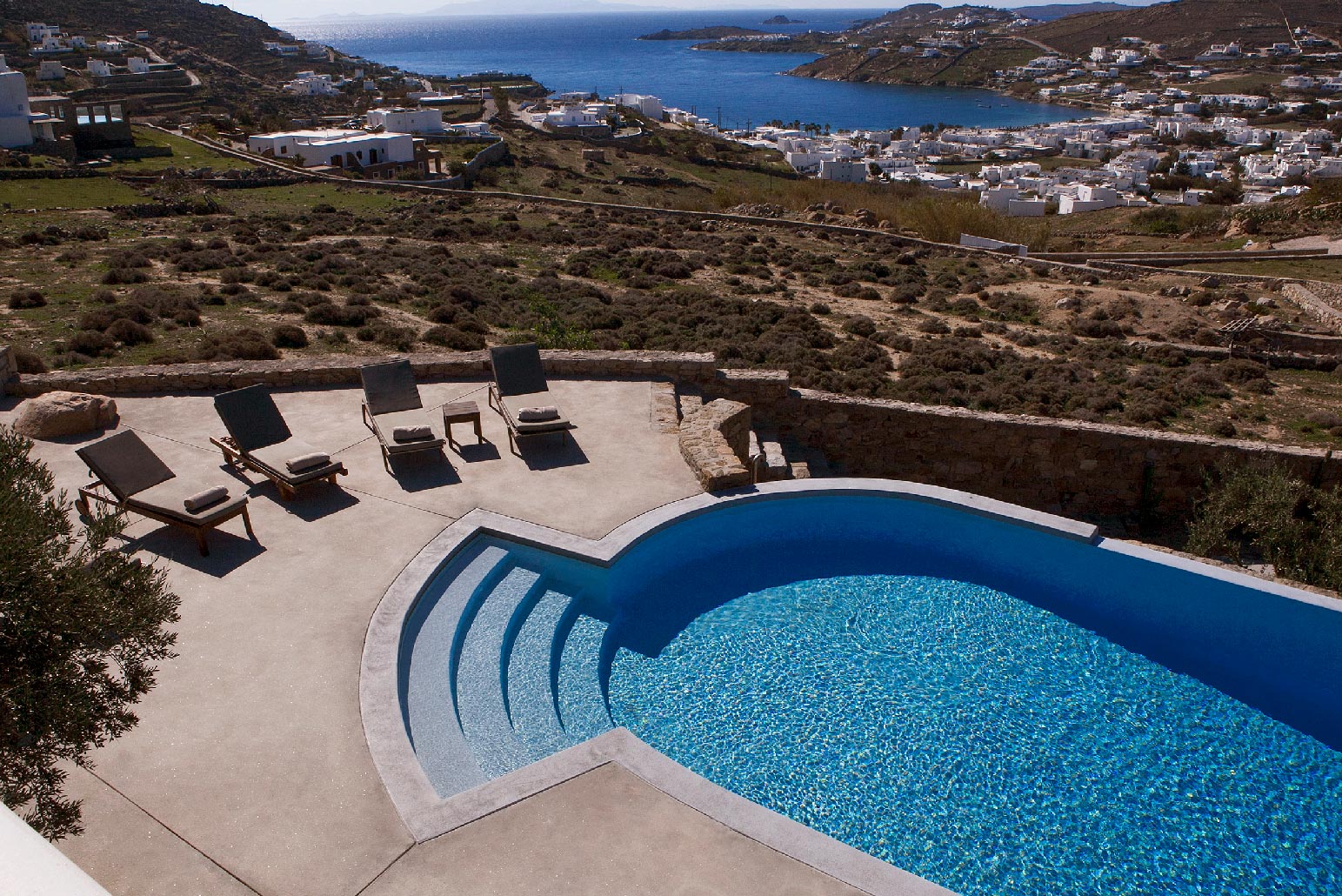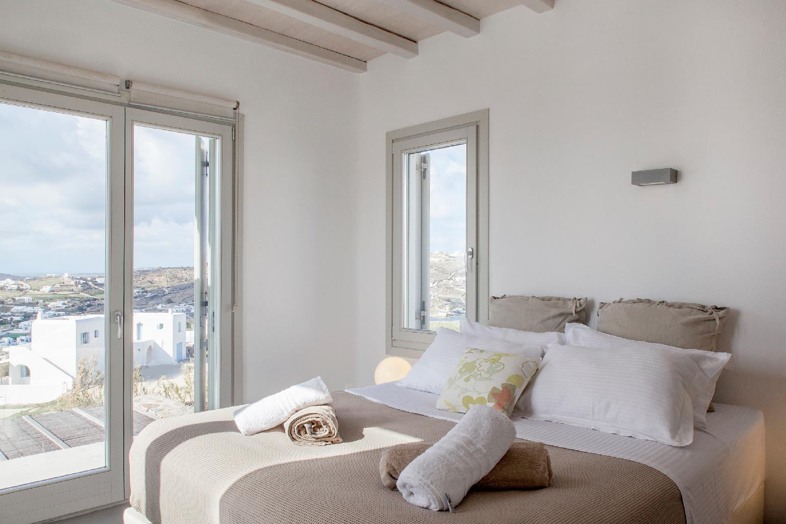 Modern decor combines with traditional architecture for a luxurious Greek holiday. Swim and relax during the day, party and enjoy the lights in the evening. Four spacious bedrooms accommodate up to 10 people in commodious style.Indoor and outdoor luxury is foremost in these villas to delight in Mykonos style. The grand covered outdoor terrace commands a spectacular view which you can enjoy seated in the outdoor dining area or conversation in the comfortable outdoor living area. Inside, enjoy casual snacks or morning coffee at the breakfast table next to the modern kitchen. Fully equipped, the kitchen has everything you need to prepare a feast for your guests. The indoor dining area and living room are open and spacious with windows and doors which open to the view.