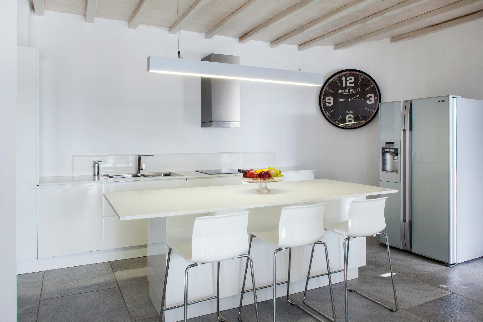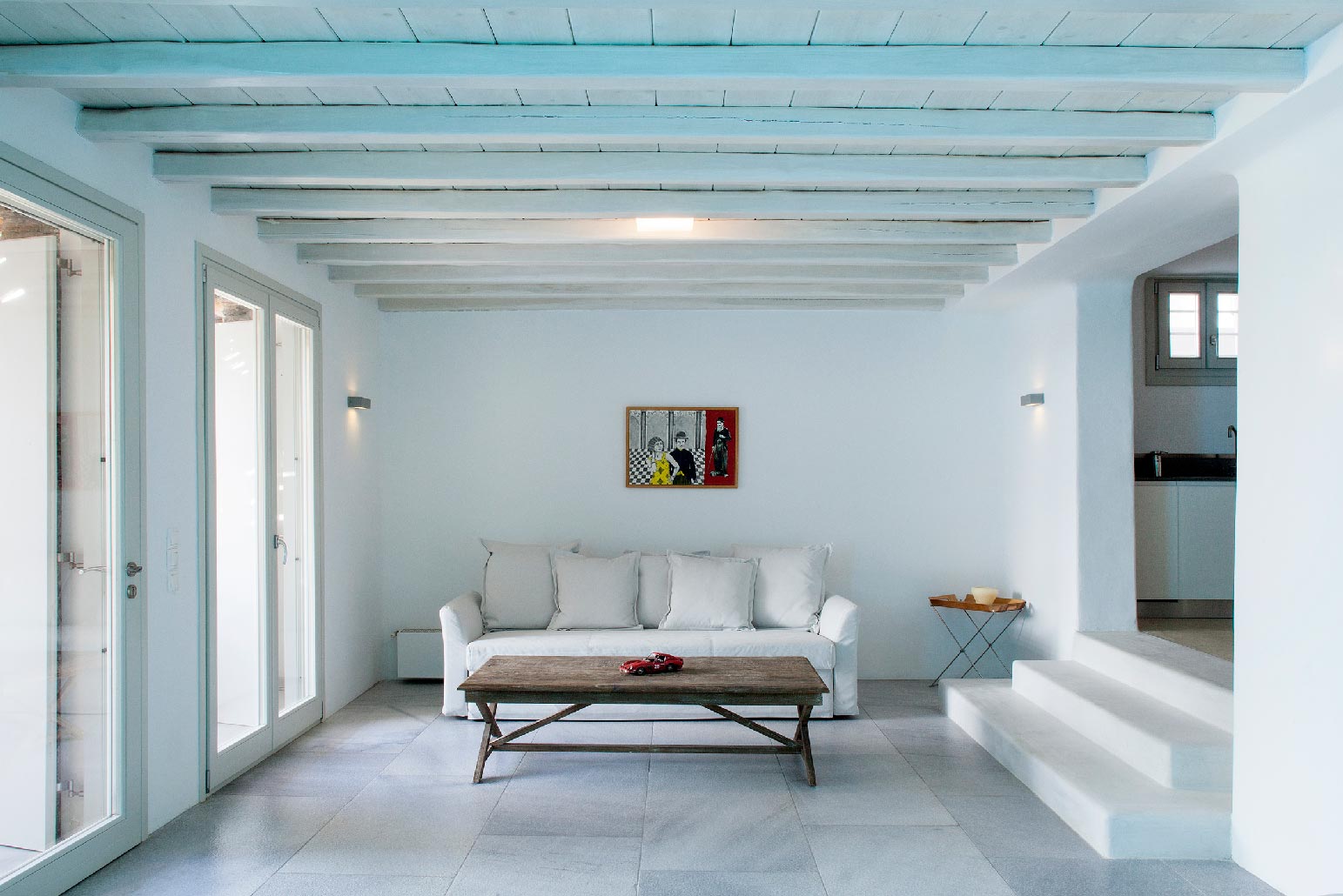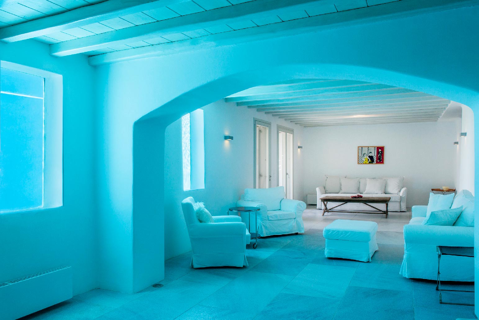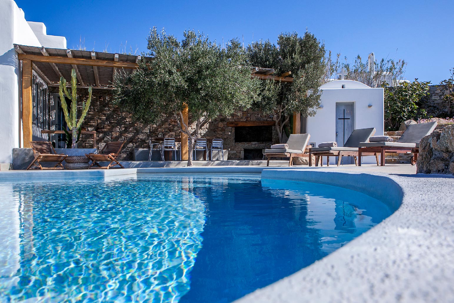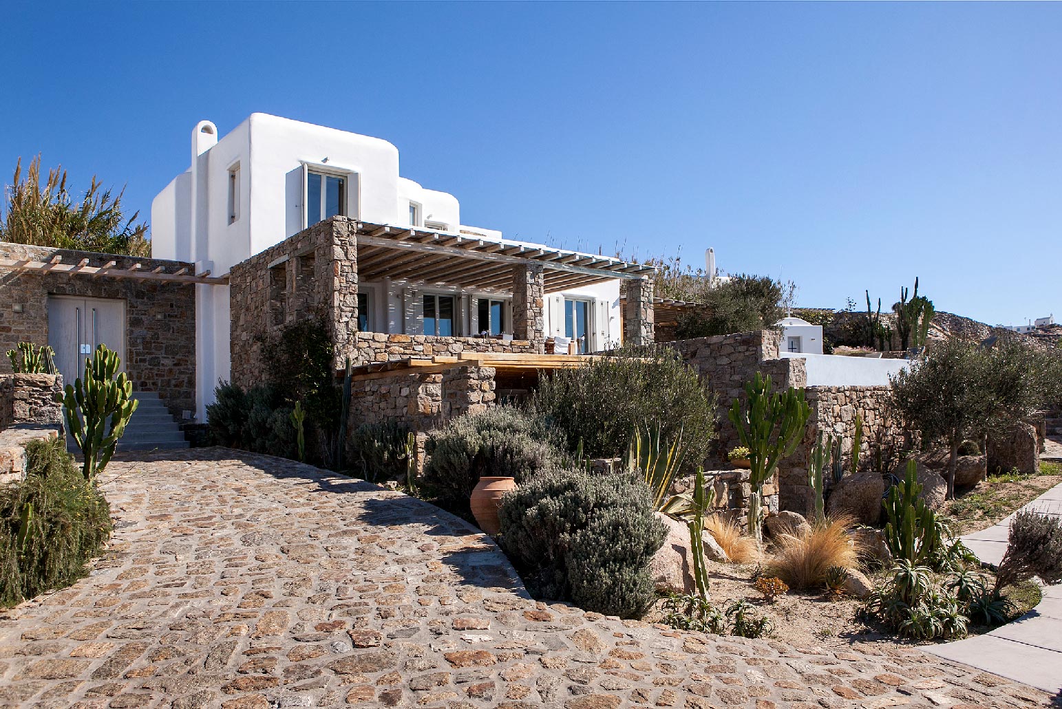 Modern decor combines with traditional architecture for a luxurious Greek holiday. Swim and relax during the day, party and enjoy the lights in the evening. Four spacious bedrooms accommodate up to 10 people in commodious style.Indoor and outdoor luxury is foremost in these villas to delight in Mykonos style. The grand covered outdoor terrace commands a spectacular view which you can enjoy seated in the outdoor dining area or conversation in the comfortable outdoor living area. Inside, enjoy casual snacks or morning coffee at the breakfast table next to the modern kitchen. Fully equipped, the kitchen has everything you need to prepare a feast for your guests. The indoor dining area and living room are open and spacious with windows and doors which open to the view.