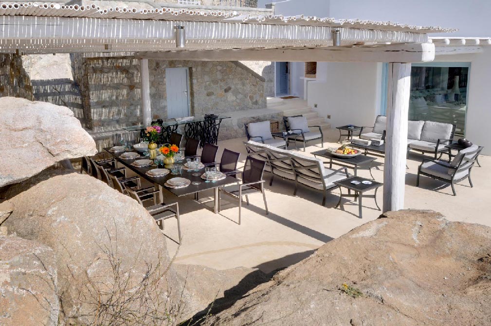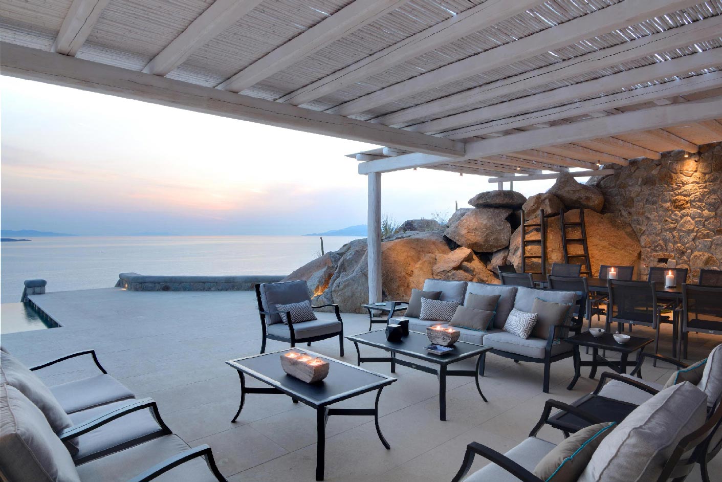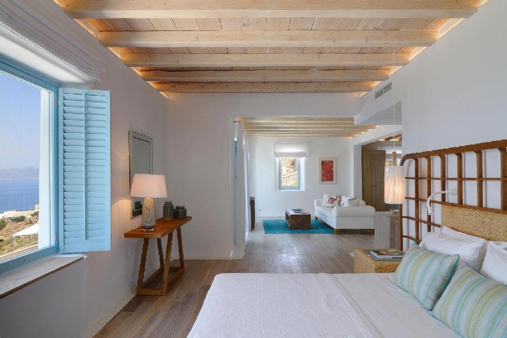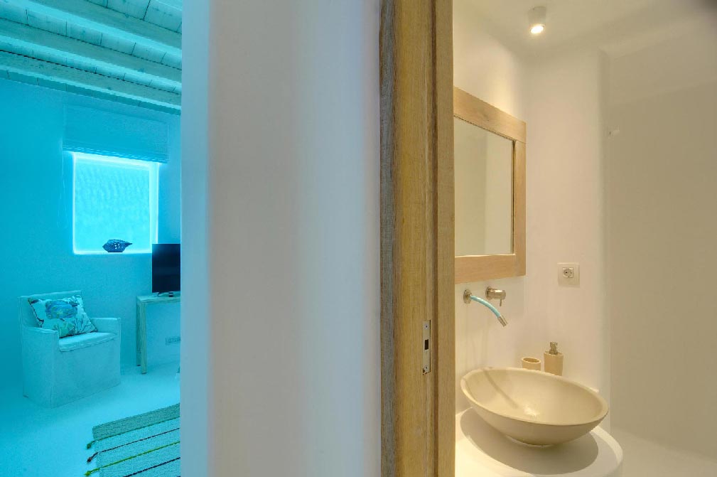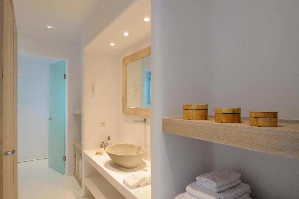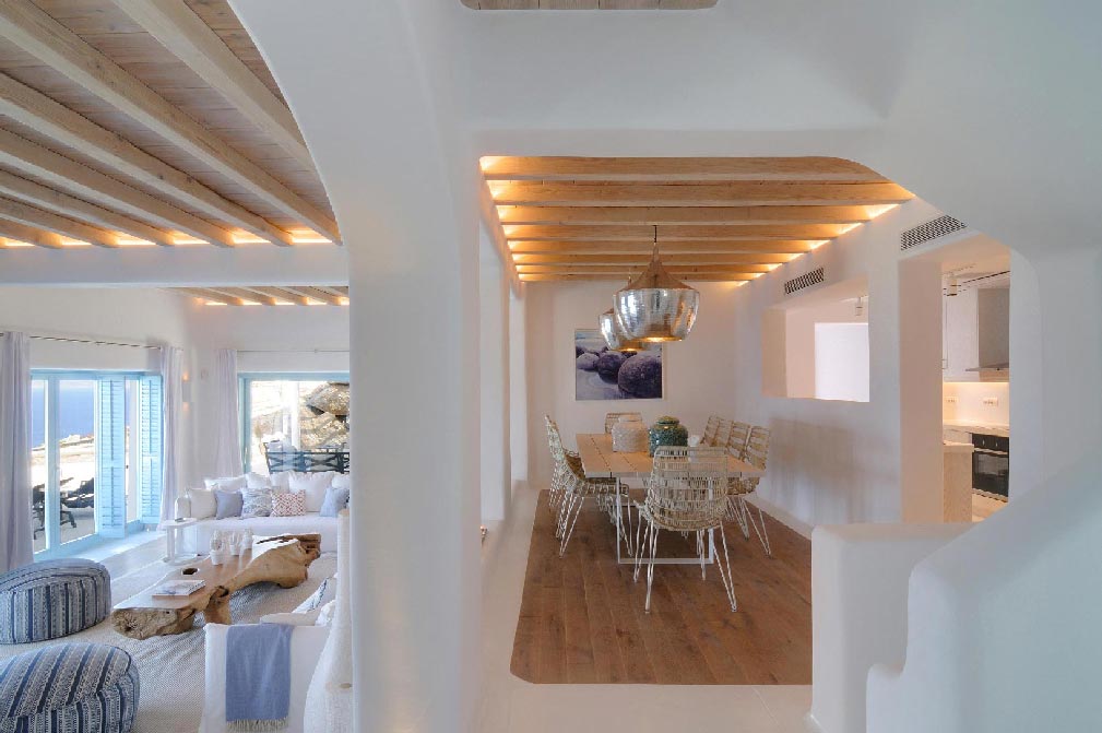 A stunning balance of Cycladic minimalism, marvelous sunset views and elegantly curated interiors combine to create the island home of your dreams. Modern Cycladic architecture is exemplified in the home’s white stucco and stone construction. The exterior lounge and pool areas, with a marvelous, unobstructed sunset view of the islands of Delos and Rhenia, offer a calming one-of-a-kind feeling.Experience evenings you’ll never forget. As the sun begins to set on the horizon, your white Mykonos home becomes washed with shades of pale pink and highlighted with the glow of small lights.The interiors follow the white minimalist Mediterranean style of the Cyclades: white surfaces, arches and washed wood. All bedrooms are decorated with soft luxurious fabrics, while the bathrooms are modern and fully equipped.